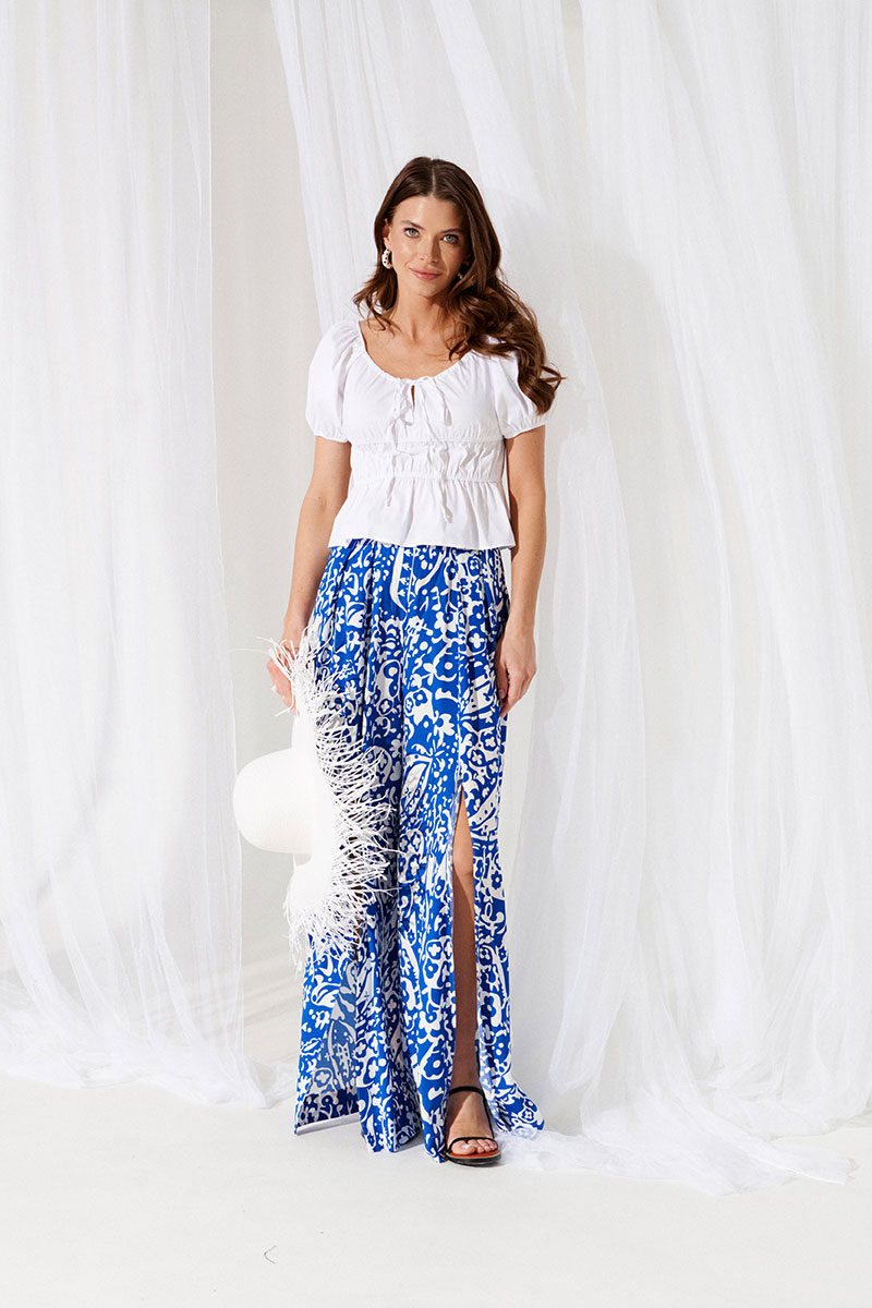 Блузка приталенного силуэта с открытыми плечами, с втачным коротким рукавом, длиной ниже линии талии. Перед и спинка отрезные, швы присборены на резинку. В верхней части переда средний шов с разрезом. Горловина обработана кулиской со шнурком. Окат и низ рукава прострочены эластичной тесьмой.