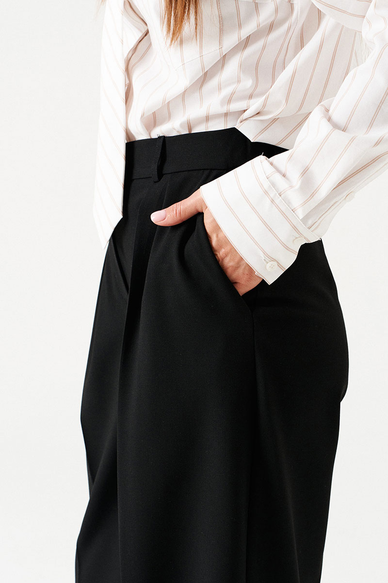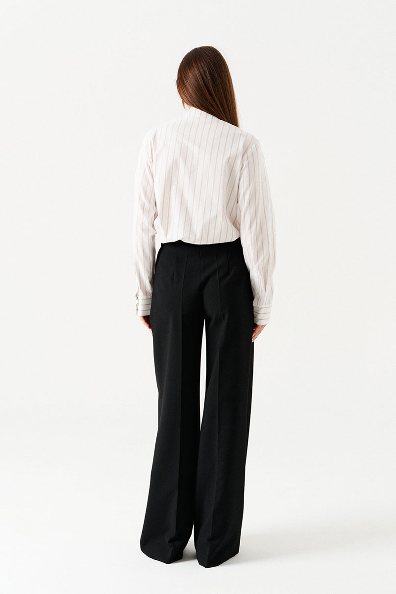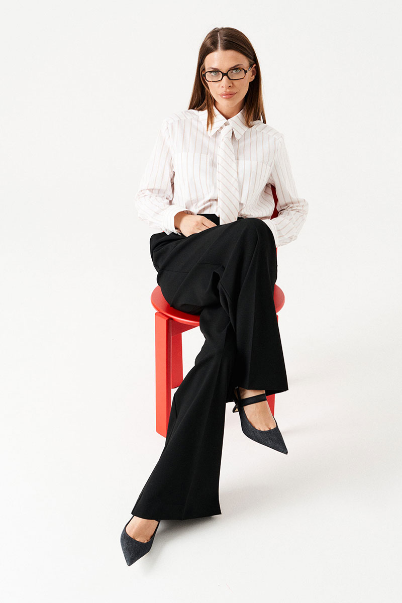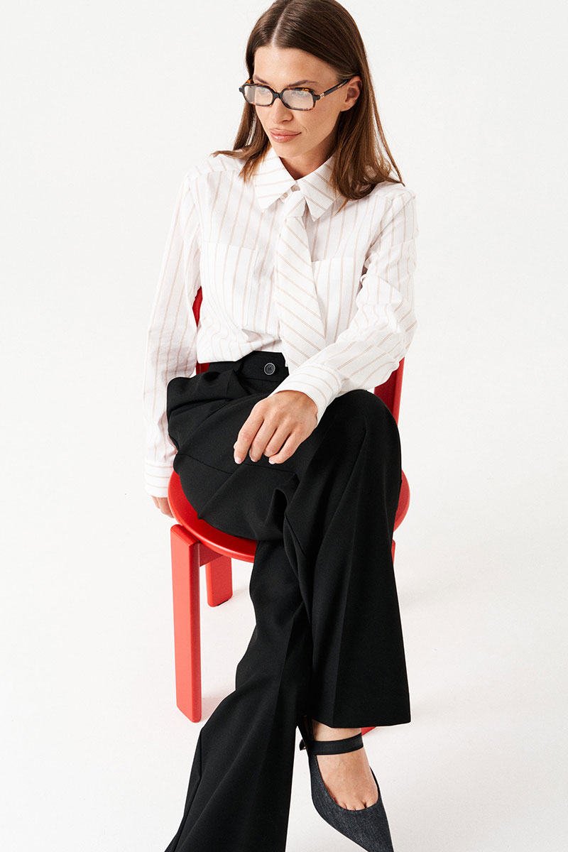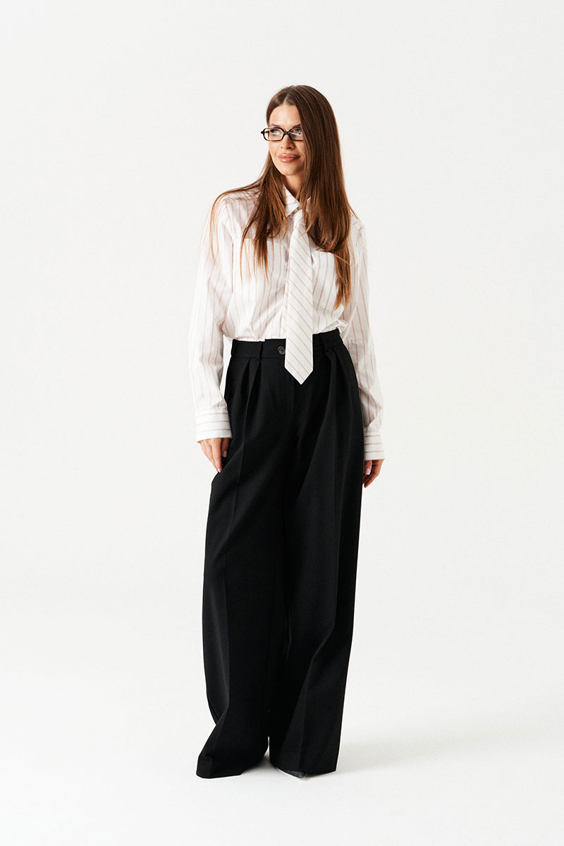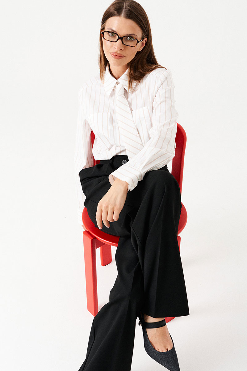 Блузка-рубашка прямая, свободная, с центральной застежкой на петли и пуговицы. Воротник рубашечный, отложной, на притачной стойке. По полочкам в верхней части – симметричные накладные карманы. Спинка цельная. Боковые швы заканчиваются разрезом. Рукав втачной, длинный, с отрезной манжетой, застежкой на петли и пуговицы. В комплекте съемный галстук.