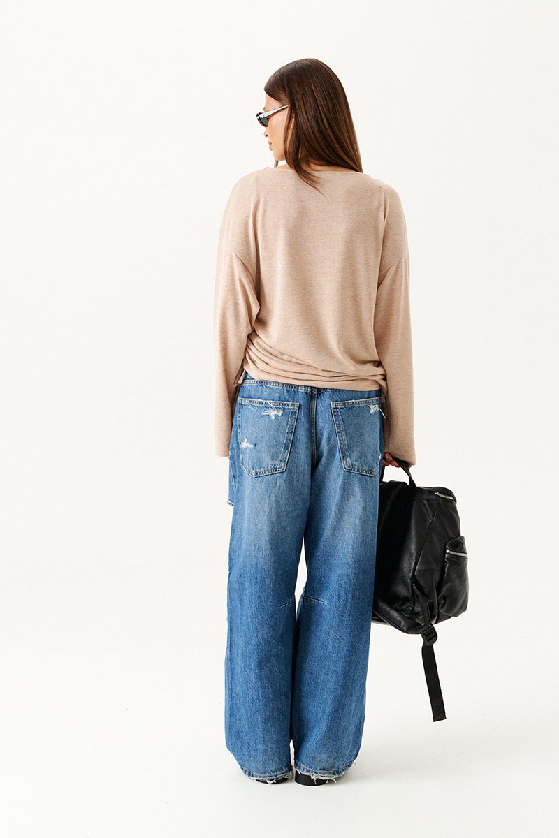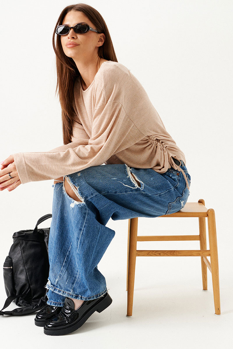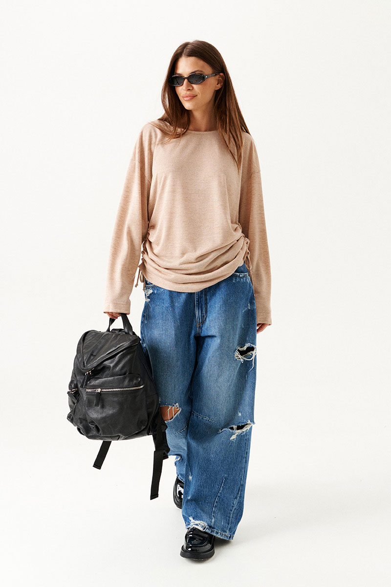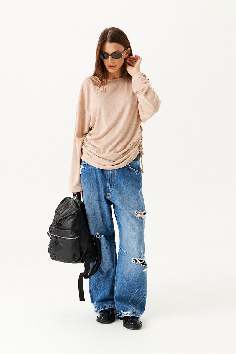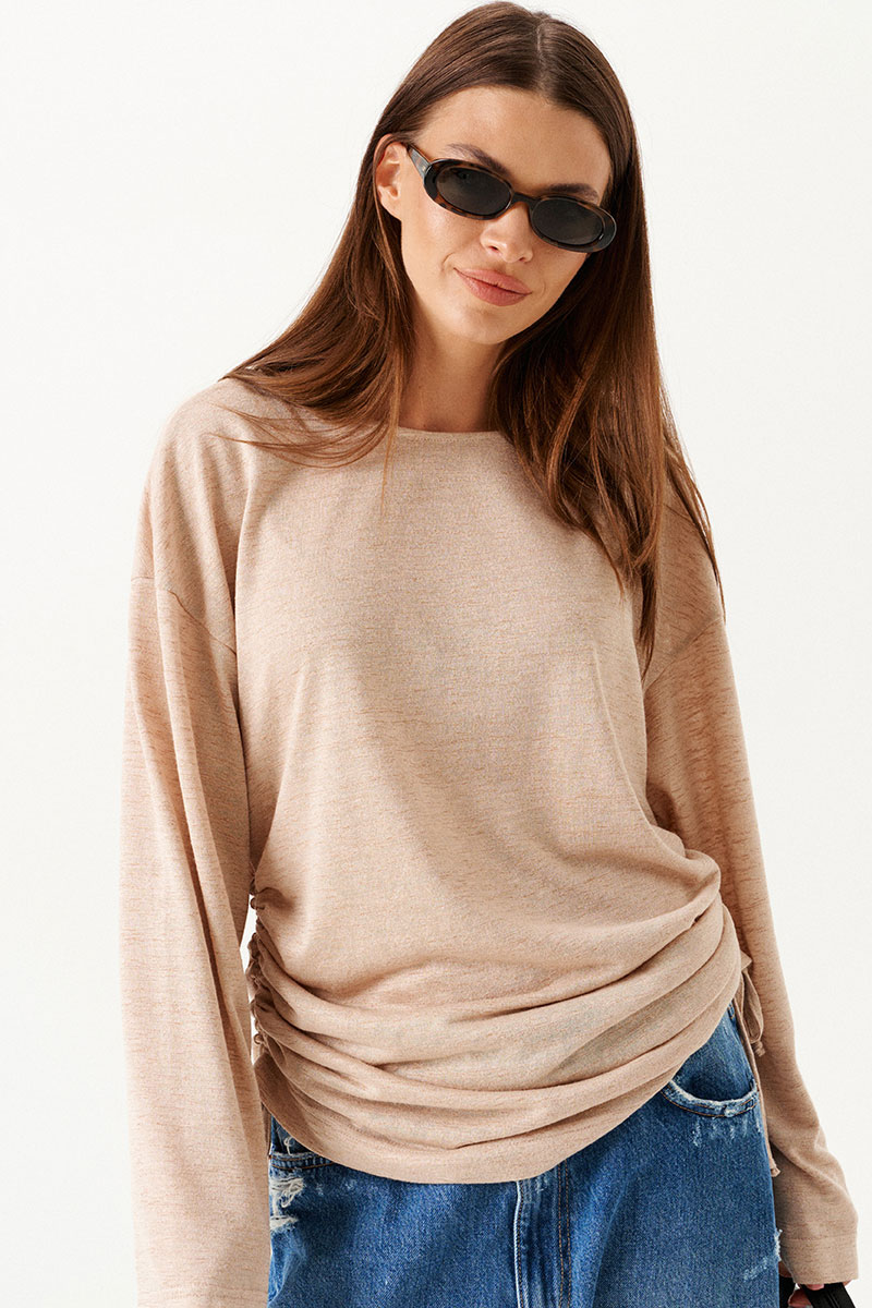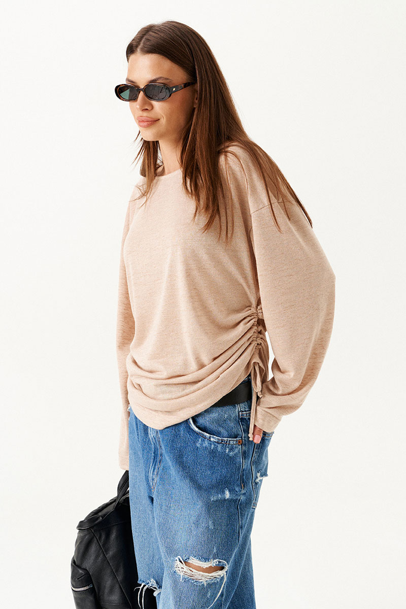 Джемпер из трикотажного полотна, прямого силуэта, свободный. Вырез горловины в форме "лодочка". В боковых швах кулиса со шнуром-завязкой. Рукав длинный, втачной, одношовный, широкий.