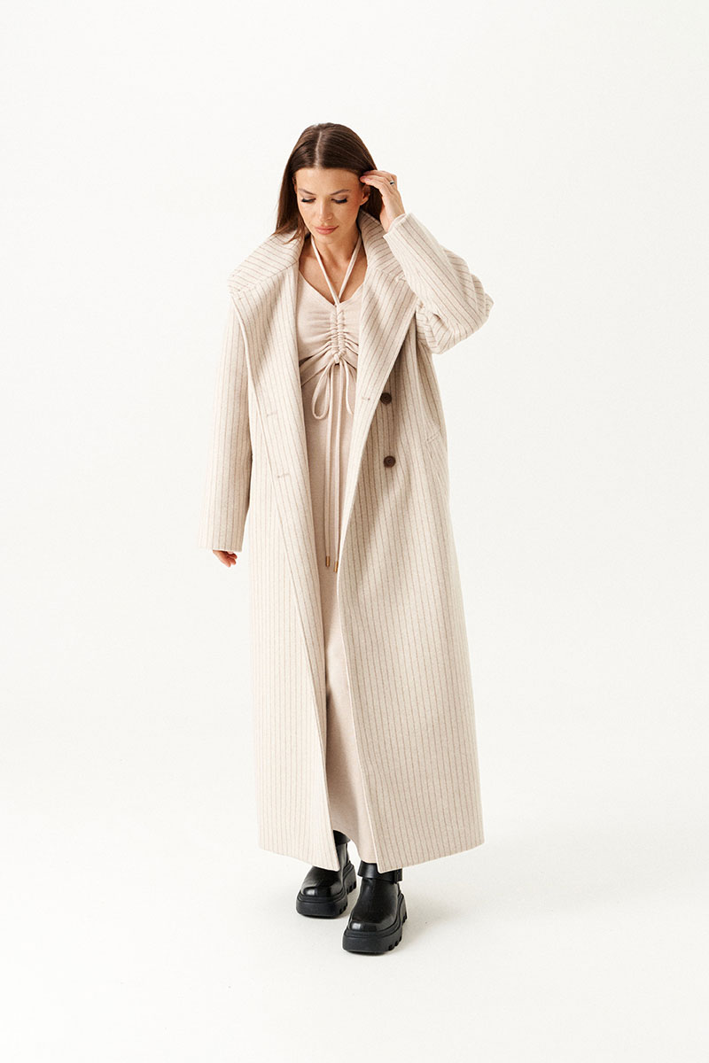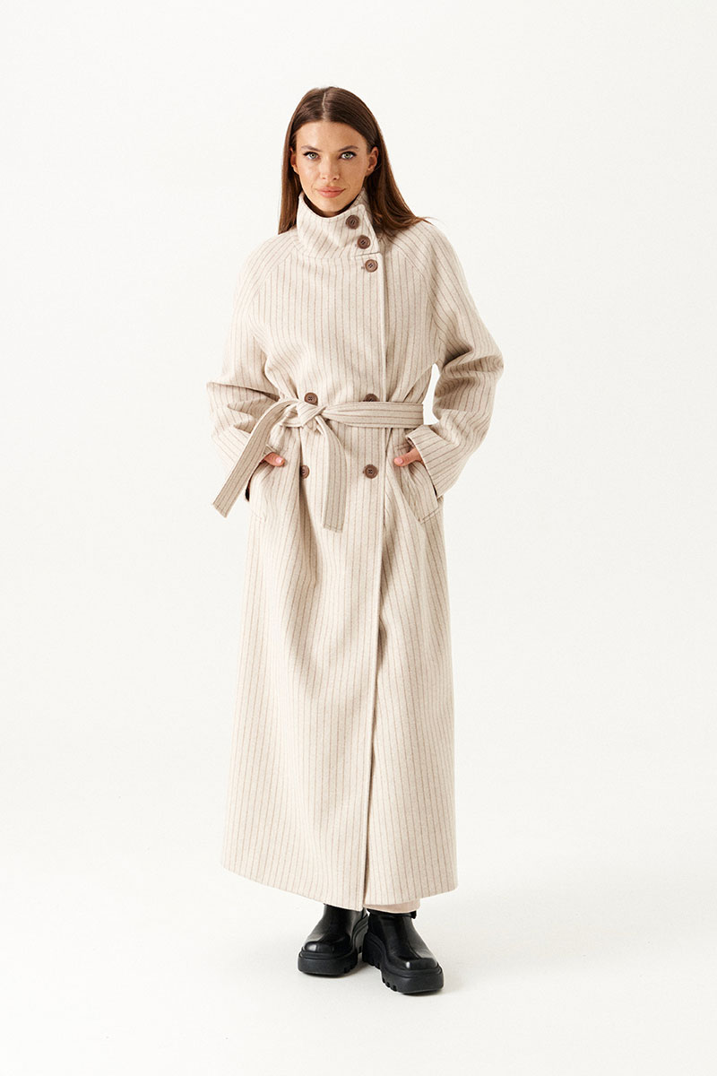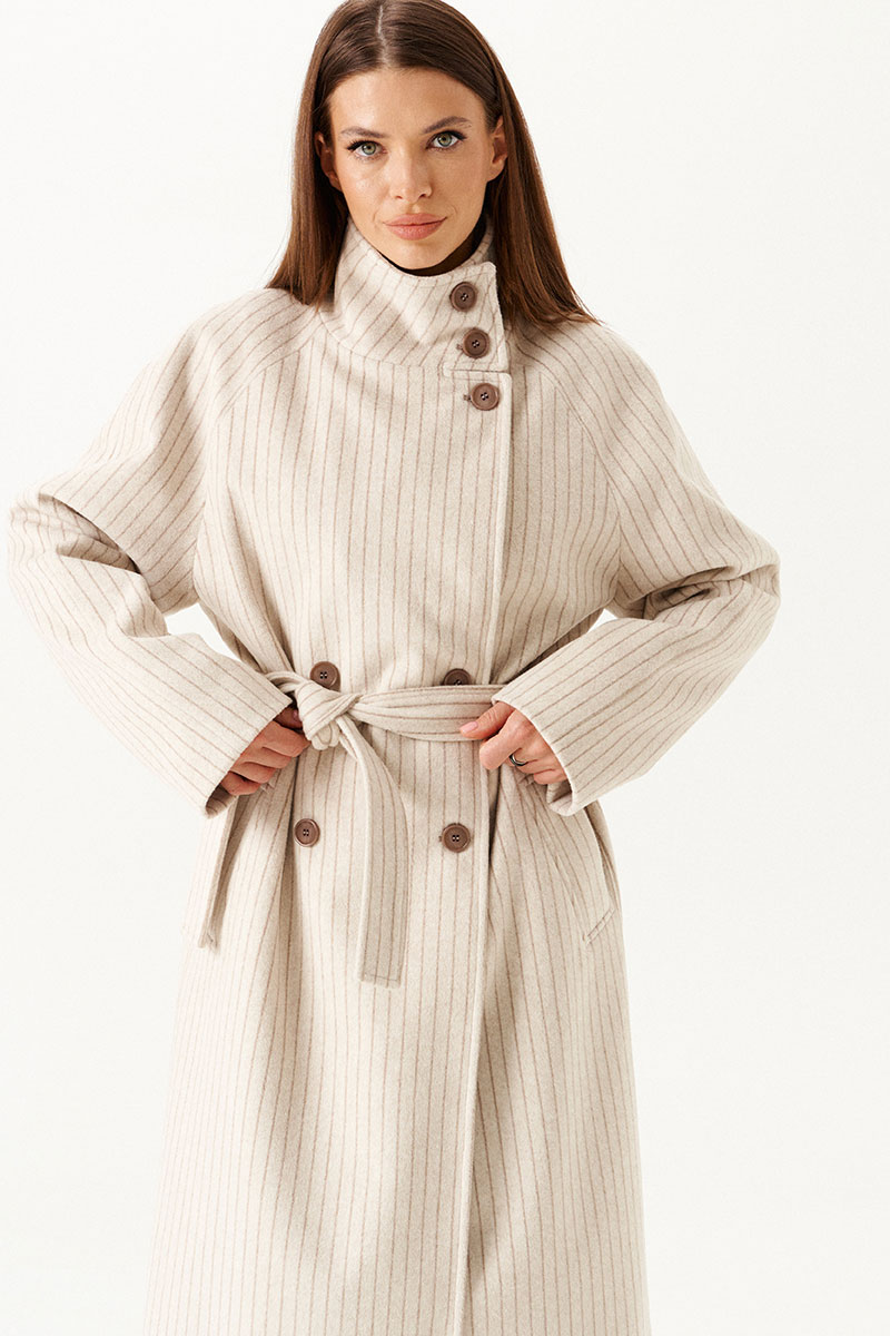 Пальто из трикотажного полотна прямого силуэта, с центральной двубортной застежкой на петли и пуговицы, на подкладке. Воротник – стойка с застежкой на петли и пуговицы. Полочки с прорезными карманами с листочкой. Спинка со средним швом и шлицей. Рукав – реглан. В комплекте пояс из основной ткани.