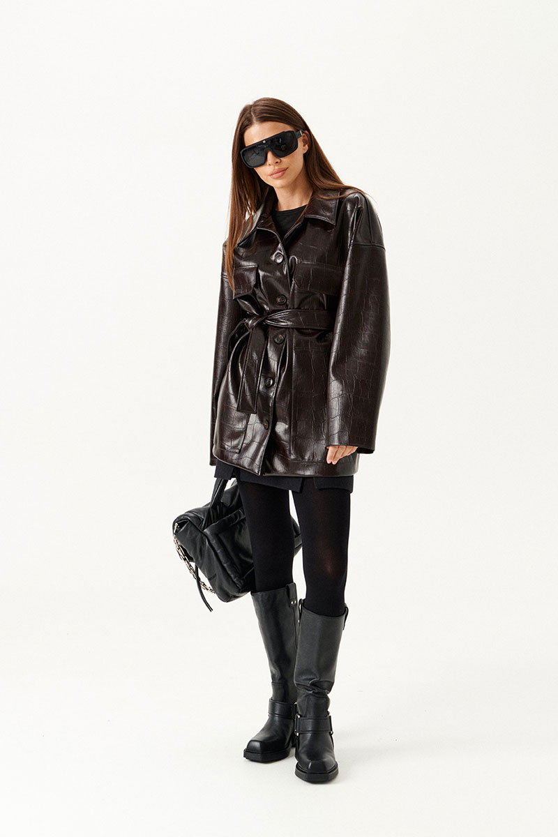 Куртка из искусственной кожи, прямого силуэта, со спущенной линией плеча, длиной ниже линии бедер, с центральной застежкой на петли и пуговицы, на подкладке. Полочки с двумя совмещенными накладными карманами – верхним с клапаном и нижним. Спинка со средним швом. Рукав втачной двухшовный. Воротник отложной с отрезной стойкой. В комплекте пояс из основной ткани.
