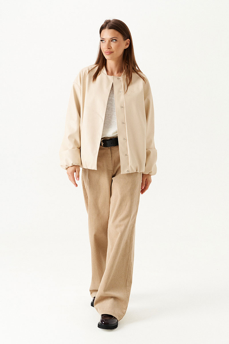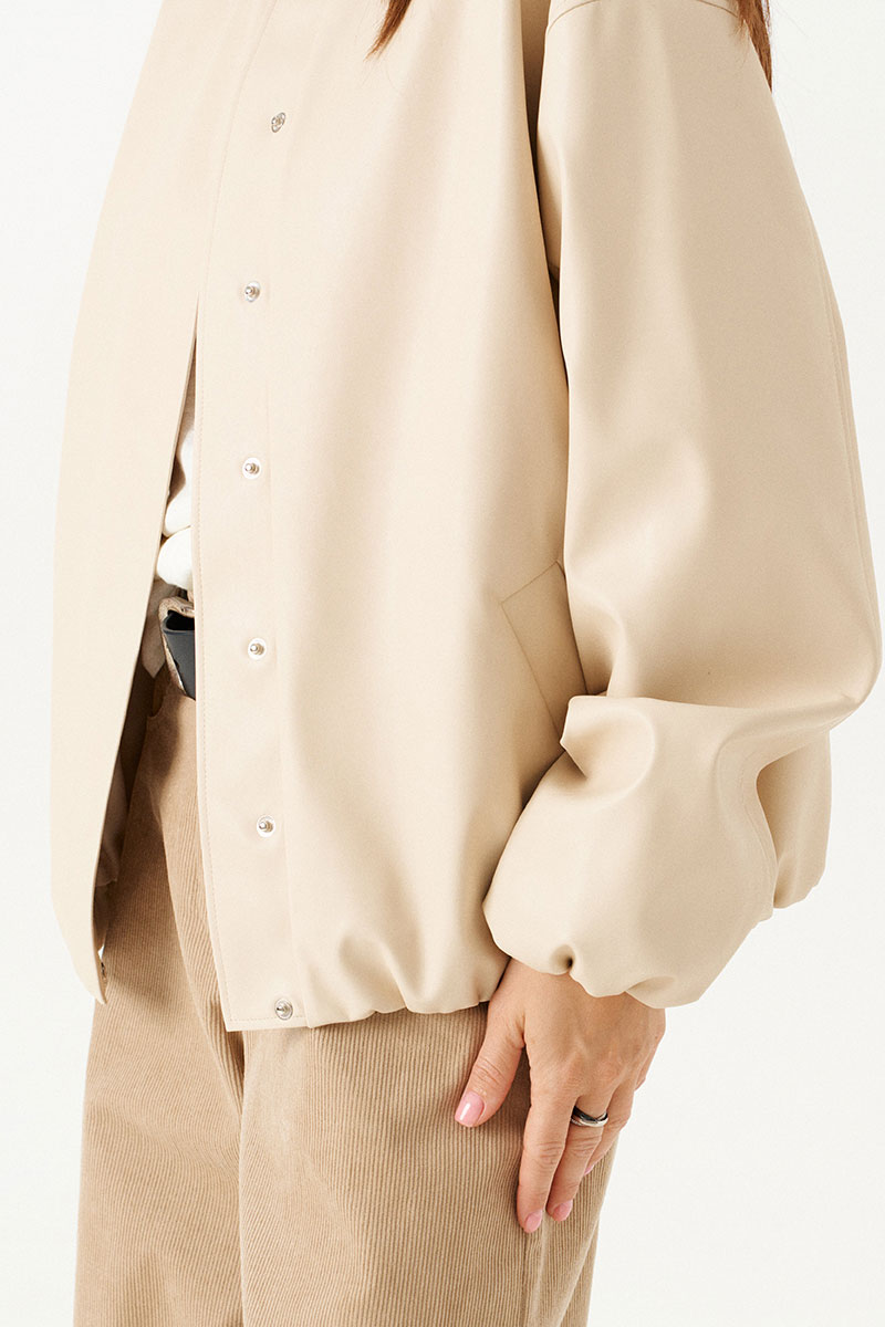 Бомбер из искусственной кожи, свободный, со спущенной линией плеча, с центральной застежкой на потайные кнопки, на подкладке. Горловина округлой формы с воротником-стойкой. Детали переда с прорезными карманами с листочкой. Спинка со средним швом. Рукав втачной, двухшовный.