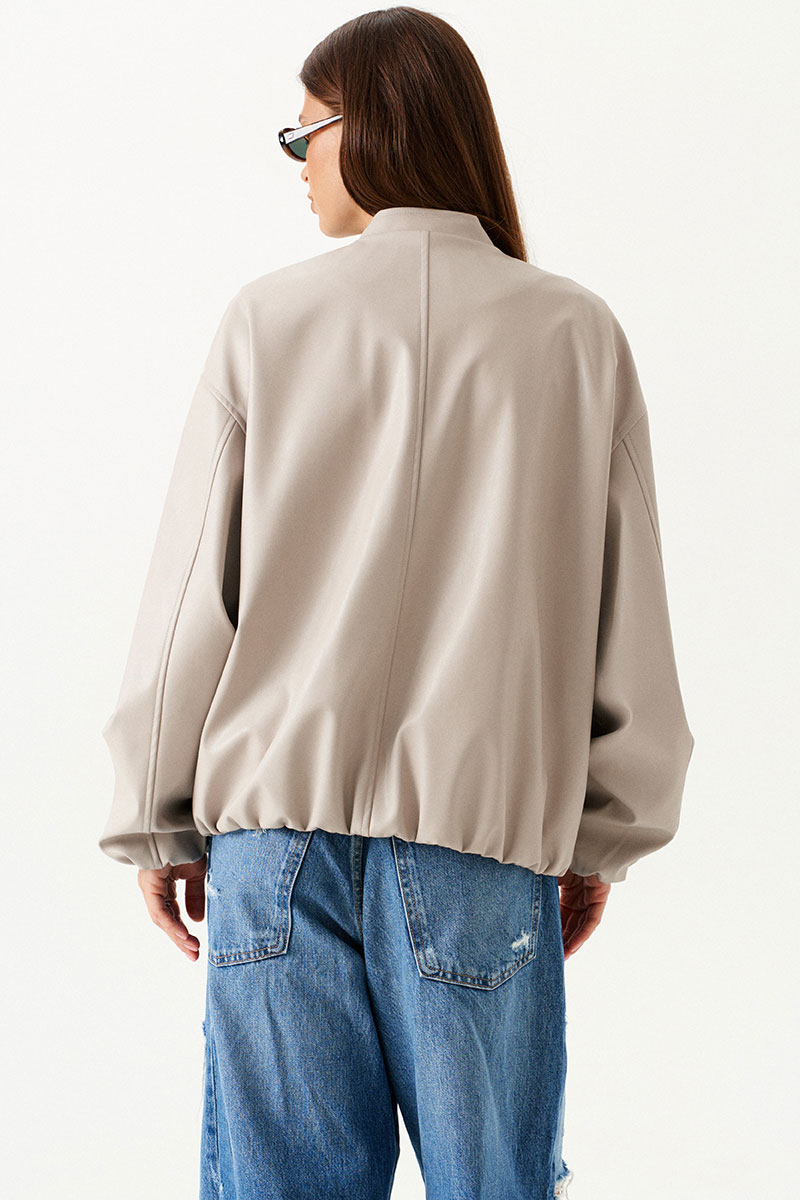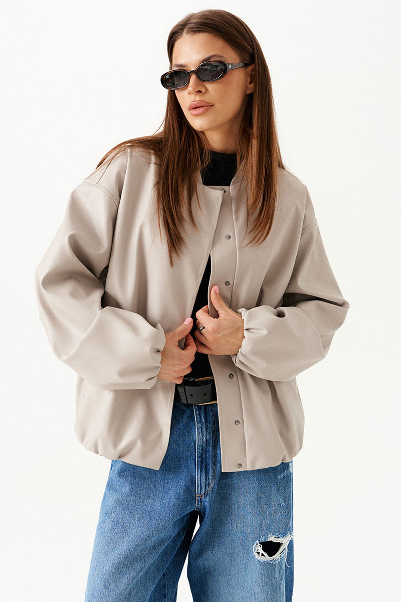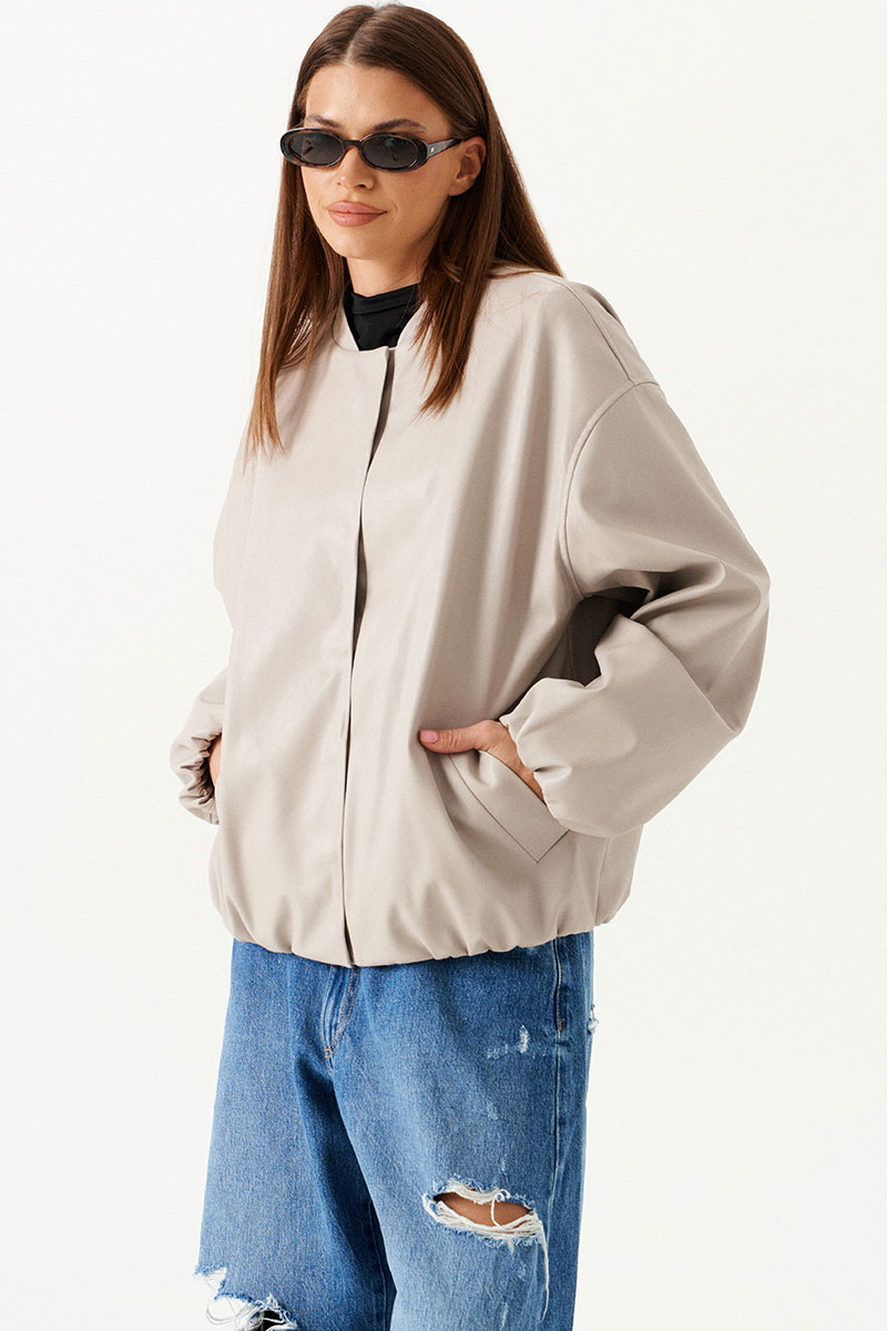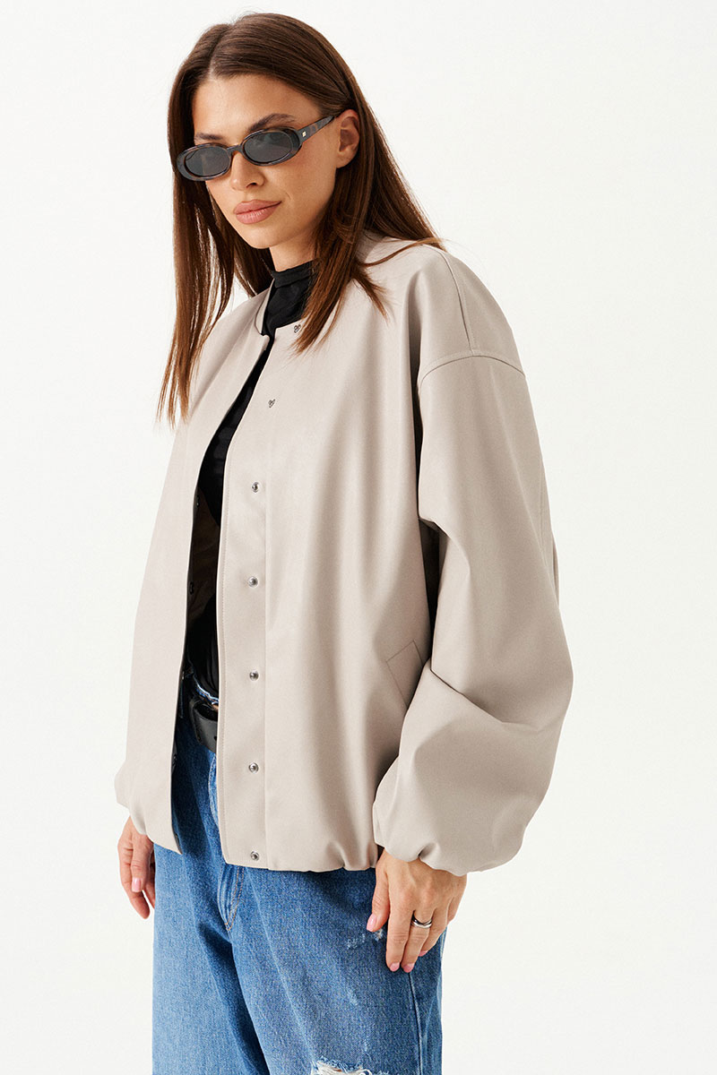 Бомбер из искусственной кожи, свободный, со спущенной линией плеча, с центральной застежкой на потайные кнопки, на подкладке. Горловина округлой формы с воротником-стойкой. Детали переда с прорезными карманами с листочкой. Спинка со средним швом. Рукав втачной, двухшовный.