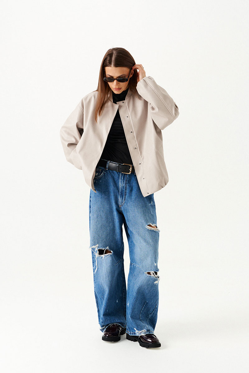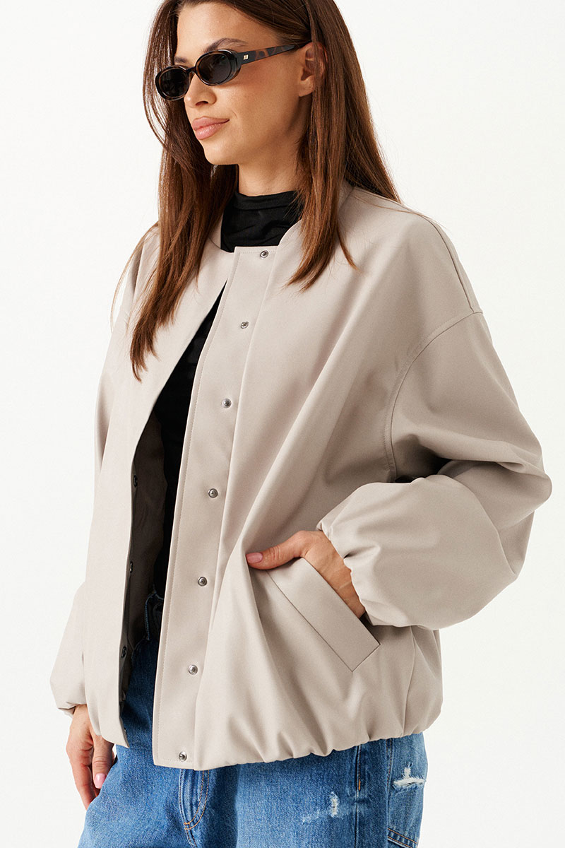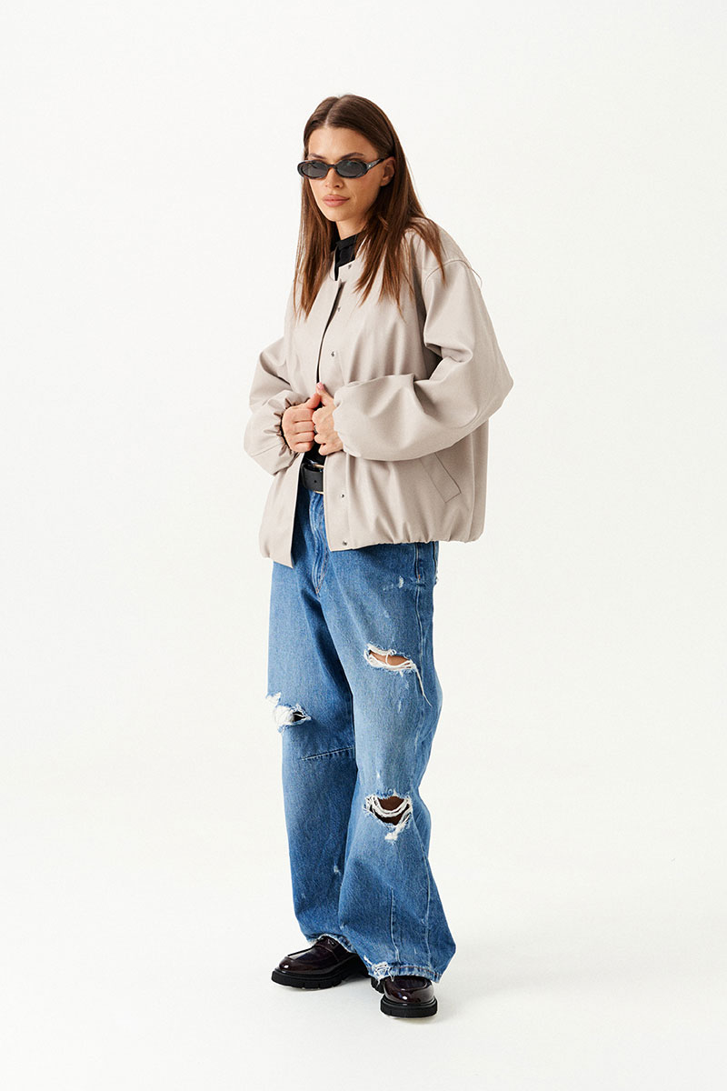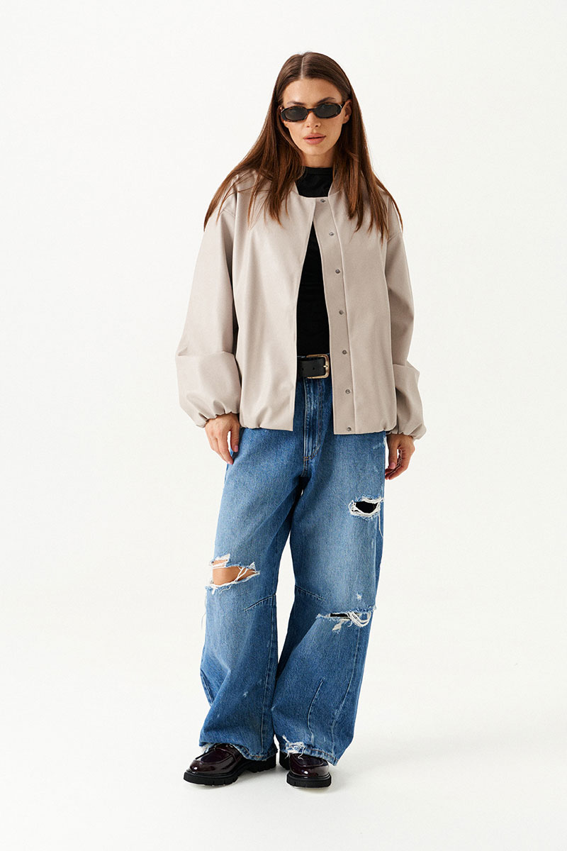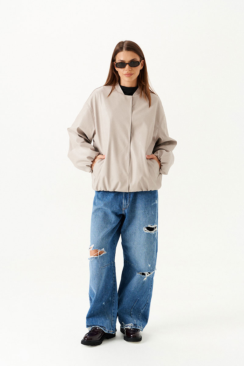 Бомбер из искусственной кожи, свободный, со спущенной линией плеча, с центральной застежкой на потайные кнопки, на подкладке. Горловина округлой формы с воротником-стойкой. Детали переда с прорезными карманами с листочкой. Спинка со средним швом. Рукав втачной, двухшовный.