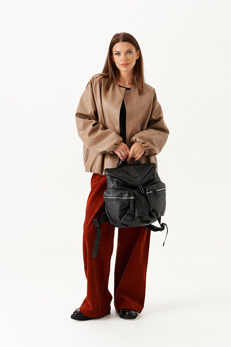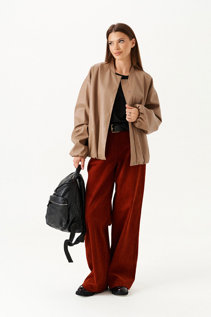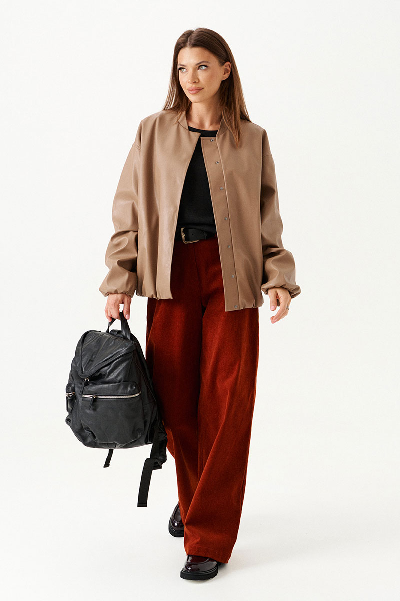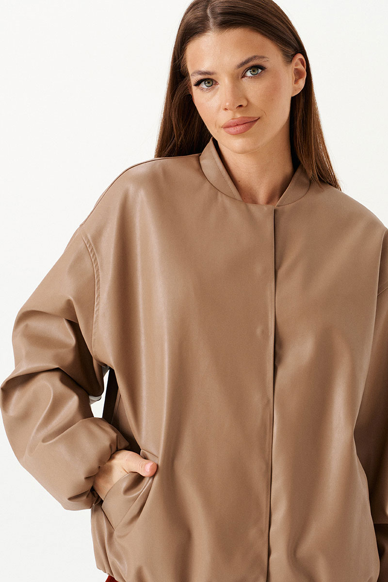 Бомбер из искусственной кожи, свободный, со спущенной линией плеча, с центральной застежкой на потайные кнопки, на подкладке. Горловина округлой формы с воротником-стойкой. Детали переда с прорезными карманами с листочкой. Спинка со средним швом. Рукав втачной, двухшовный.