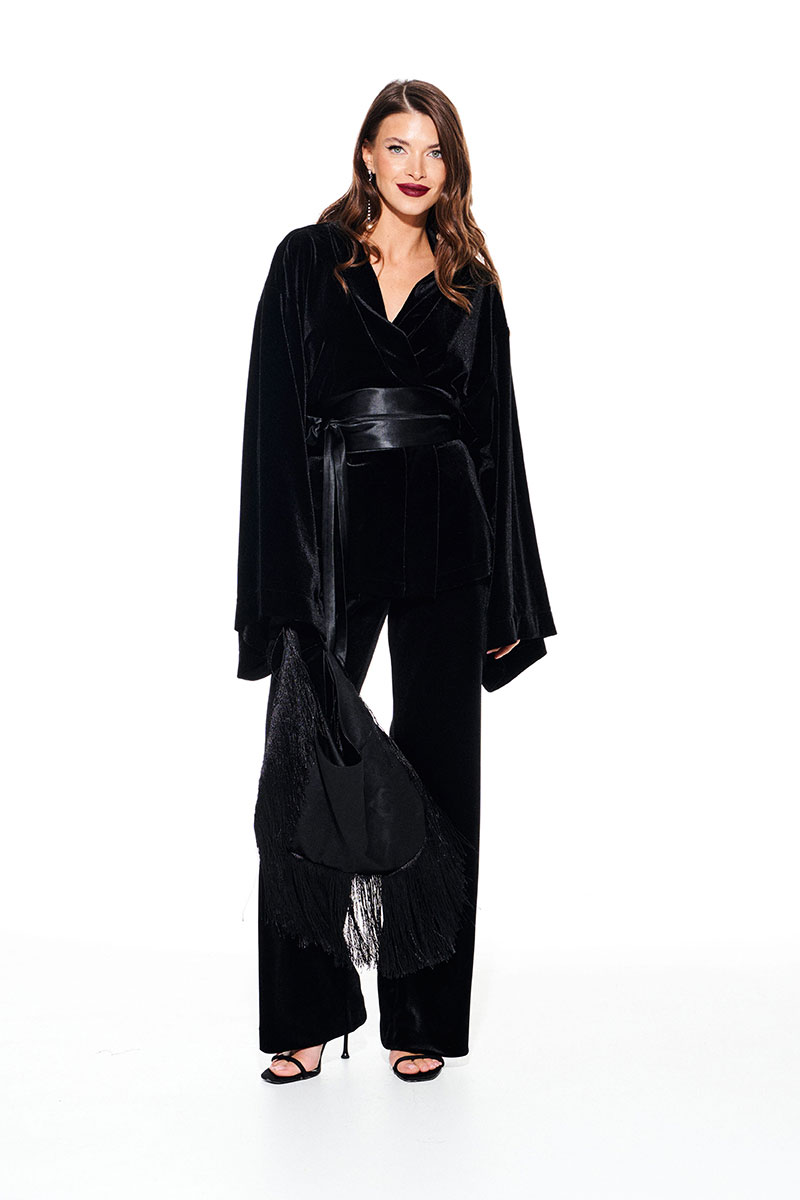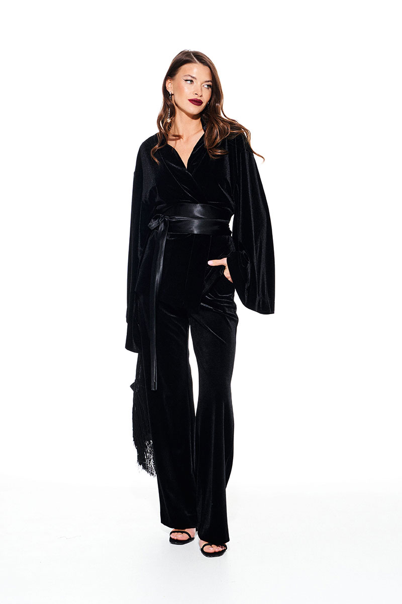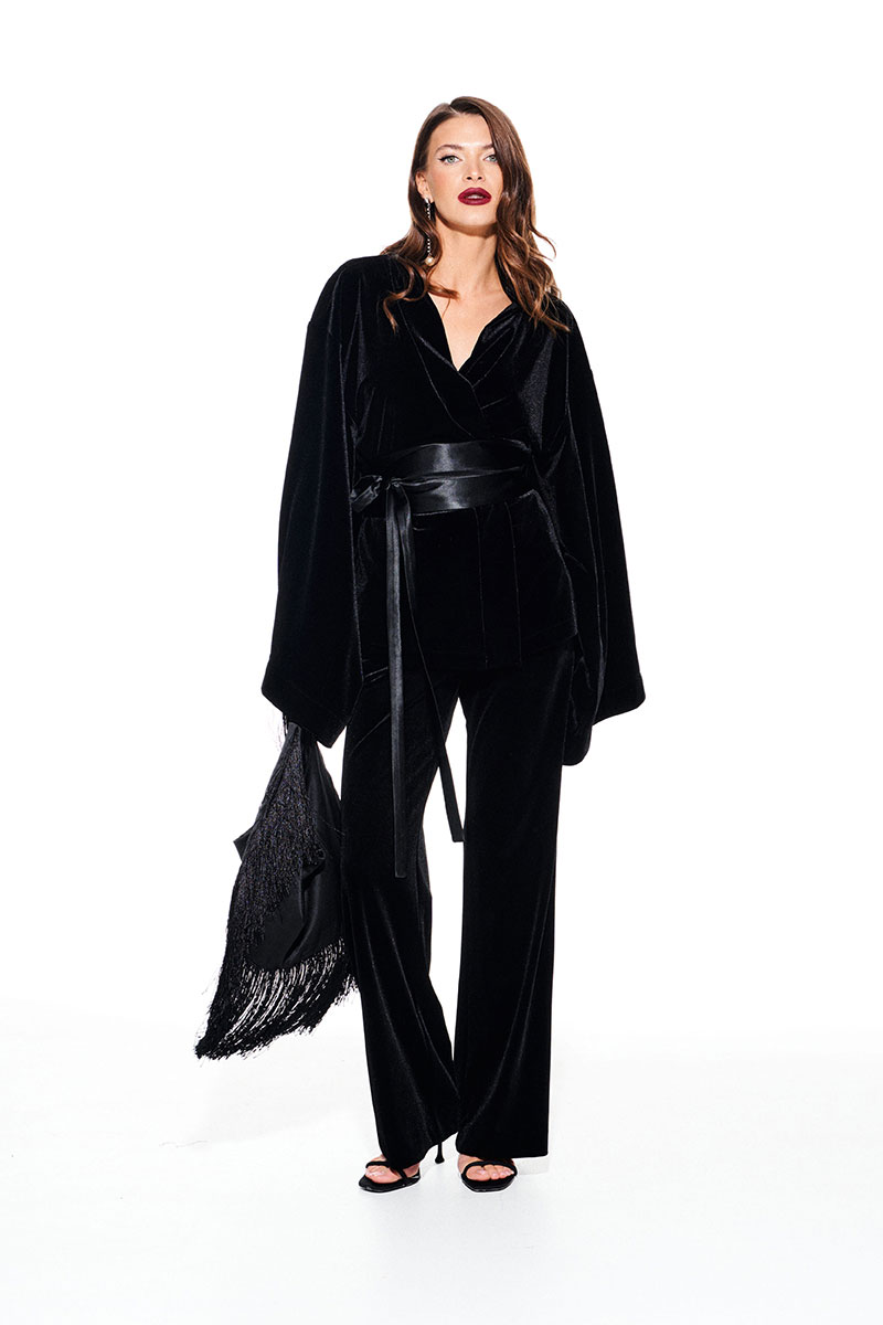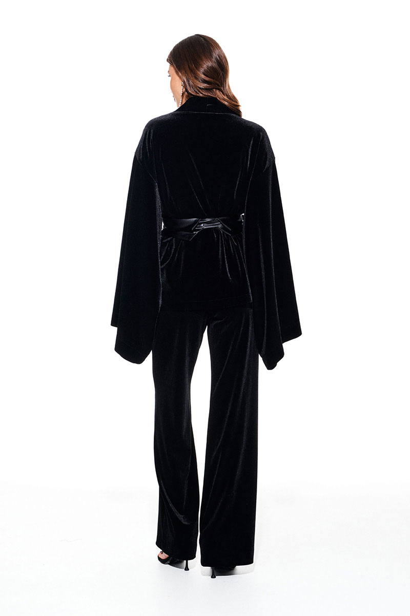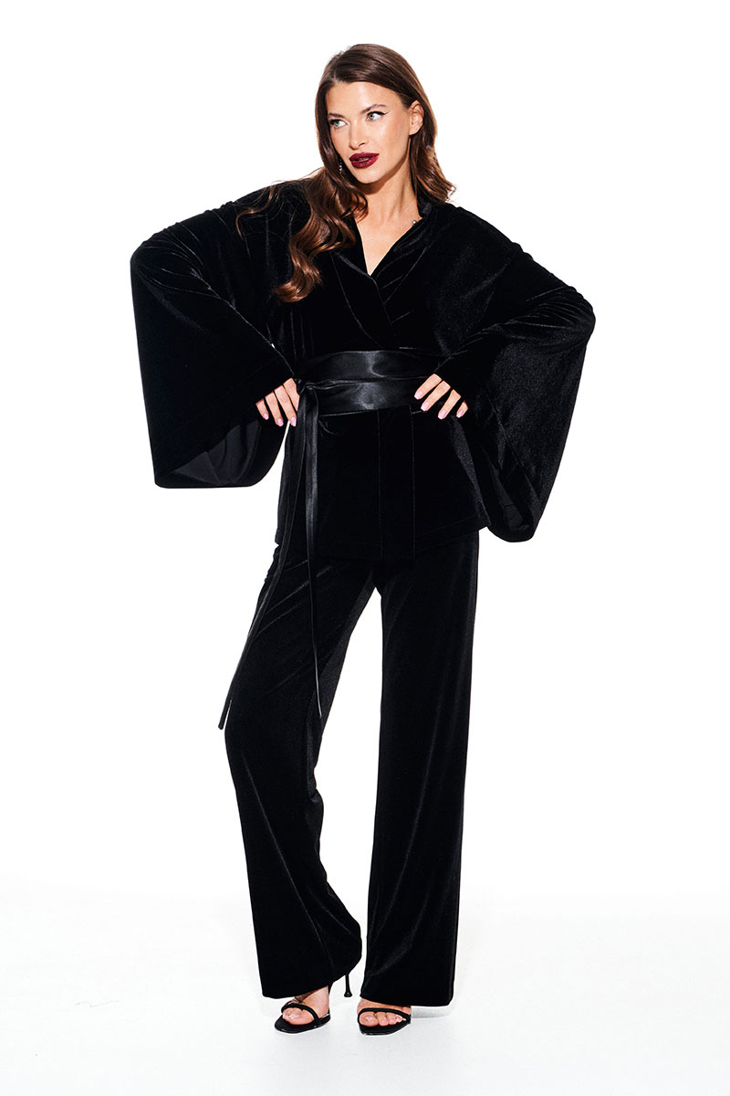 Кардиган из бархата на трикотажной основе, свободого объема, прямого силуэта, на подкладке. Срезы борта и горловины спинки обработаны притачной обтачкой. Линия плеча спущенная. Спинка цельная. Рукав втачной, широкий, в стиле "кимоно". В комплекте пояс из атласной ткани..