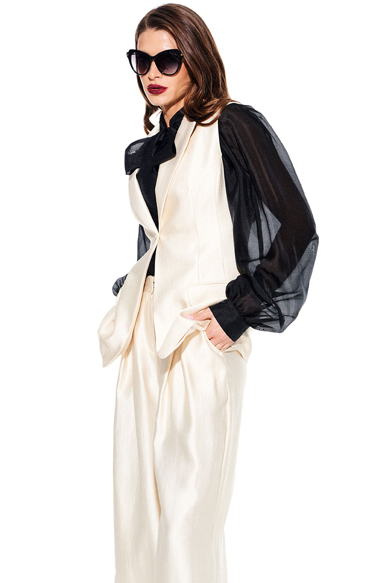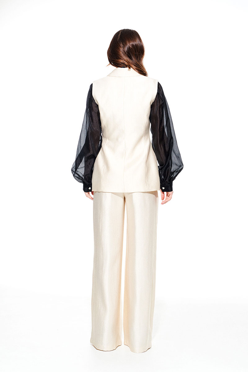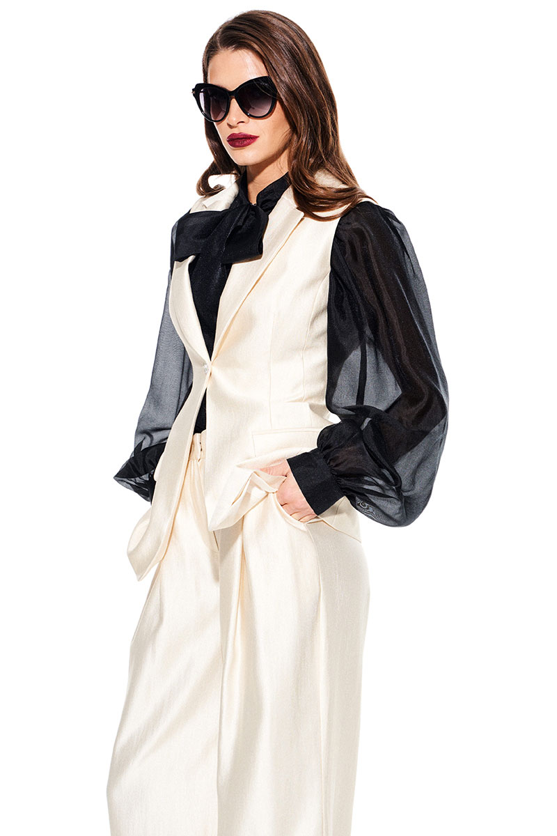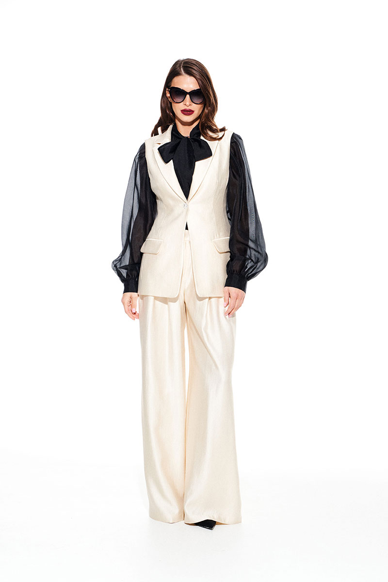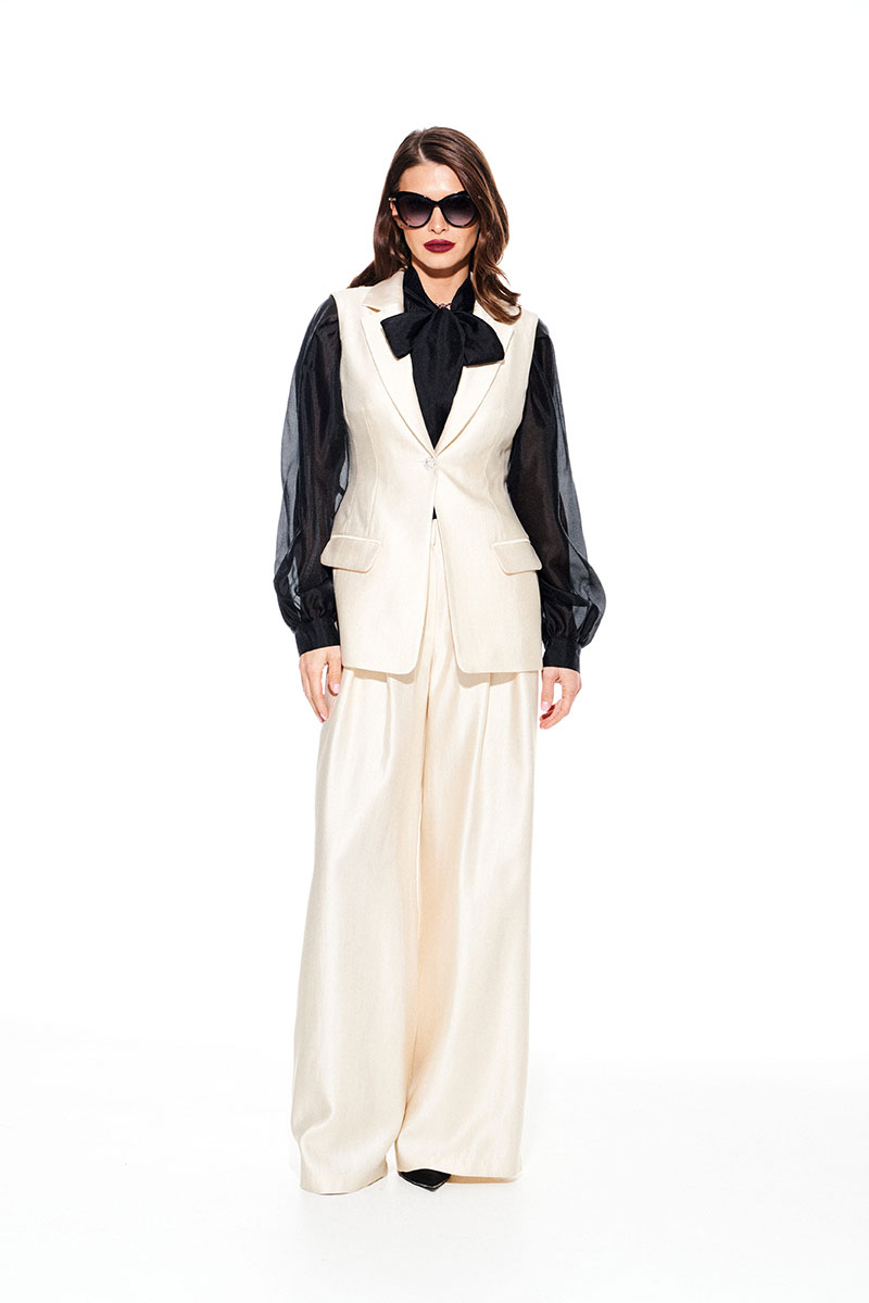 Жилет умеренного объема, приталенного силуэта, однобортный, с центральной застежкой на 1 петлю и 1 пуговицу, отложным воротником и лацканами пиджачного типа, на подкладке. Полочки с талиевыми вытачками и прорезными карманами с клапаном и двумя обтачками. Спинка со средним швом и талиевыми вытачками.