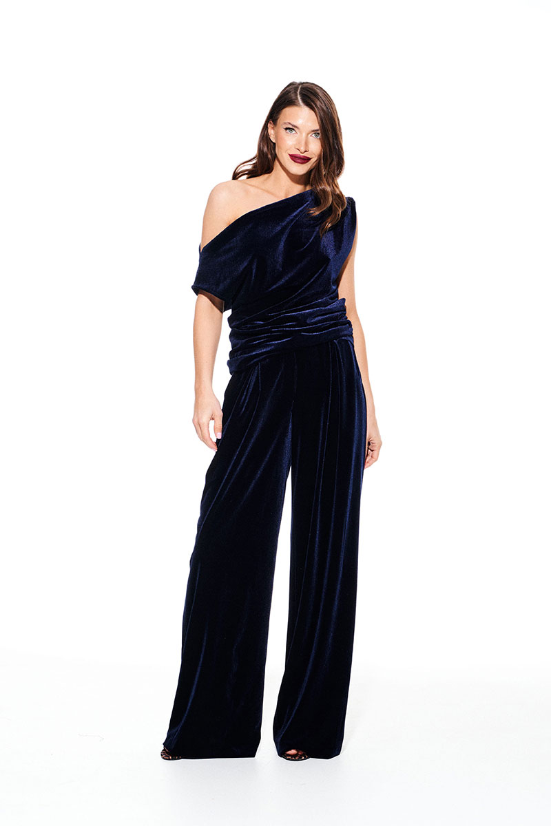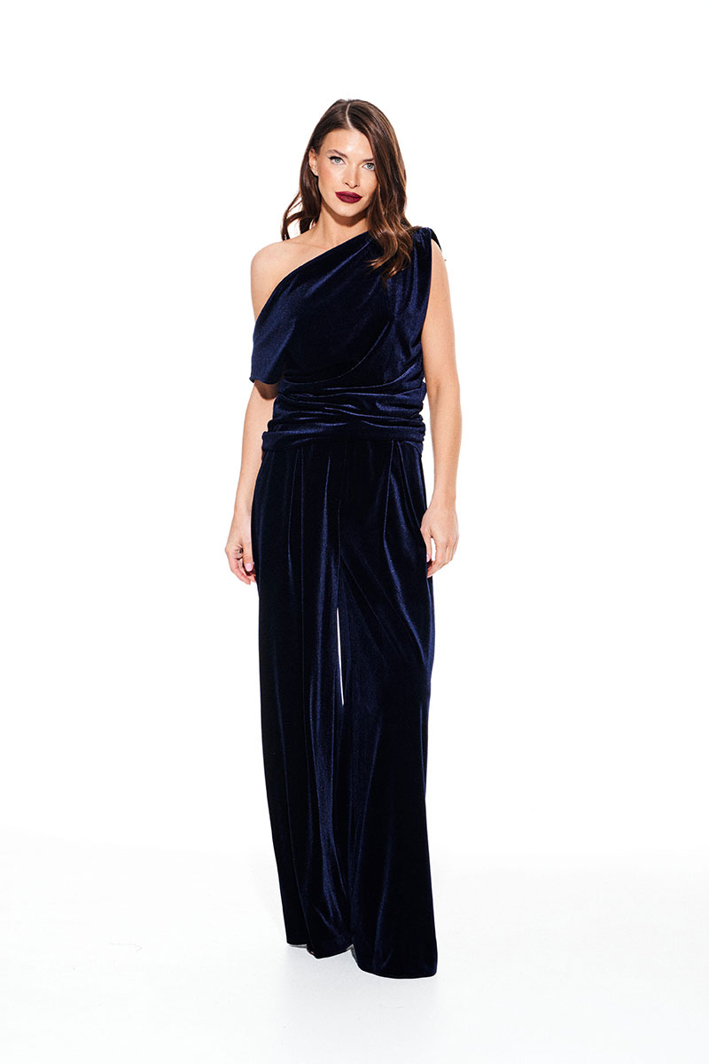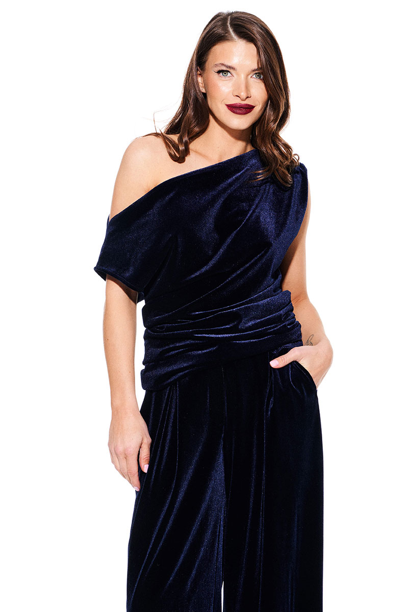Блуза из бархата на трикотажной основе, умеренного объема, полуприлегающего силуэта с акцентом на одно плечо, с фигурной драпировкой на уровне груди. Вырез горловины в форме лодочки. Левый плечевой и боковой шов оформлены сборкой. Длина до линии бедер.