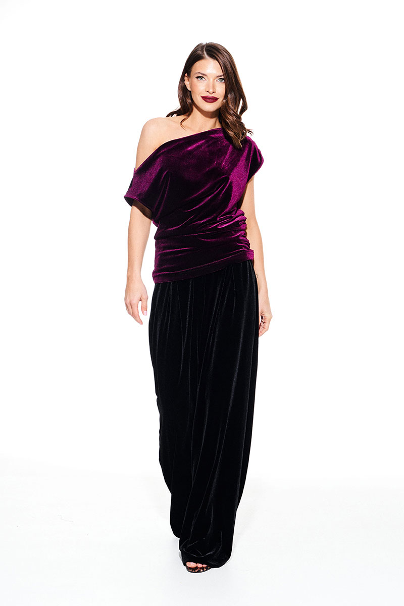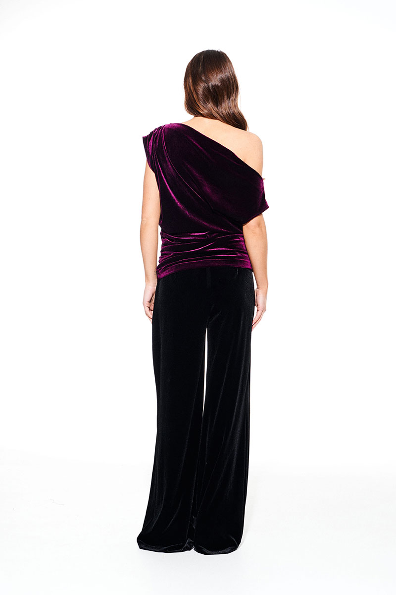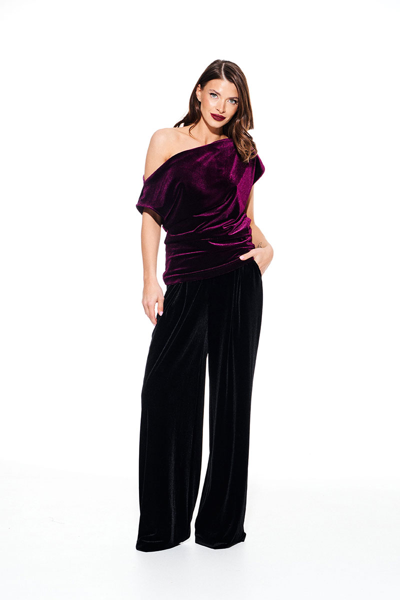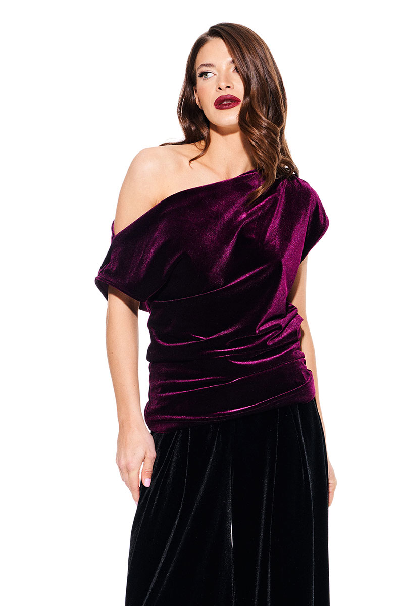 Блуза из бархата на трикотажной основе, умеренного объема, полуприлегающего силуэта с акцентом на одно плечо, с фигурной драпировкой на уровне груди. Вырез горловины в форме лодочки. Левый плечевой и боковой шов оформлены сборкой. Длина до линии бедер.