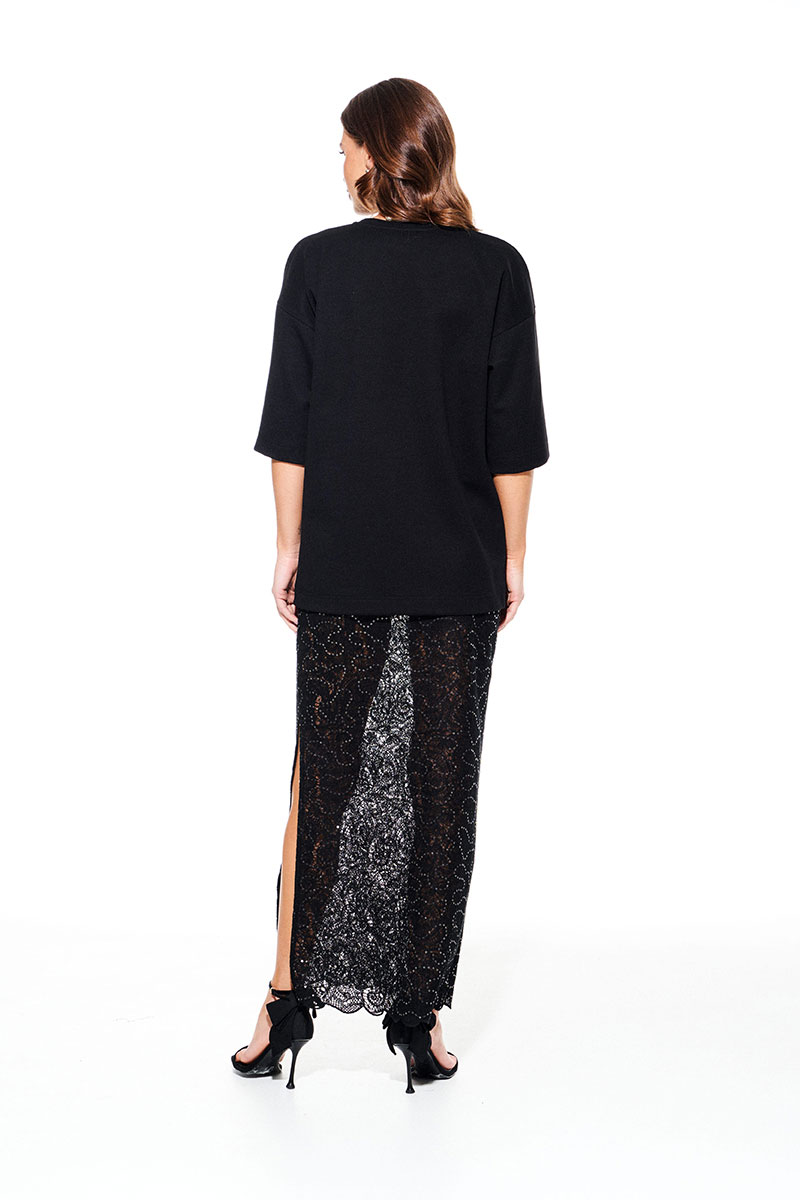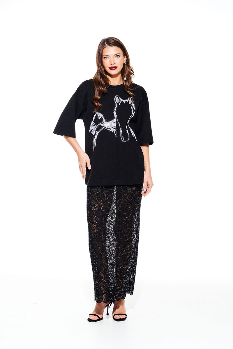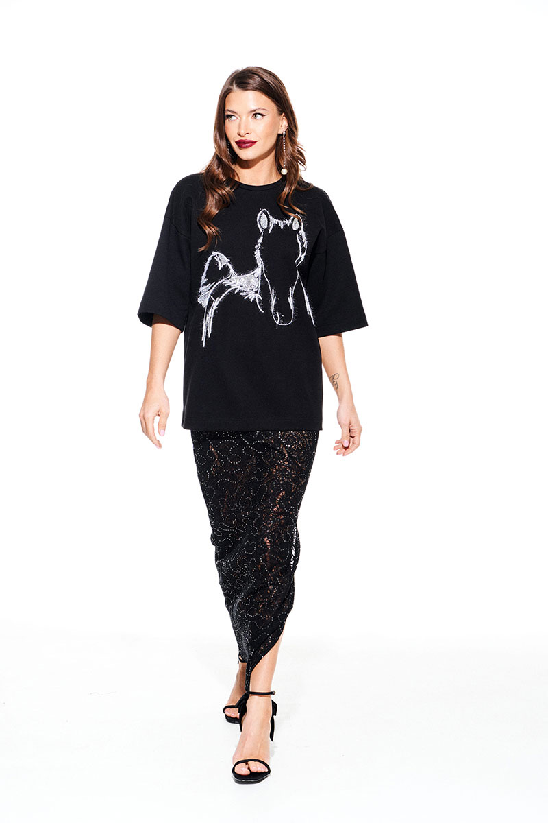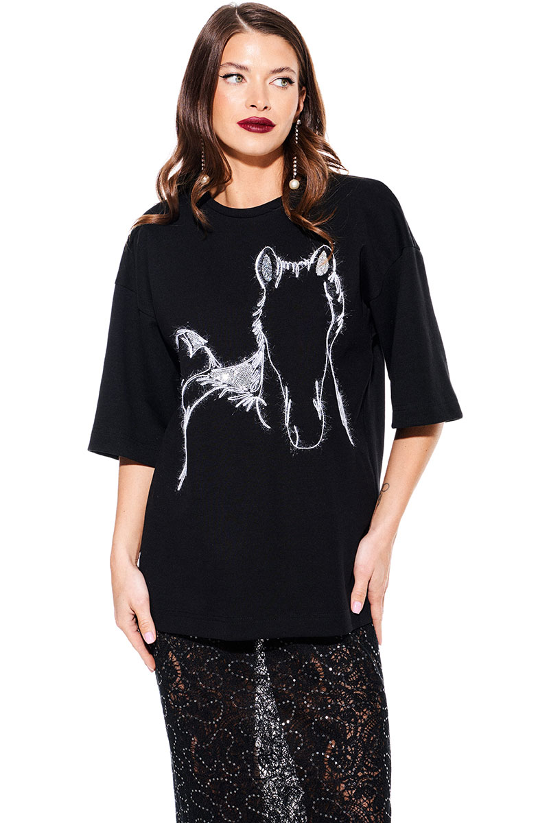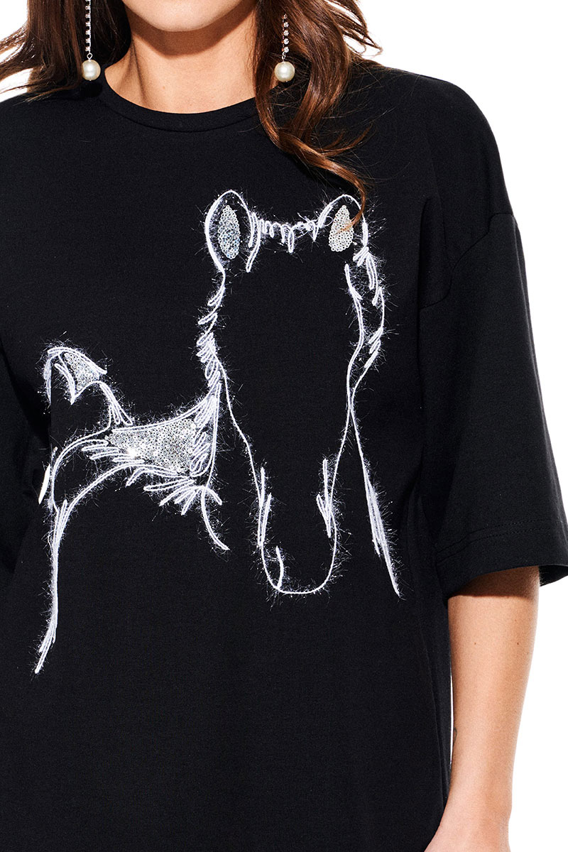 Джемпер из трикотажного полотна, прямого силуэта, свободный, с круглым вырезом горловины. Перед и спинка цельные. По переду выполнена вышивка "Лошадь".