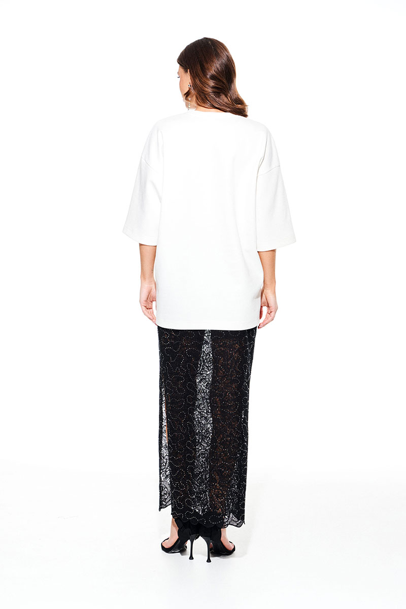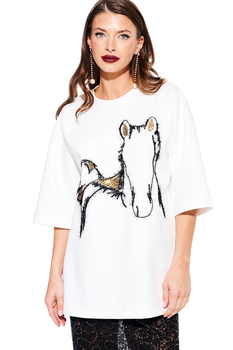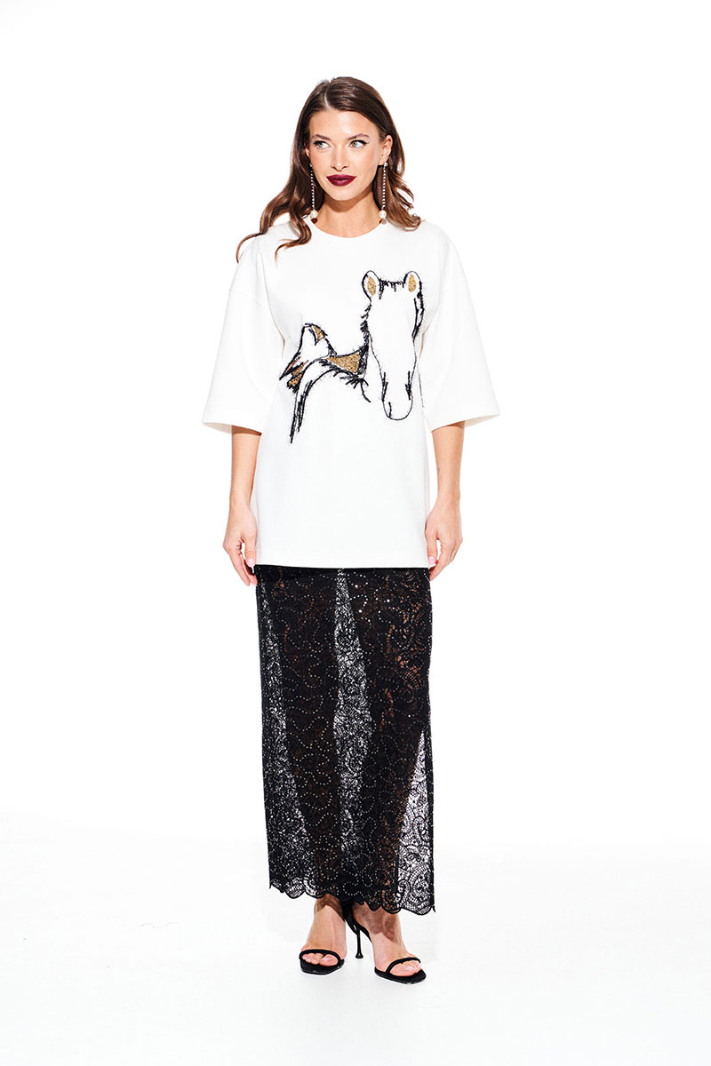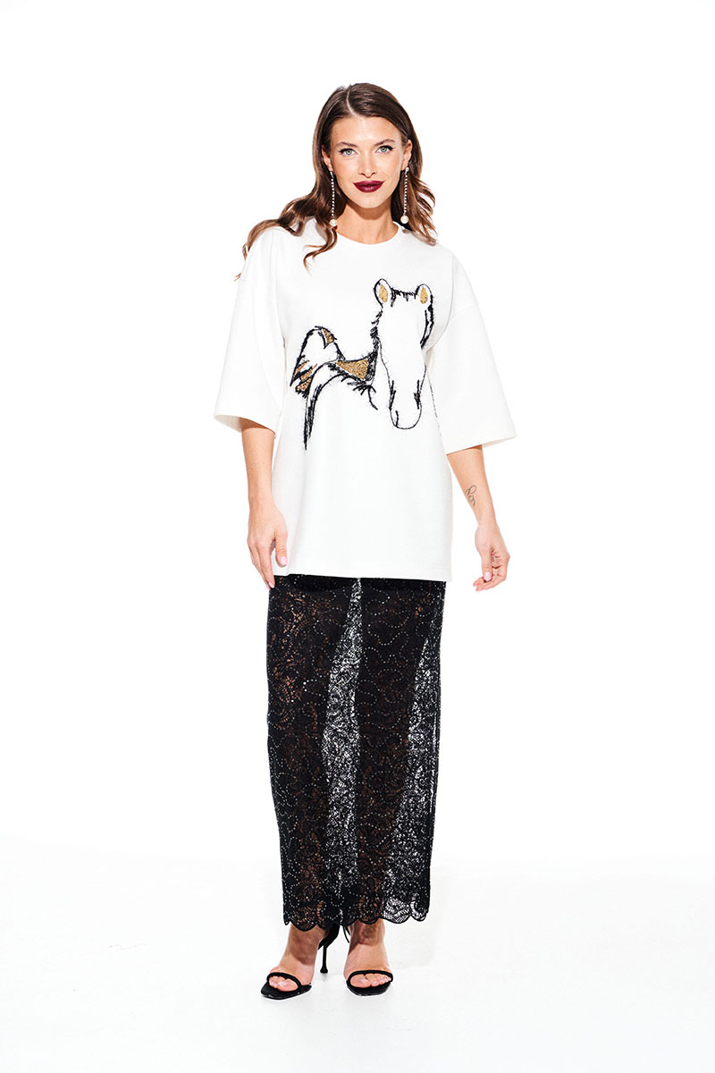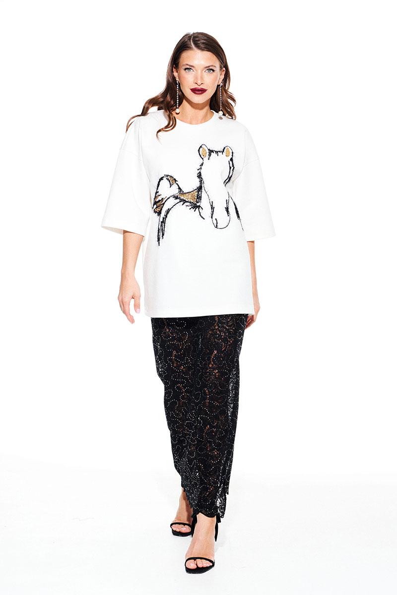 Джемпер из трикотажного полотна, прямого силуэта, свободный, с круглым вырезом горловины. Перед и спинка цельные. По переду выполнена вышивка "Лошадь".