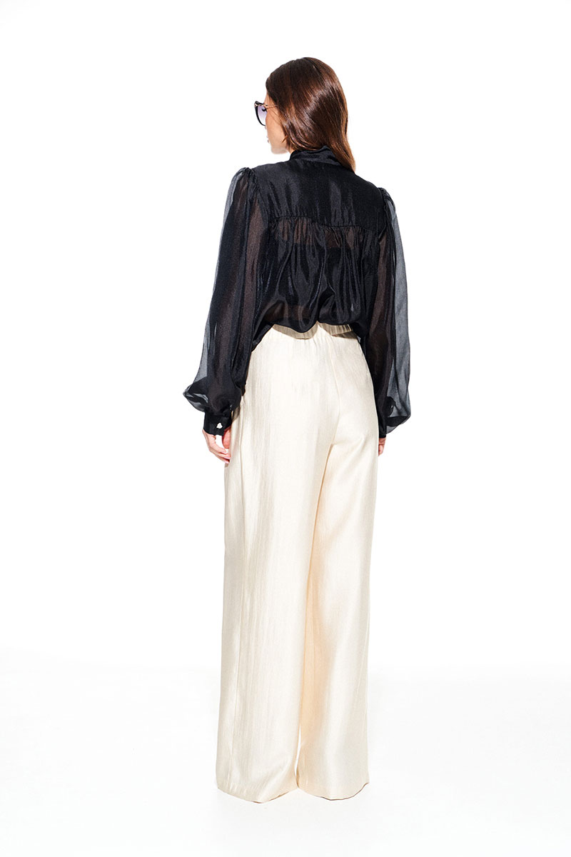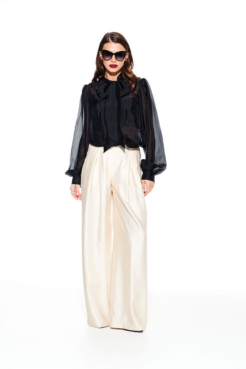 Блузка из органзы, умеренного объема, прямого силуэта. Перед с нагрудными вытачками. Воротник с отрезной стойкой, переходящей в завязку. Спинка с отрезной кокеткой и сборкой. Рукав втачной, длинный, с отрезной манжетой. Окат и шов притачивания рукава к манжете со сборкой. Манжета с застежкой на 1 петлю и 1 пуговицу.