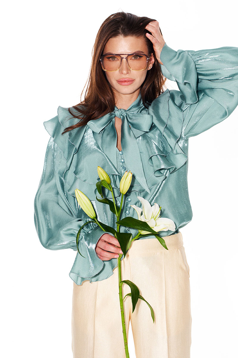 Блузка умеренного объема, прямого силуэта, с центральной застежкой на навесные петли и пуговицы. Воротник с отрезной стойкой, переходящий в завязки. Горловина переда оформлена V-образным вырезом. Детали переда с рельефами, оформленные воланами. Спинка цельная. Рукав покроя реглан. Нижний срез рукава обработан воланом и собран на резинку.