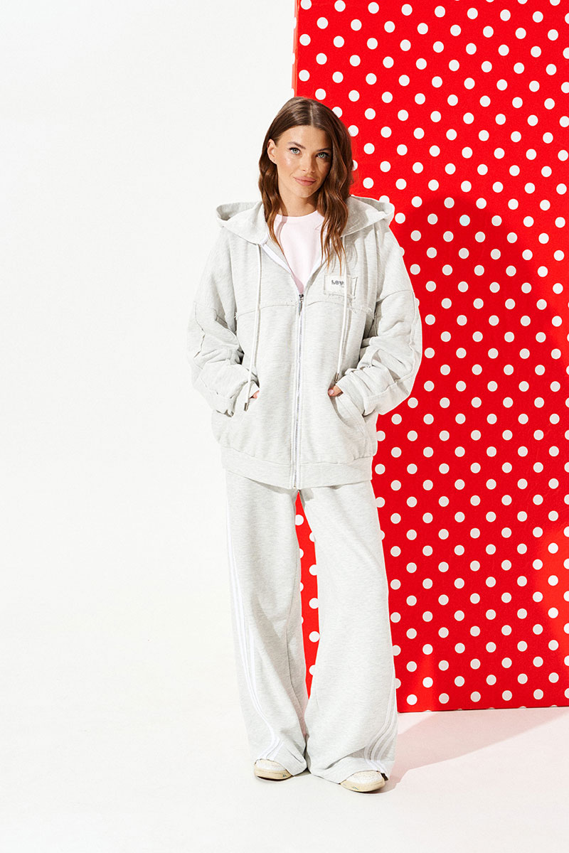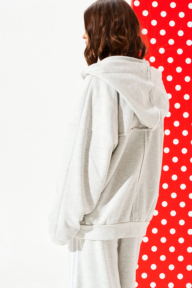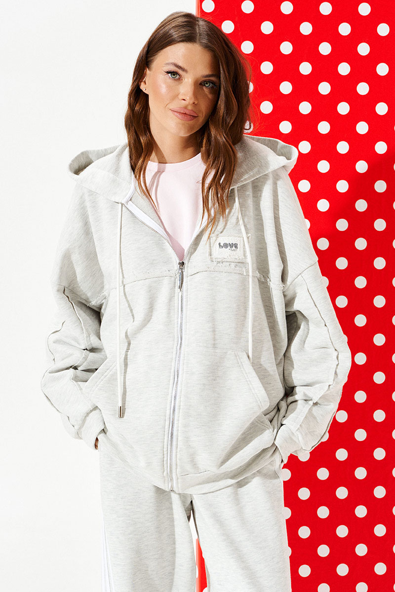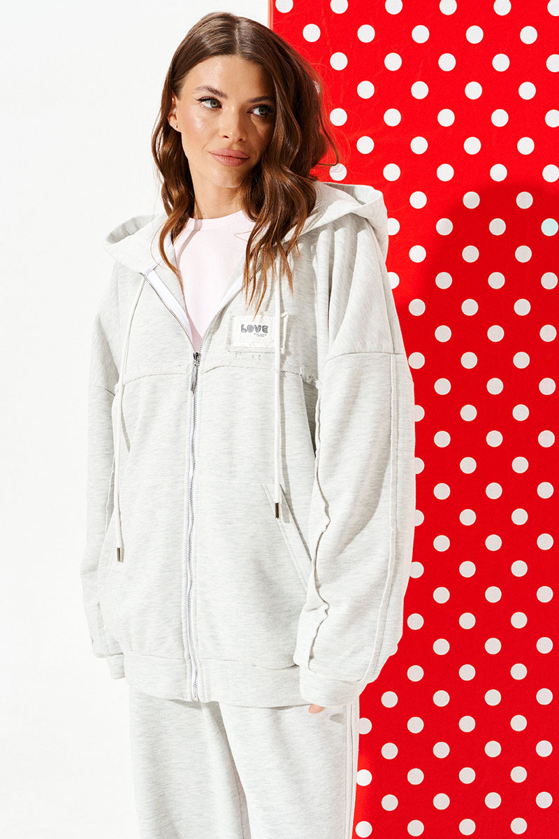 Толстовка из трикотажного полотна свободного объема, прямого силуэта, с капюшоном и центральной застежкой на тесьму-молнию. Детали переда с накладными карманами и отрезной кокеткой. На левой детали переда настрочная деталь с нашивкой. Спинка с отрезной кокеткой и средним швом. Рукав втачной, двухшовный, длинный. Низ изделия и рукава обработаны притачной манжетой. Капюшон на обтачке, одношовный, через обметанные петли в кулиску продет декоративный шнур с металлическими наконечниками. Кокетка и настрочная деталь переда, кокетка и средний шов спинки, шов капюшона, швы рукавов – с необработанным краем.