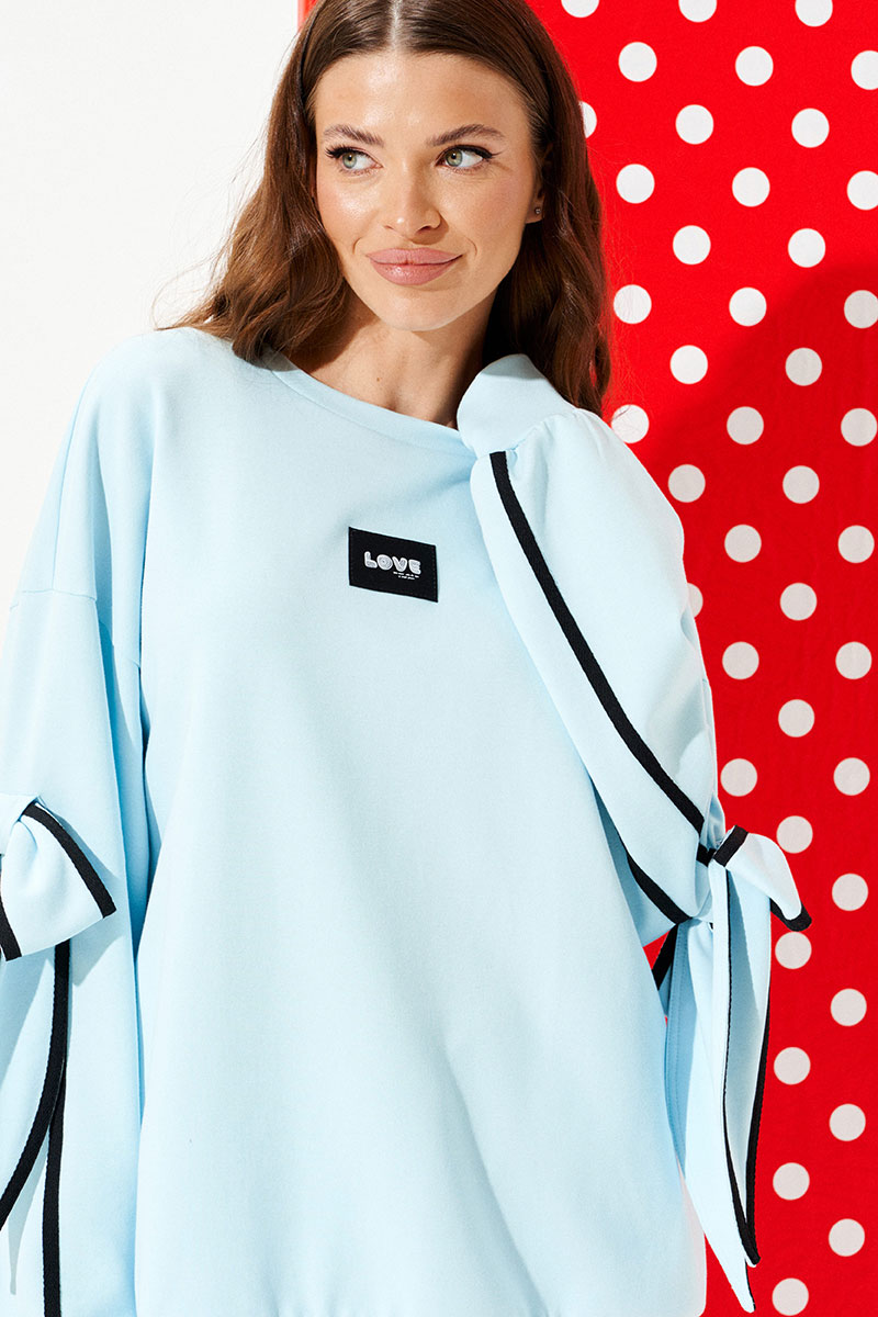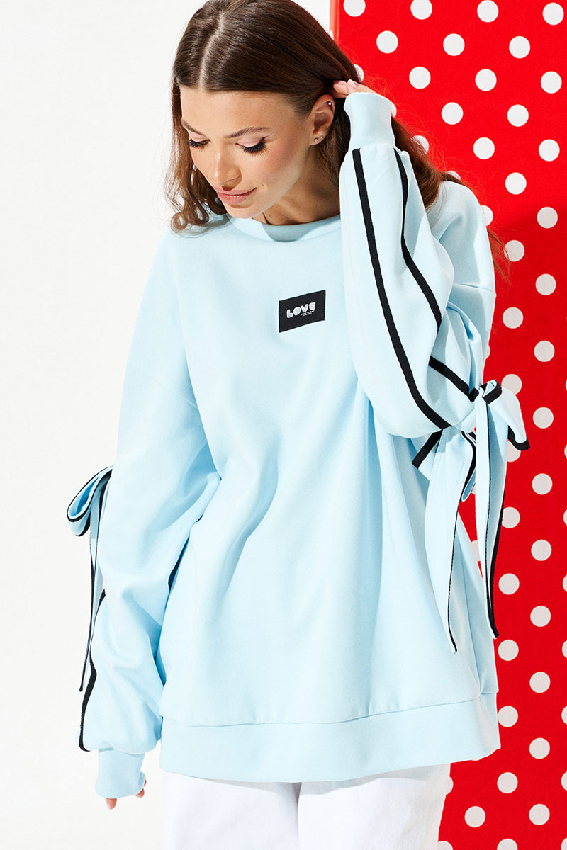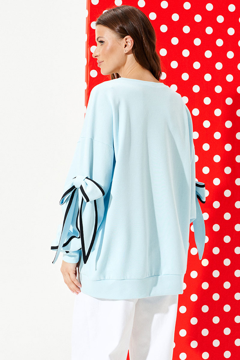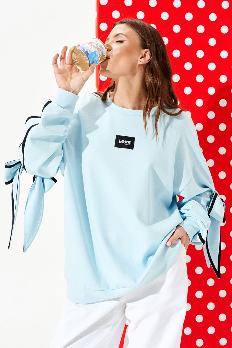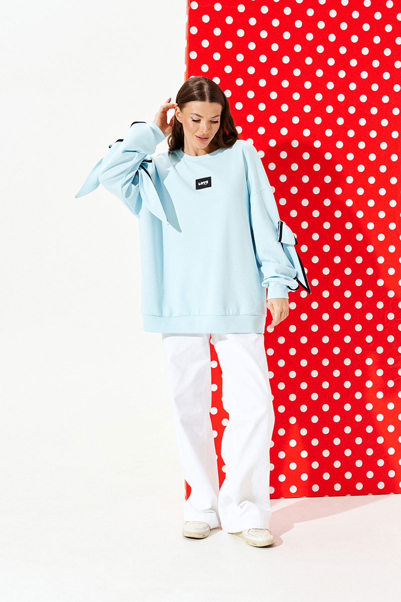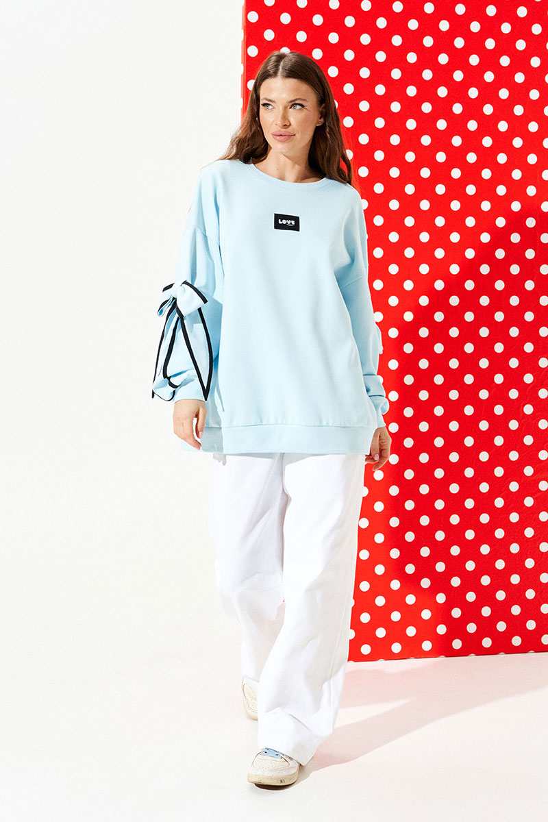 Свитшот из трикотажного полотна свободного объема, прямого силуэта, с круглым вырезом горловины. Перед и спинка цельные. Перед декорирован настрочной нашивкой. Рукав втачной, одношовный, длинный. Рукав декорирован настрочной деталью, в которую продет декоративный бант из основного материала. Края банта и рукав оформлены декоративной тесьмой. Низ изделия и рукава обработаны притачной манжетой.