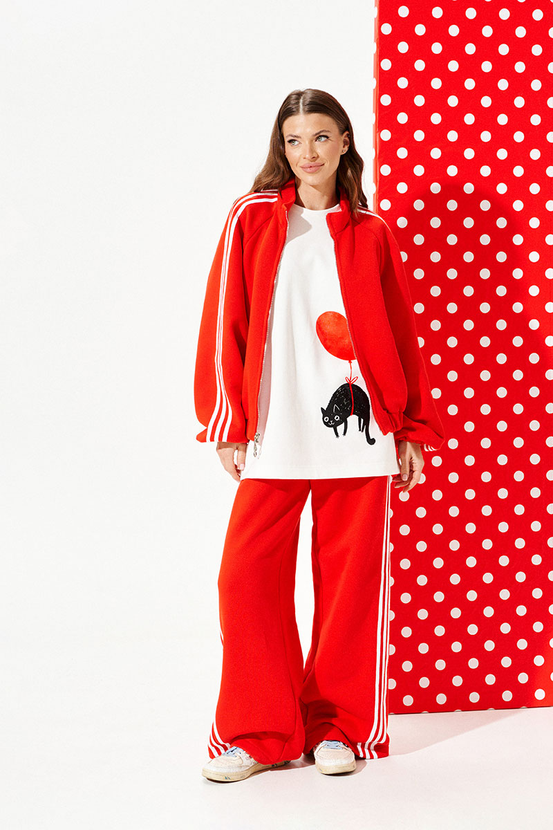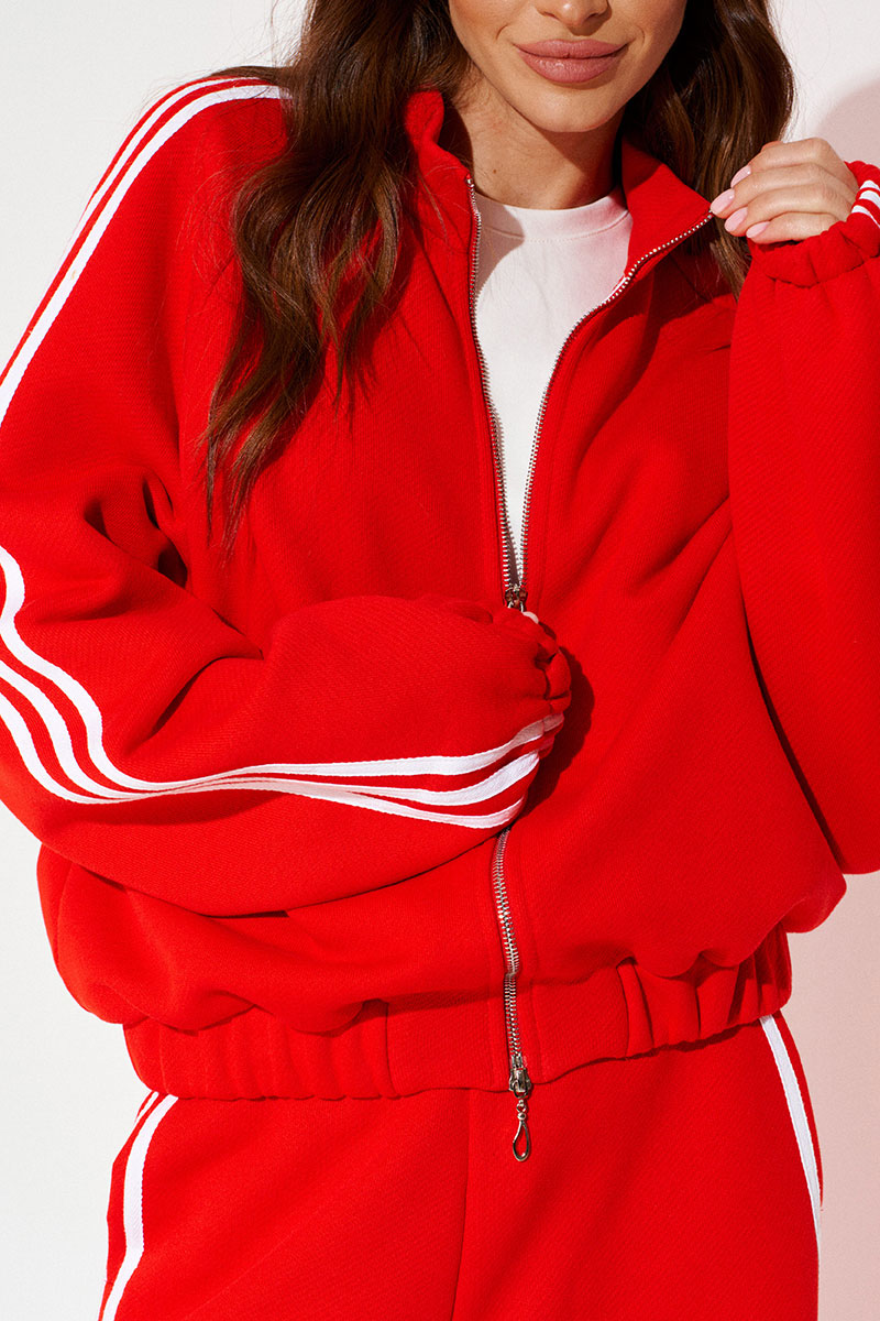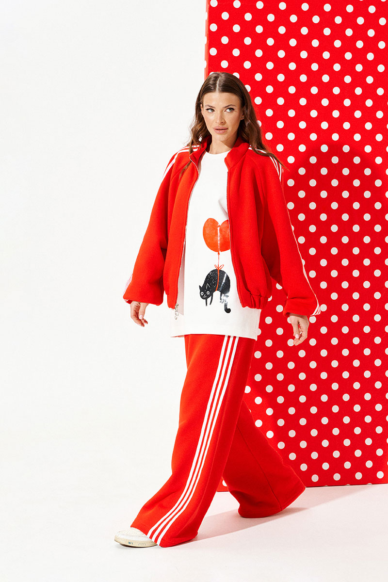 Бомбер из трикотажного полотна свободного объема, прямого силуэта, со спущенной линией плеча, с центральной застежкой на тесьму-молнию. Воротник-стойка. Нижний срез переда и спинки обработан притачной манжетой на резинке. Рукав покроя реглан. Нижний срез рукава на резинке. Рукав декорирован декоративной тесьмой.