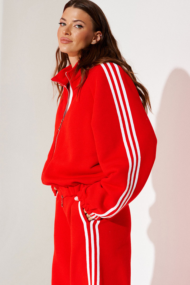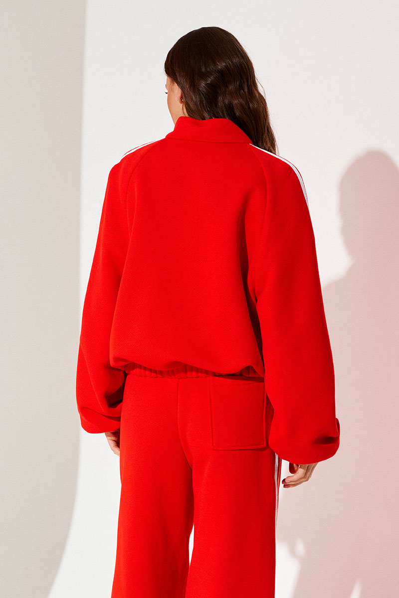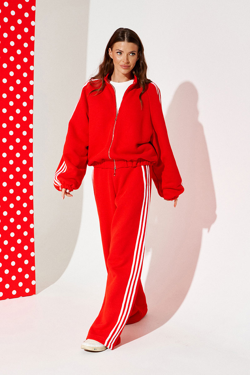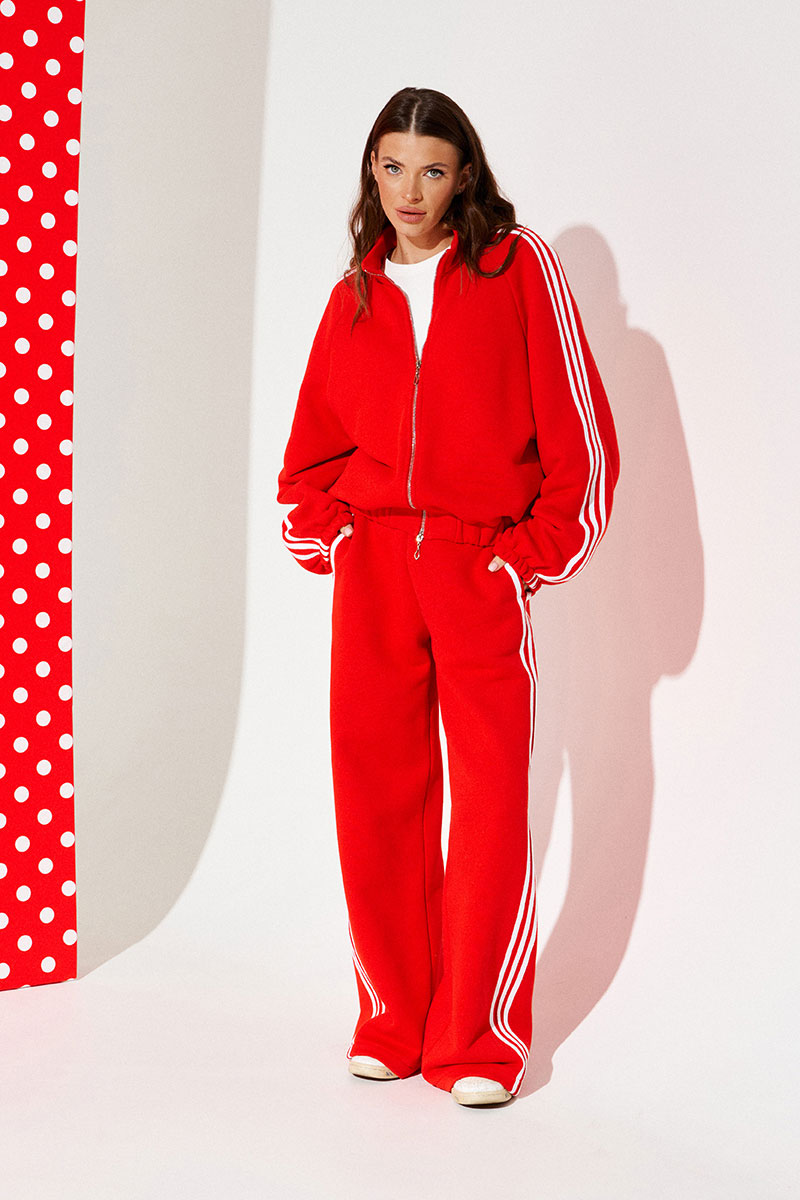 Бомбер из трикотажного полотна свободного объема, прямого силуэта, со спущенной линией плеча, с центральной застежкой на тесьму-молнию. Воротник-стойка. Нижний срез переда и спинки обработан притачной манжетой на резинке. Рукав покроя реглан. Нижний срез рукава на резинке. Рукав декорирован декоративной тесьмой.