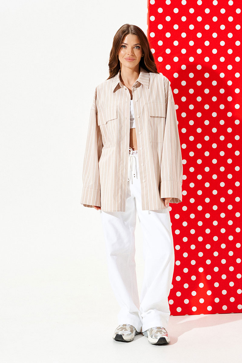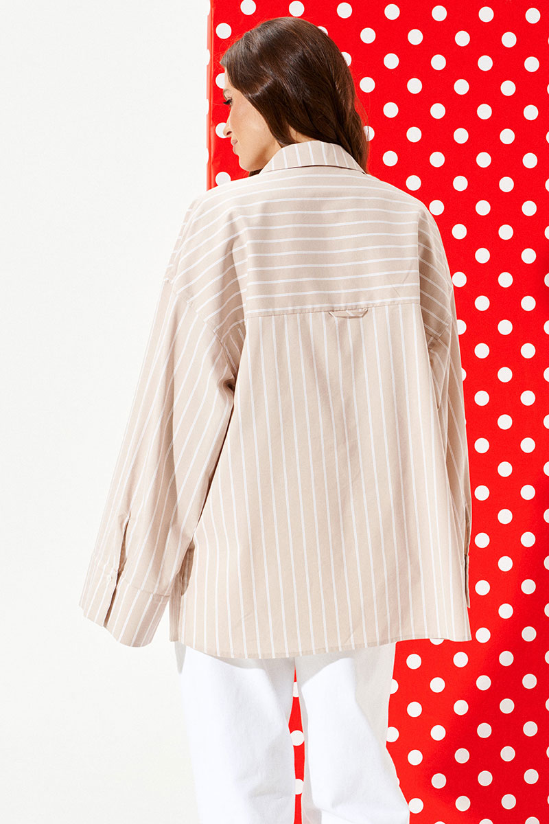 Блузка свободного объема, прямого силуэта, с центральной застежкой на обметанные петли и пуговицы. Воротник «рубашечный» стояче-отложной на отрезной стойке. Детали переда с накладными карманами с клапаном. Спинка с отрезной двойной кокеткой и декоративной шлевкой. Боковые швы заканчиваются разрезом. Рукав втачной, одношовный. Нижний срез рукава обработан притачной манжетой. Застежка манжеты на 1 обметанную петлю и 1 пуговицу.