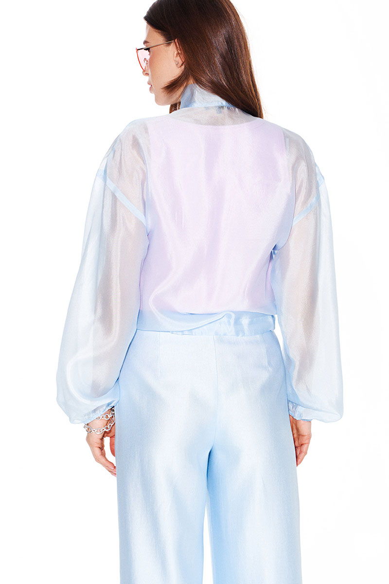 Блуза из трикотажного полотна, полуприлегающего силуэта, с круглым вырезом горловины. Горловина и проймы обработаны притачными бейками.