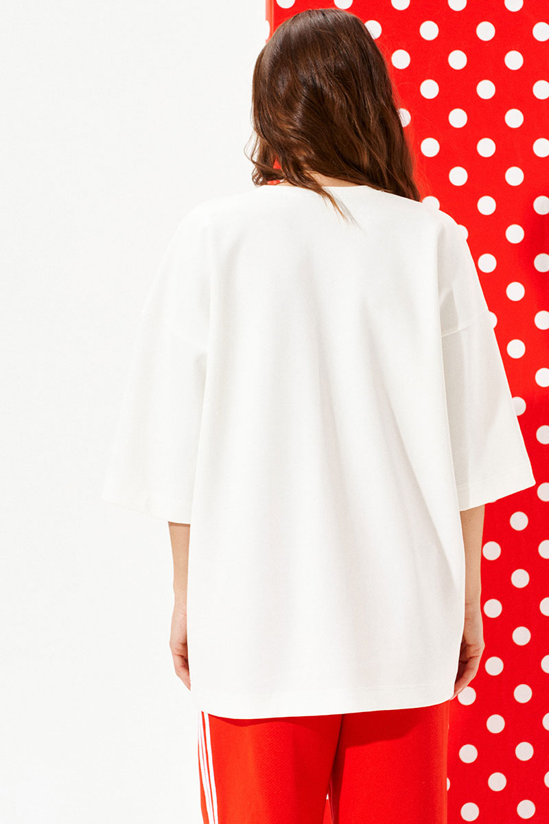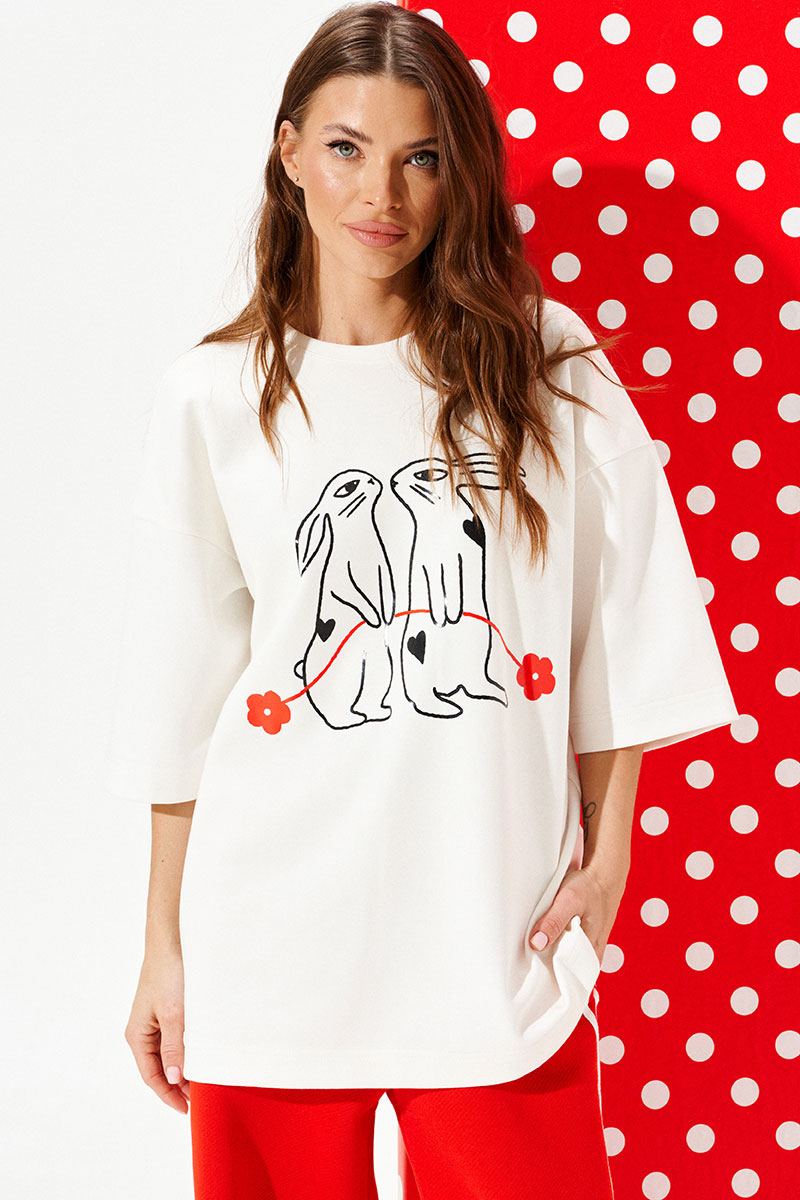 Джемпер из трикотажного полотна свободного объема, прямого силуэта, с круглым вырезом горловины.Перед и спинка цельные. По переду выполнена печать «Зайцы». Рукав втачной, одношовный, короткий.