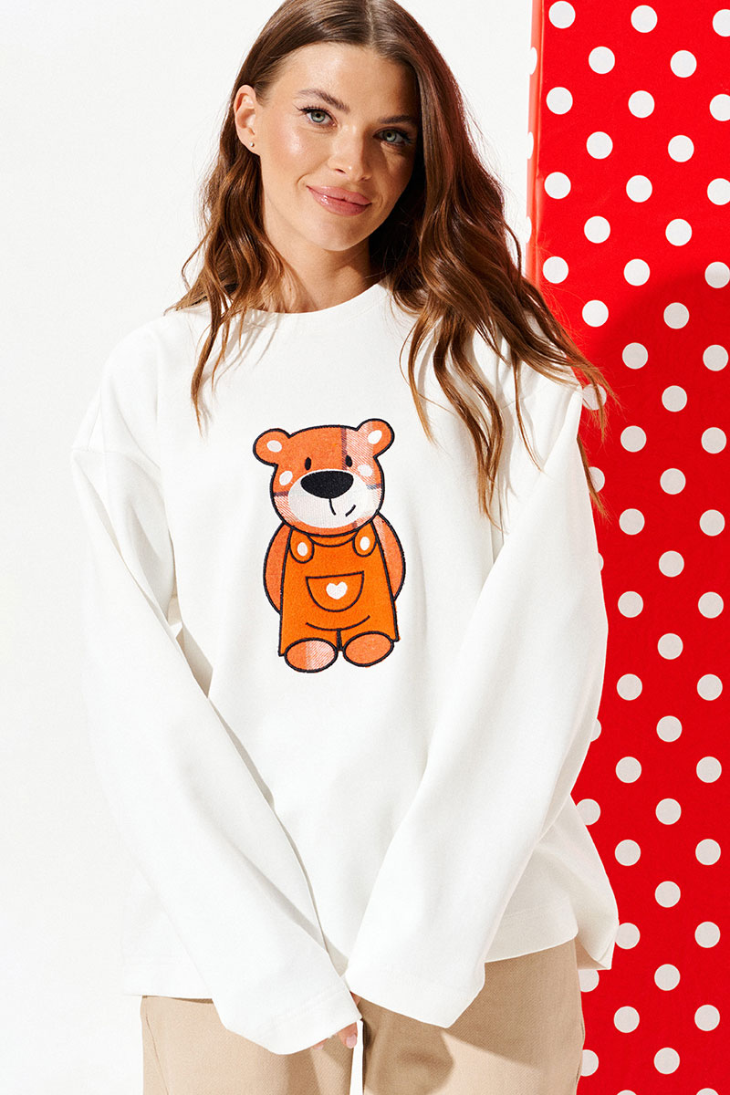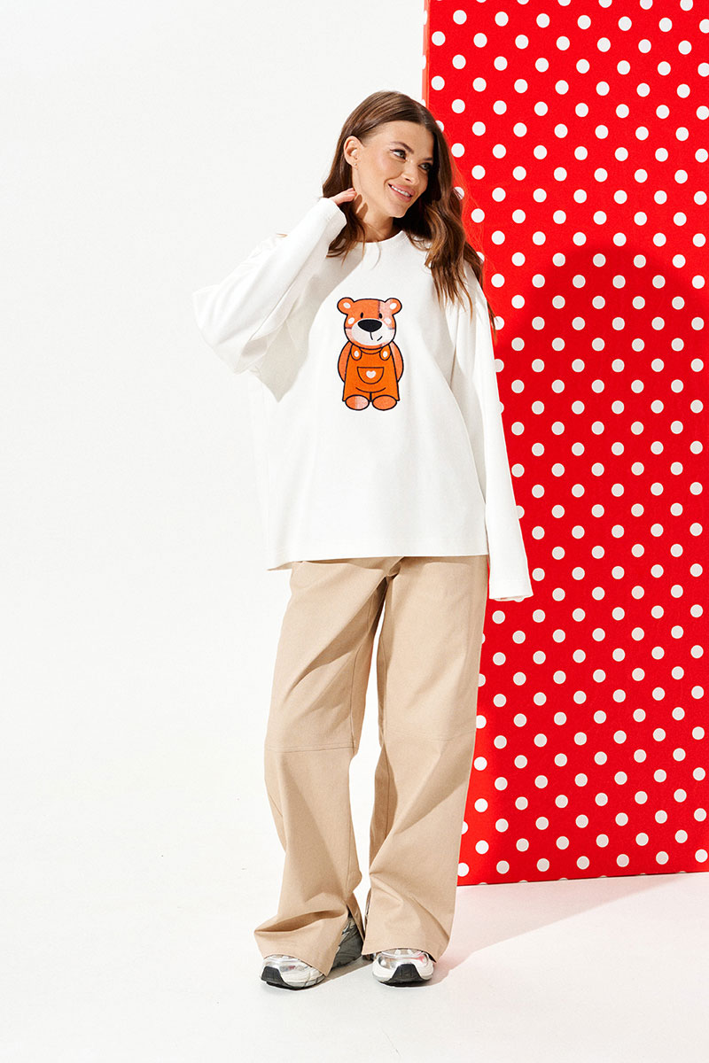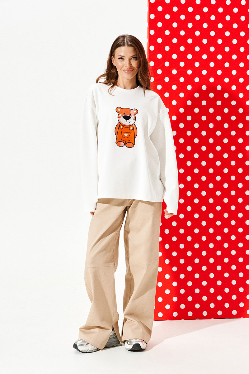 Джемпер из трикотажного полотна свободного объема, прямого силуэта, с круглым вырезом горловины. Вырез горловины обработан притачной обтачкой. Перед и спинка цельные. По переду выполнена вышивка-аппликация «Медвежонок» из контрастных материалов. Рукав втачной, одношовный, длинный.