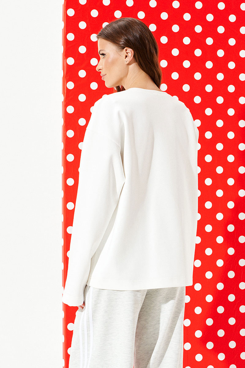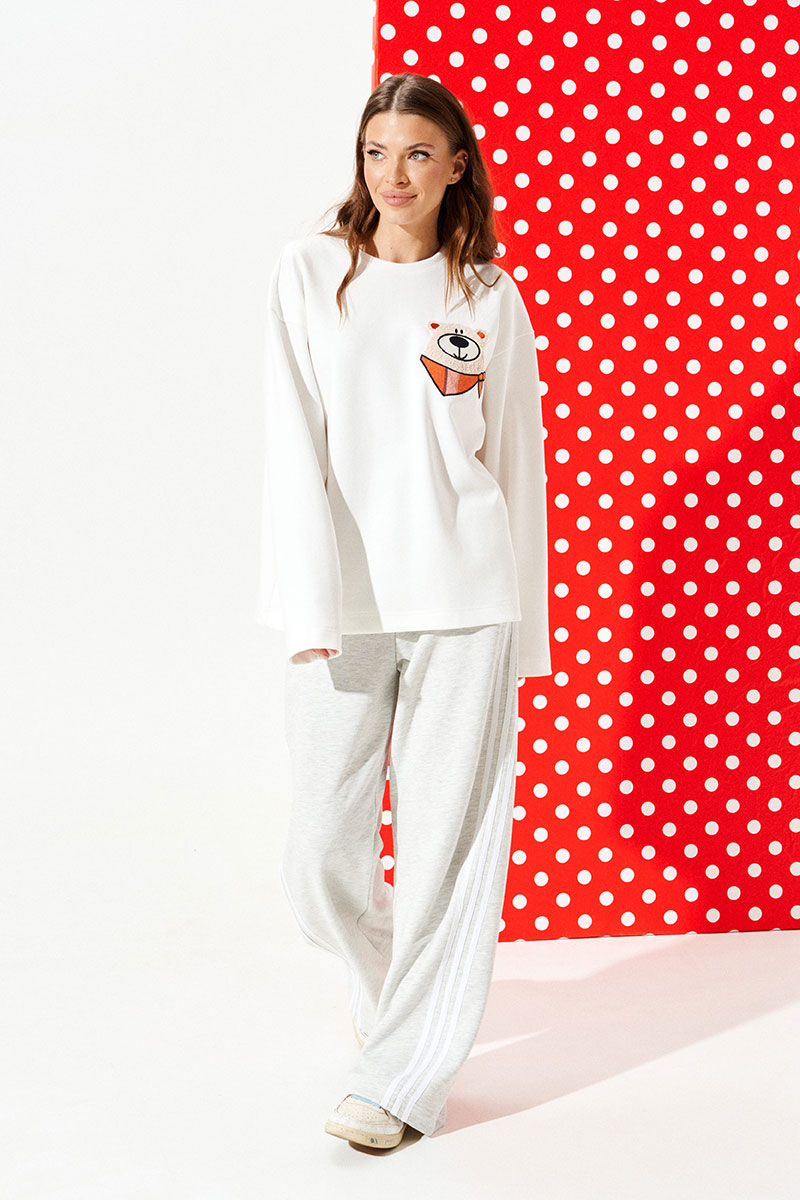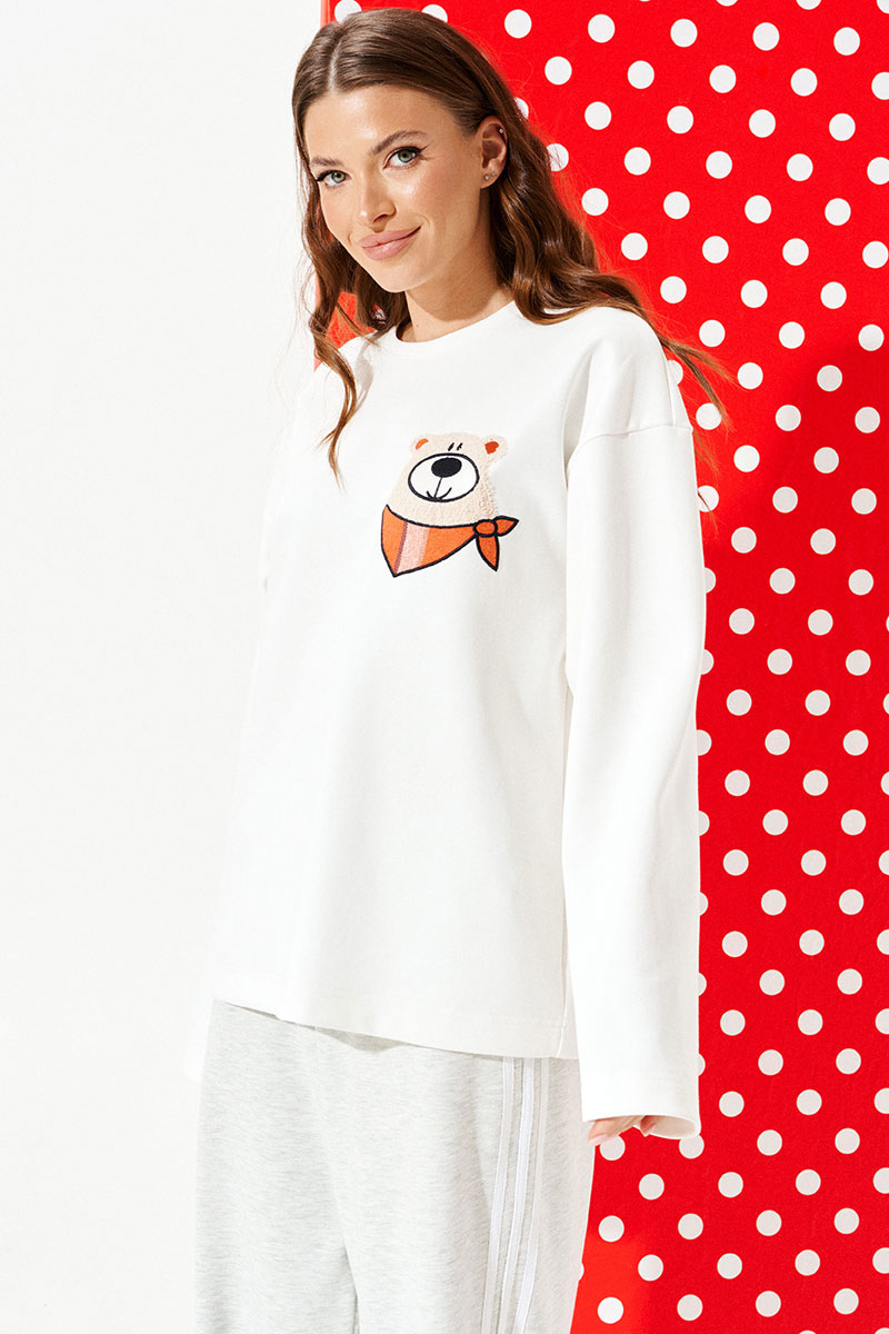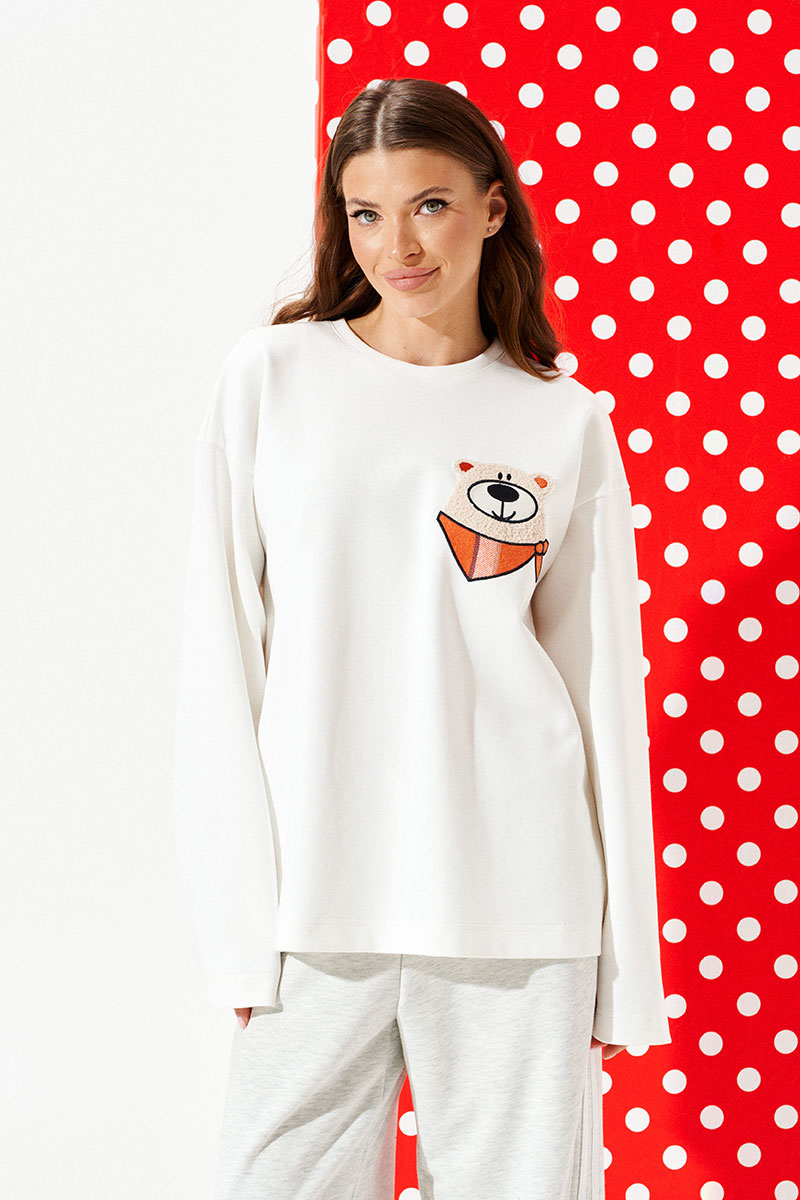 Джемпер из трикотажного полотна свободного объема, прямого силуэта, с круглым вырезом горловины. Вырез горловины обработан притачной обтачкой. Перед и спинка цельные. По переду выполнена вышивка-аппликация «Медвежонок» из контрастных материалов. Рукав втачной, одношовный, длинный.