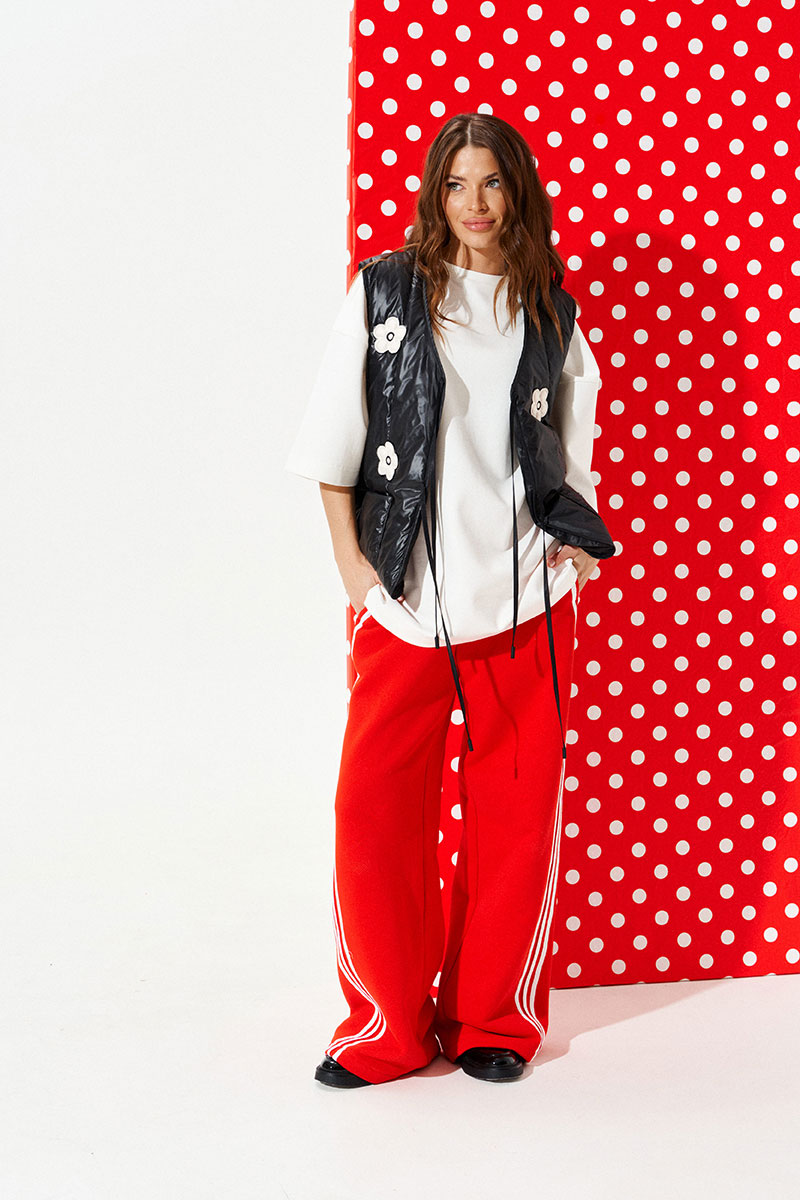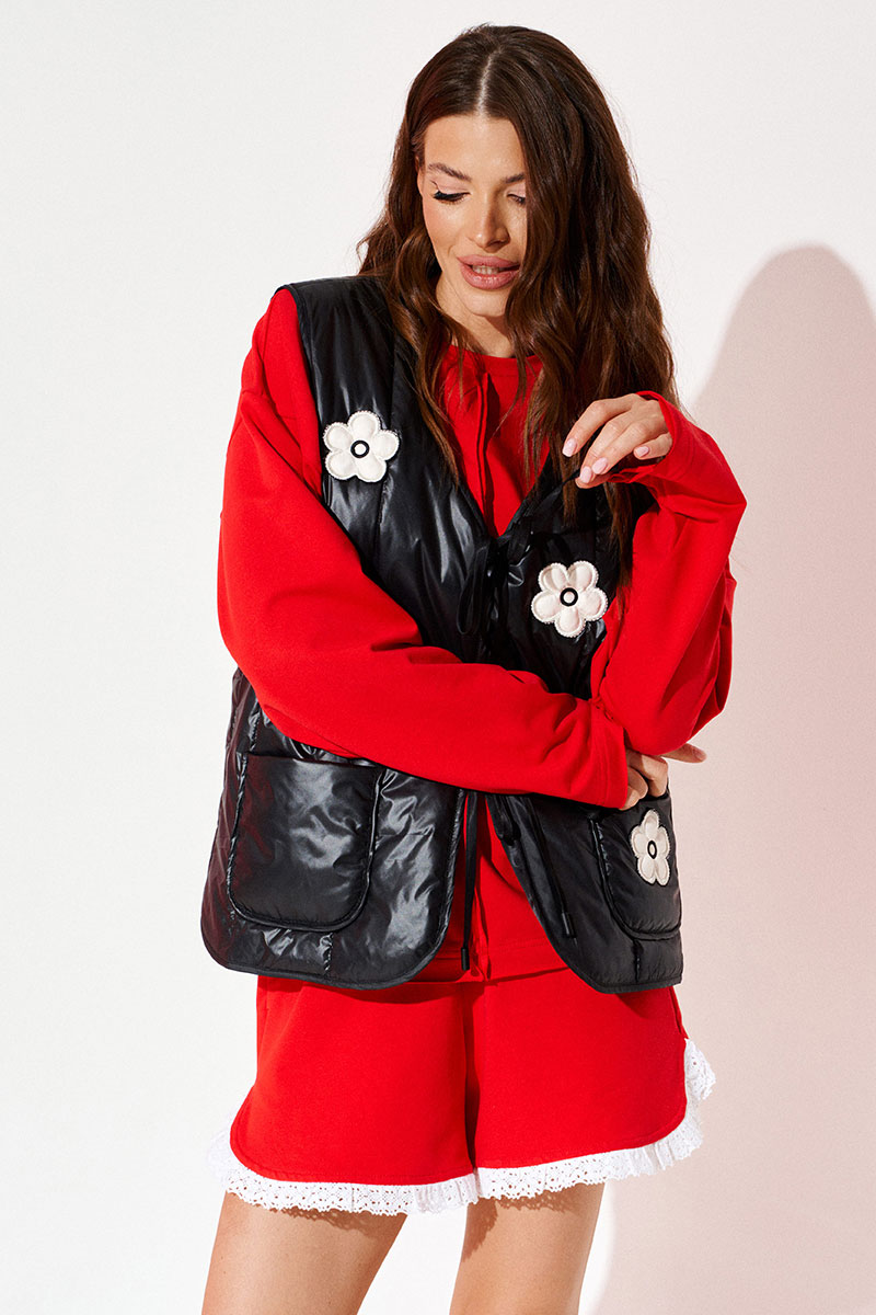 Жилетка из плащевой стеганой ткани с утеплителем изософт 150г/м2, прямая, свободного объема, с V-образным вырезом горловины. Детали переда с накладными карманами и вышивками-аппликациями «Цветы». Спинка цельная. Застежка центральная на завязках. Горловина, борт, рукава и низ жилетки обработаны окантовочной бейкой.