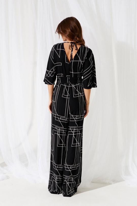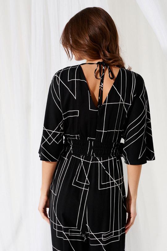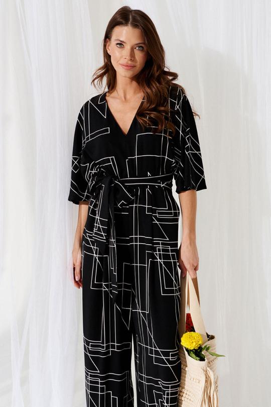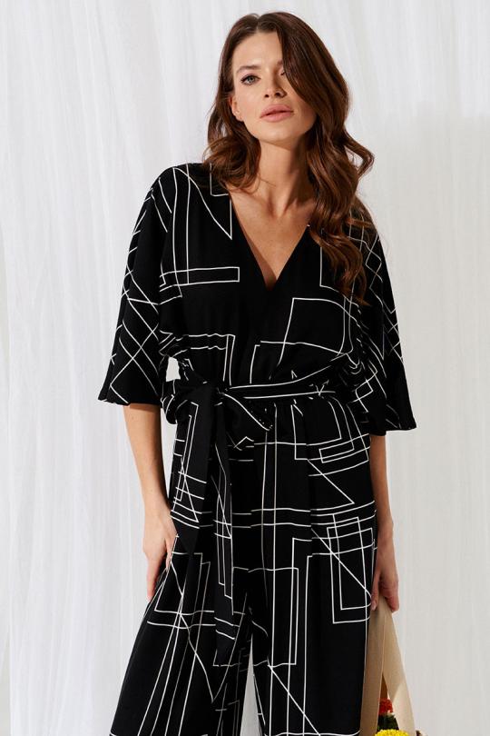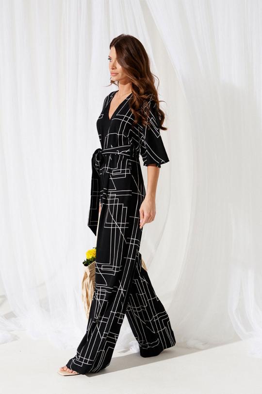 Комбинезон с центральной застежкой на потайную молнию в среднем шве спинки, с V-образным вырезом горловины. В боковых швах расположены карманы. Комбинезон отрезной по линии талии, шов по талии присборен на резинку. Вырез горловины спинки с завязками, расположенными ниже плечевого шва. Рукав 3/4.