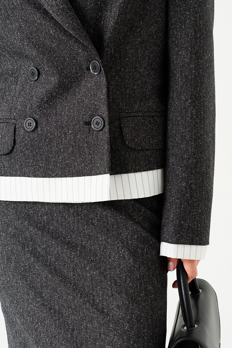 Укороченный жакет прямого кроя, с центральной двухбортной застежкой на петли и пуговицы, отложным воротником и лацканами пиджачного типа, на подкладке. По переду накладные карманы с клапаном и талиевые вытачки. Спинка со средним швом. Рукав втачной, длинный. По низу изделия и рукавов планка из ткани в полоску.
