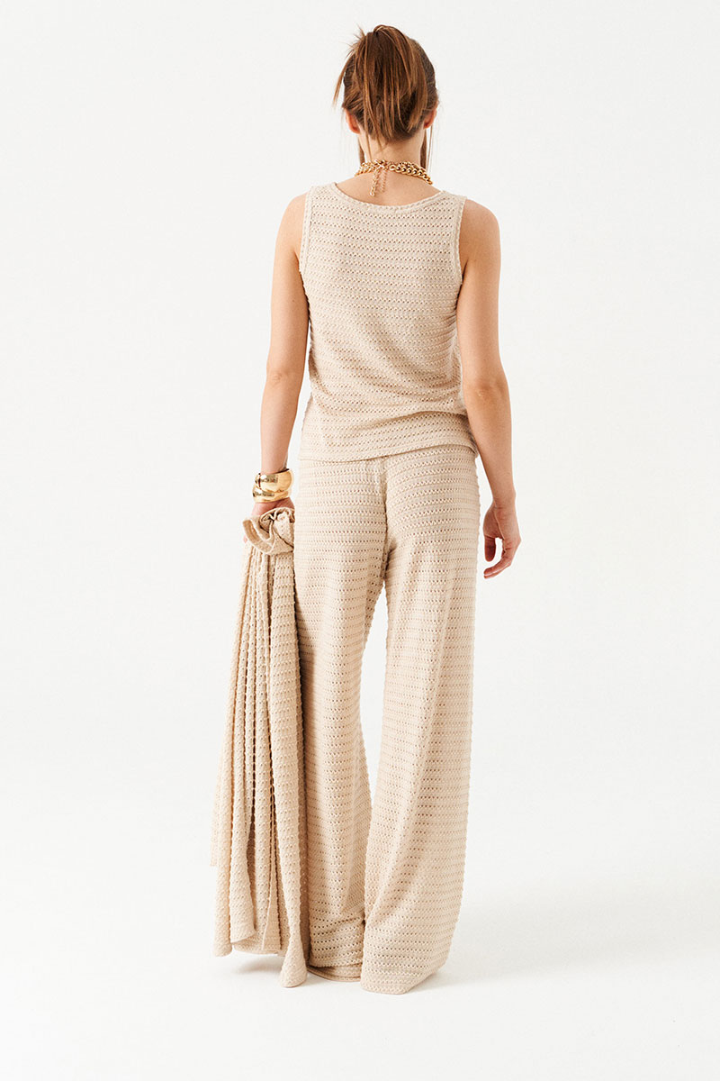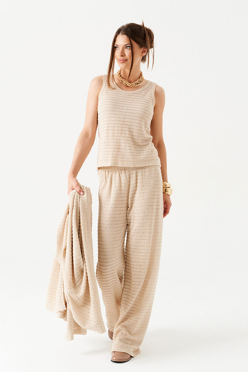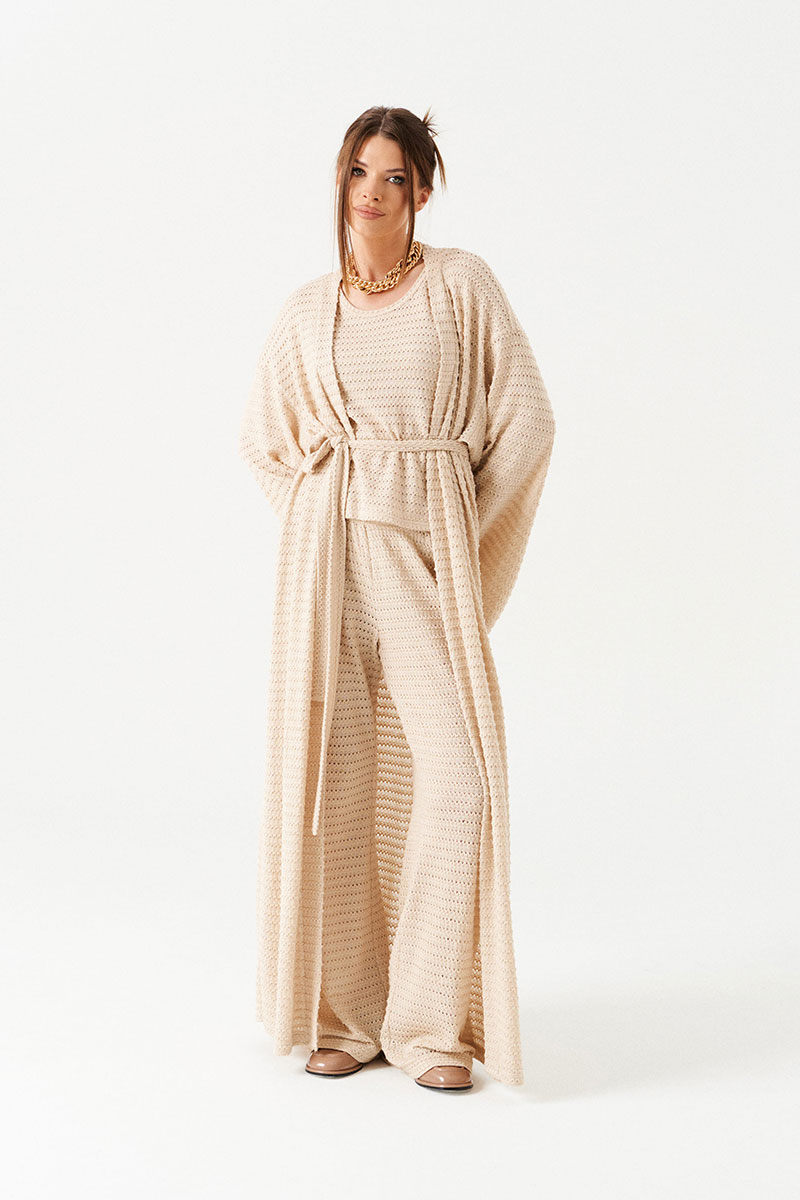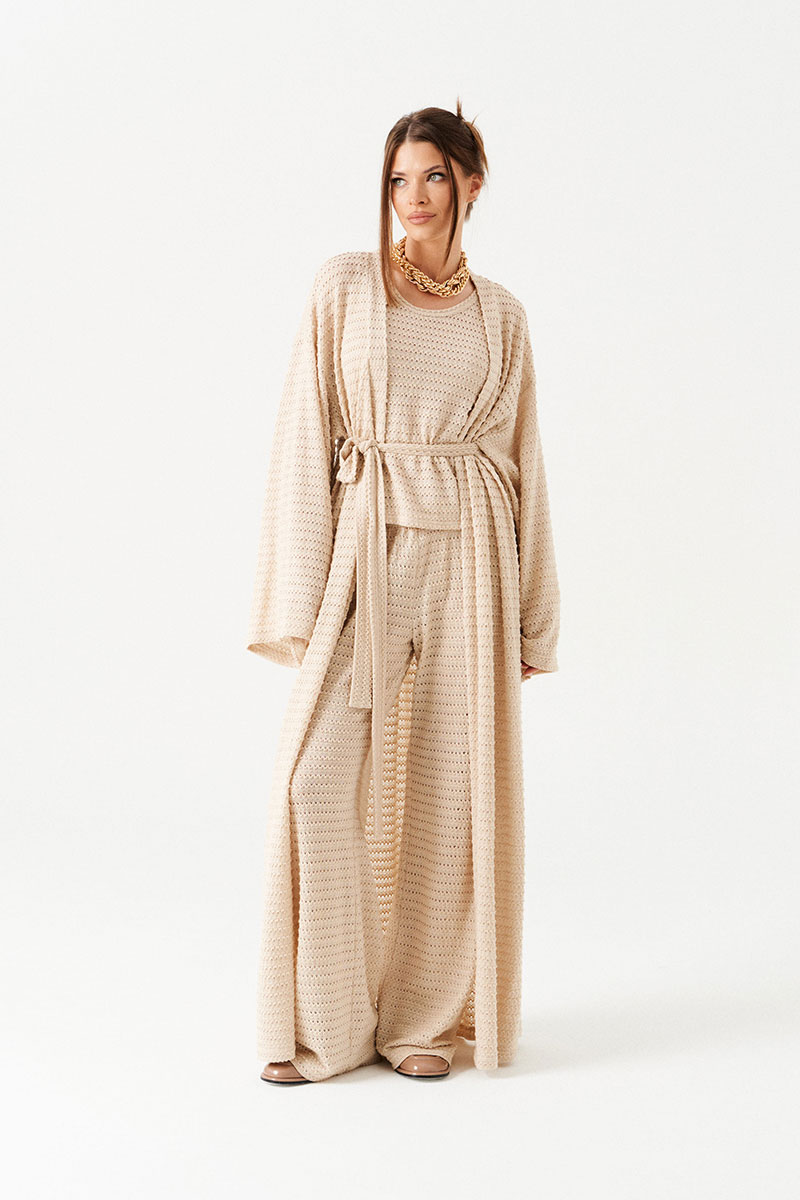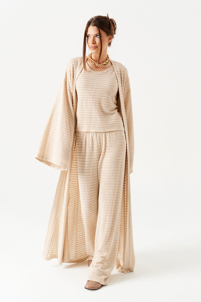 Комплект женский 3-предметный из трикотажного полотна, состоящий из блузы-топа, брюк и кардигана.