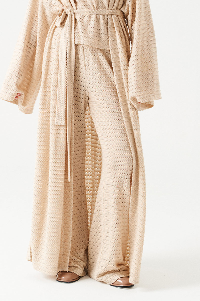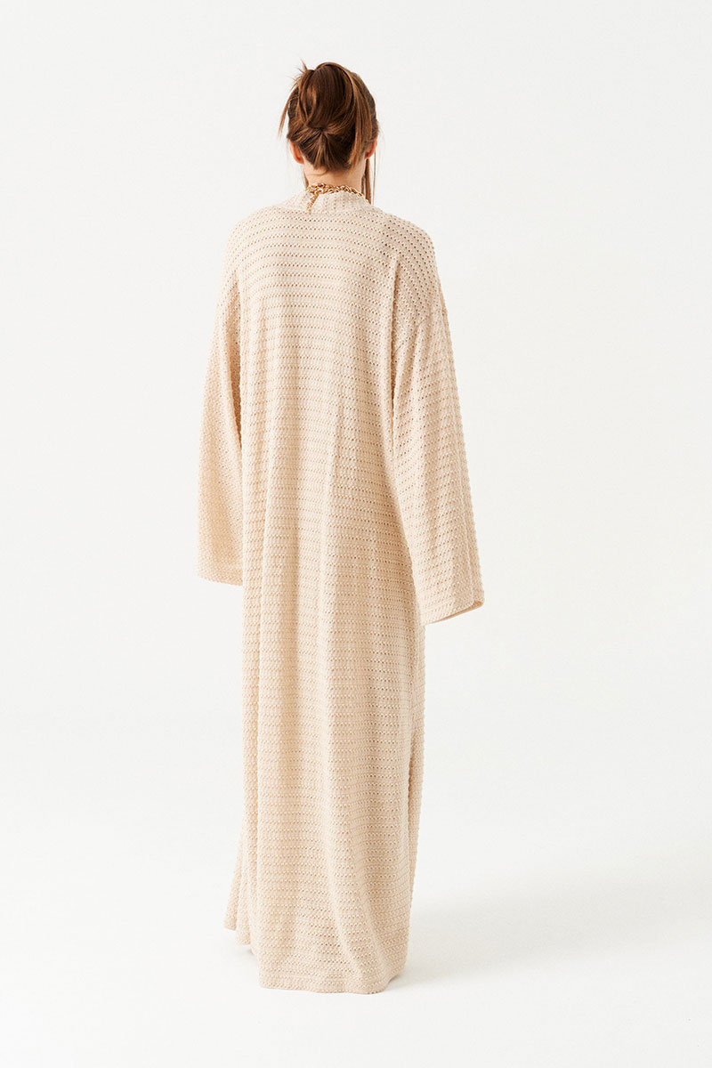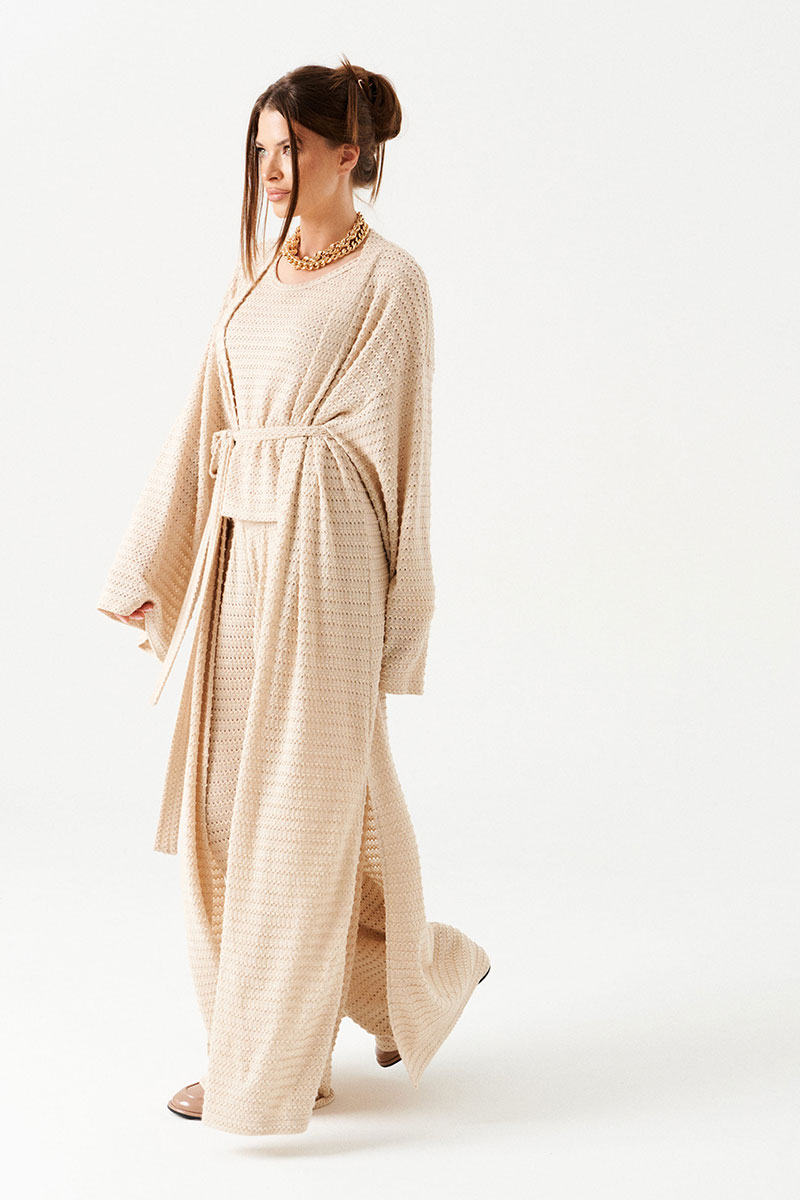 Кардиган прямой со съемным поясом из основной ткани. Вырез горловины и борта обработаны цельнокроеной планкой. Боковые швы заканчиваются разрезом. Рукав широкий, длинный. Длина – макси.