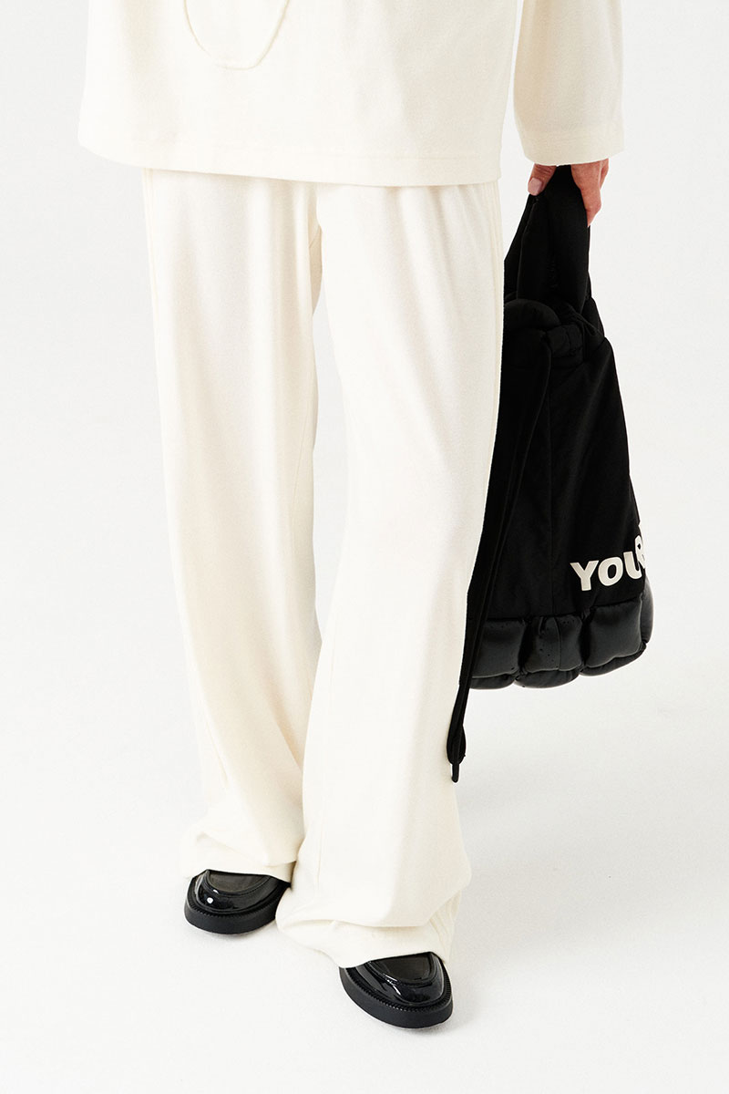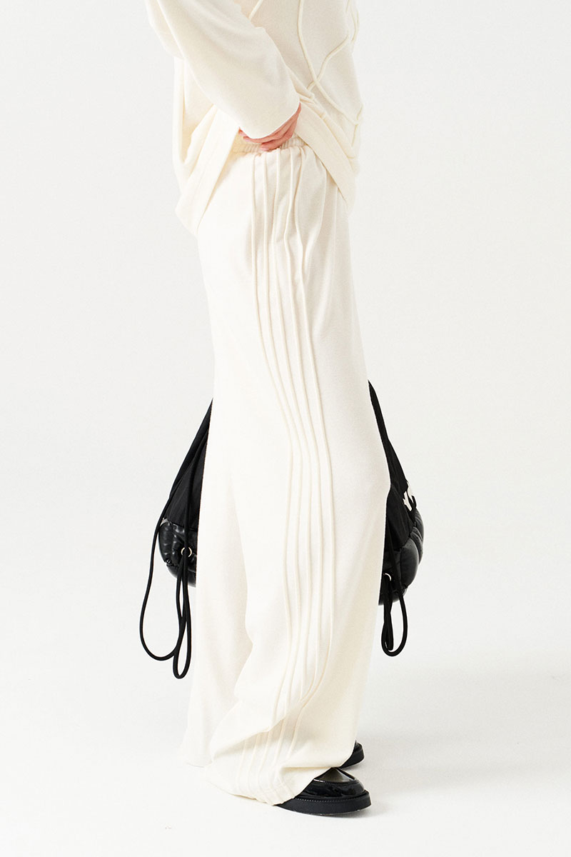Брюки прямые, свободные, одношовные, с защипами по бокам. Пояс цельнокроеный, на резинке.