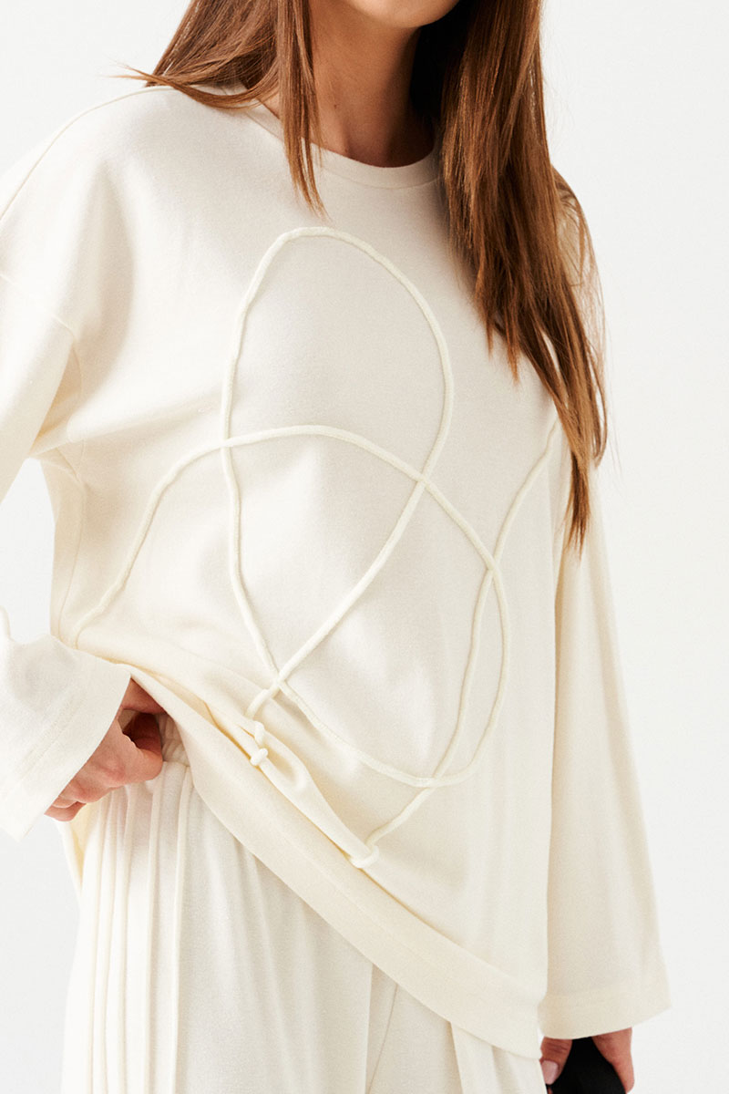 Джемпер прямой, свободный, со спущенной линией плеча, с вышивкой по переду. Вырез горловины округлой формы. Перед и спинка цельные. Рукав втачной, длинный.