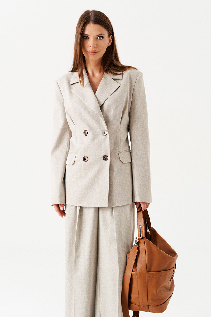 Жакет полуприлегающего силуэта, на подкладке, с центральной двубортной застежкой на петли и пуговицы, отложным воротником и лацканами пиджачного типа. По переду – прорезные карманы с клапанами и двумя обтачками, талиевые вытачки, переходящие в встречную складку. Спинка со средним швом, рельефами, выходящими из проймы. На уровне линии талии заложены встречные складки. Рукав двухшовный, длинный.