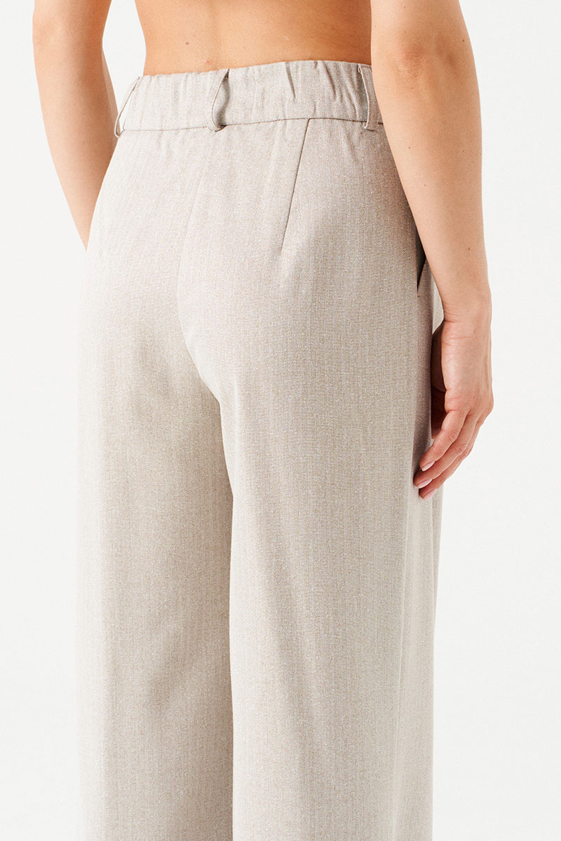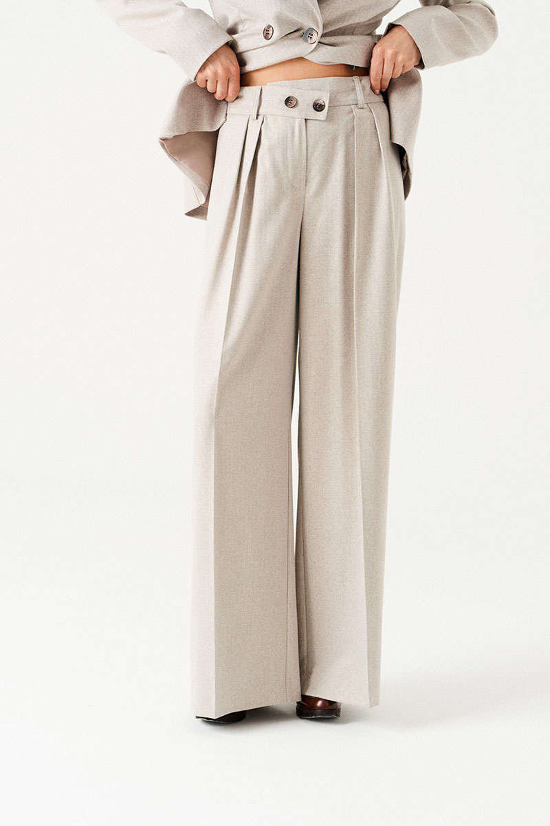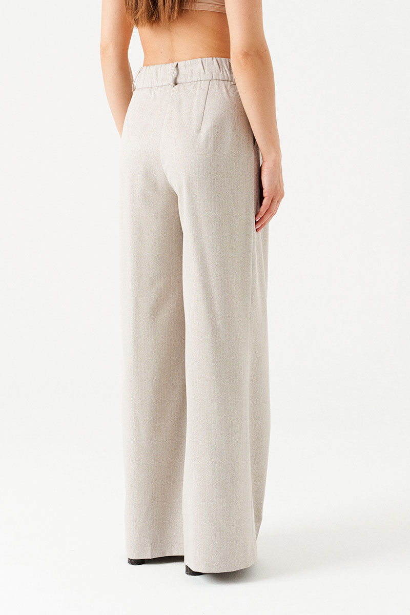 Брюки-палаццо, прямые, со смещенной застежкой. На передних половинках заложены по 2 складки, боковые карманы с отрезным бочком. Застежка брюк – гульфик на молнии. На задних половинках талиевые вытачки. Пояс притачной, со шлевками и частично с резинкой, застегивается на 2 петли и 2 пуговицы.