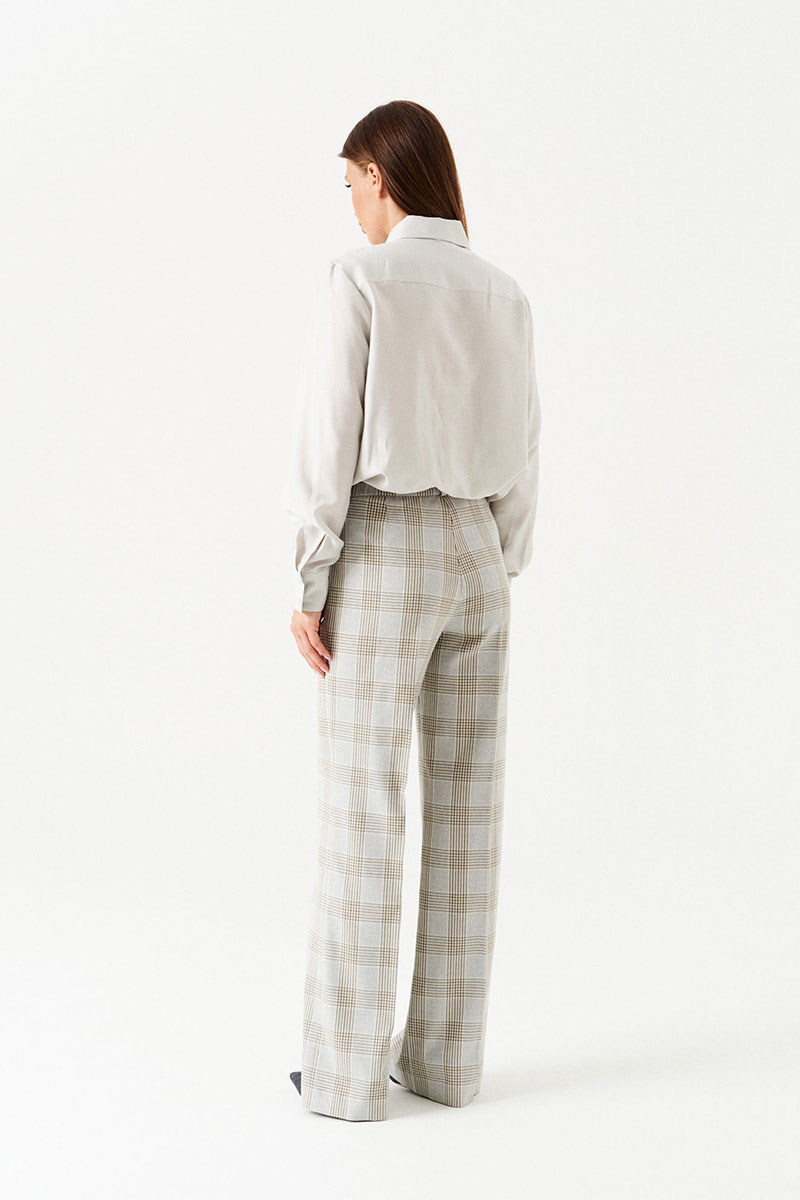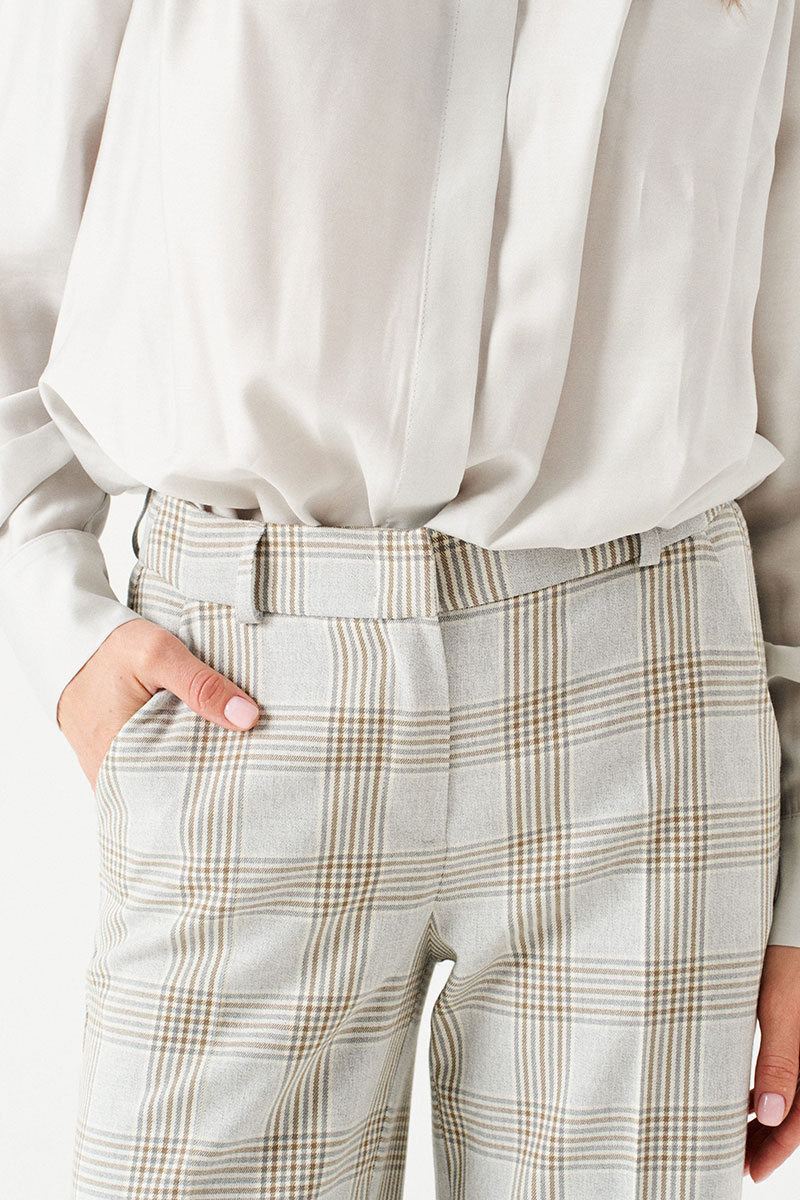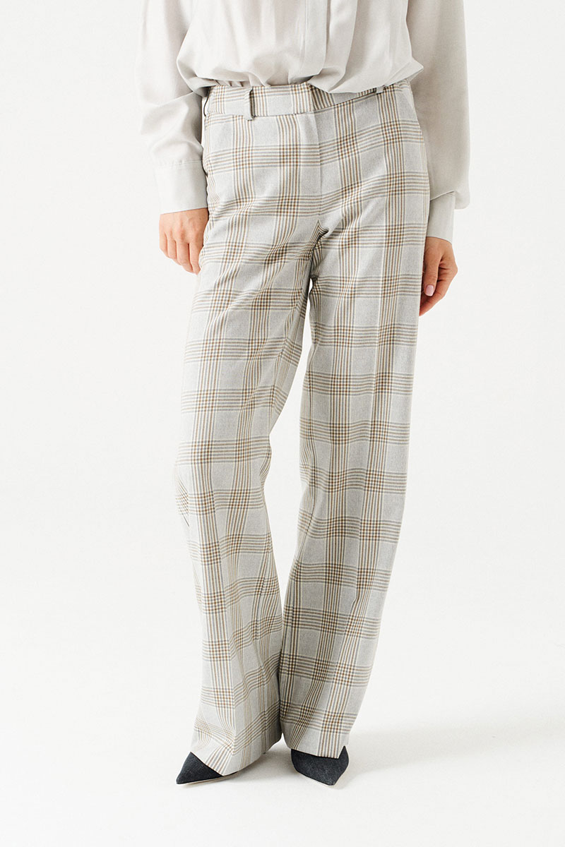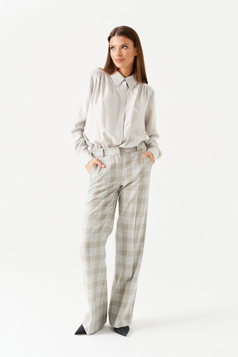 Брюки прямые, классической длины, с заутюженными стрелками. По переду боковые карманы с отрезным бочком. Застежка брюк – гульфик на молнии. По задним половинкам талиевые вытачки. Пояс притачной, со шлевками, частично с резинкой, застегивается на крючок и потайную пуговицу.