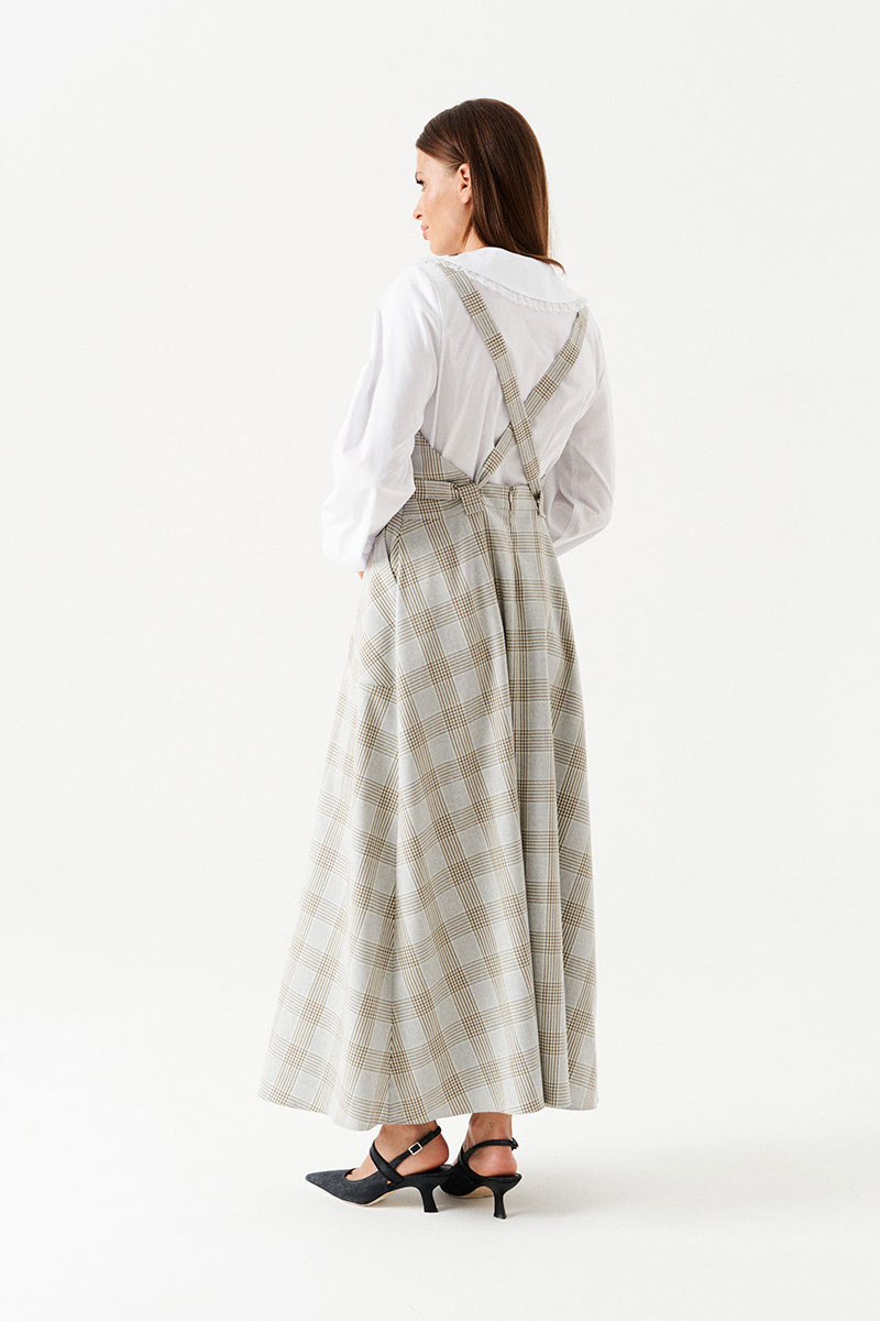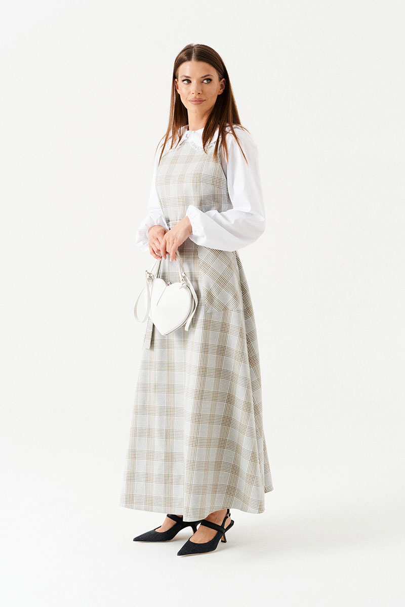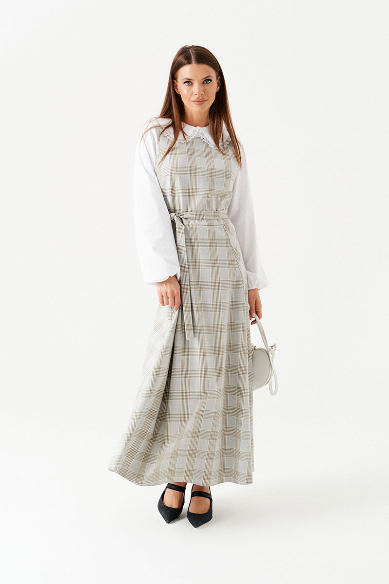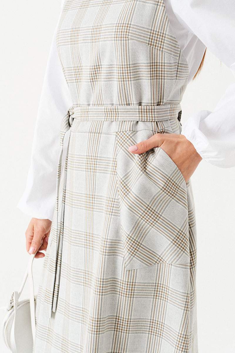 Сарафан с открытой спиной, отрезной, длинный. Нижняя часть сарафана расклешенная. Перед с круглым вырезом горловины, нагрудными вытачками, накладными карманами. На поясе по спинке расположены шлевки для регулировки длины лямок. В среднем шве спинки застежка на потайную молнию.