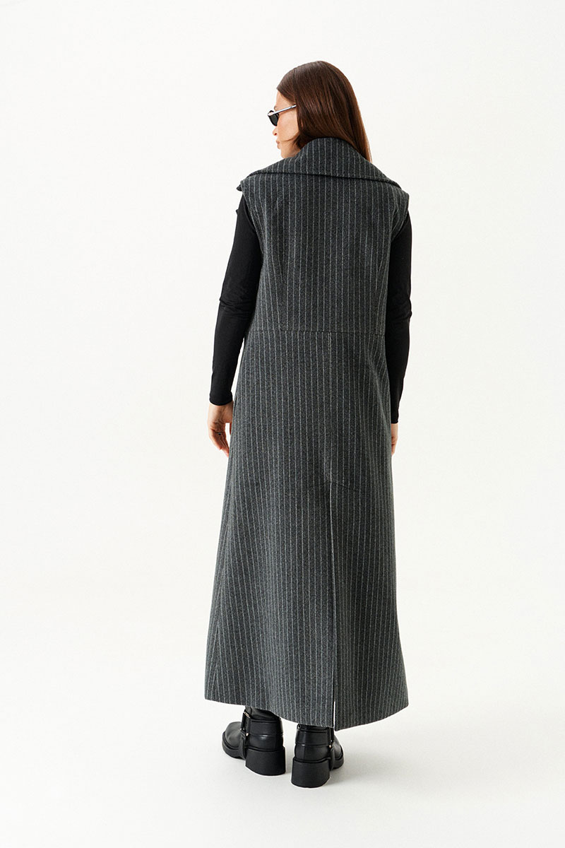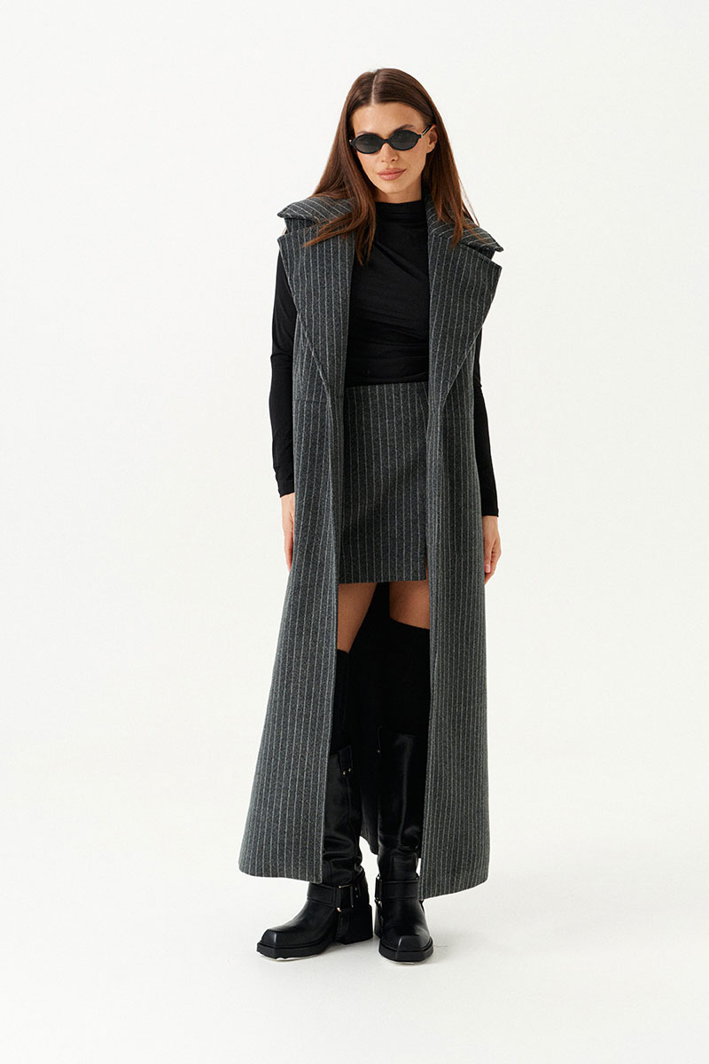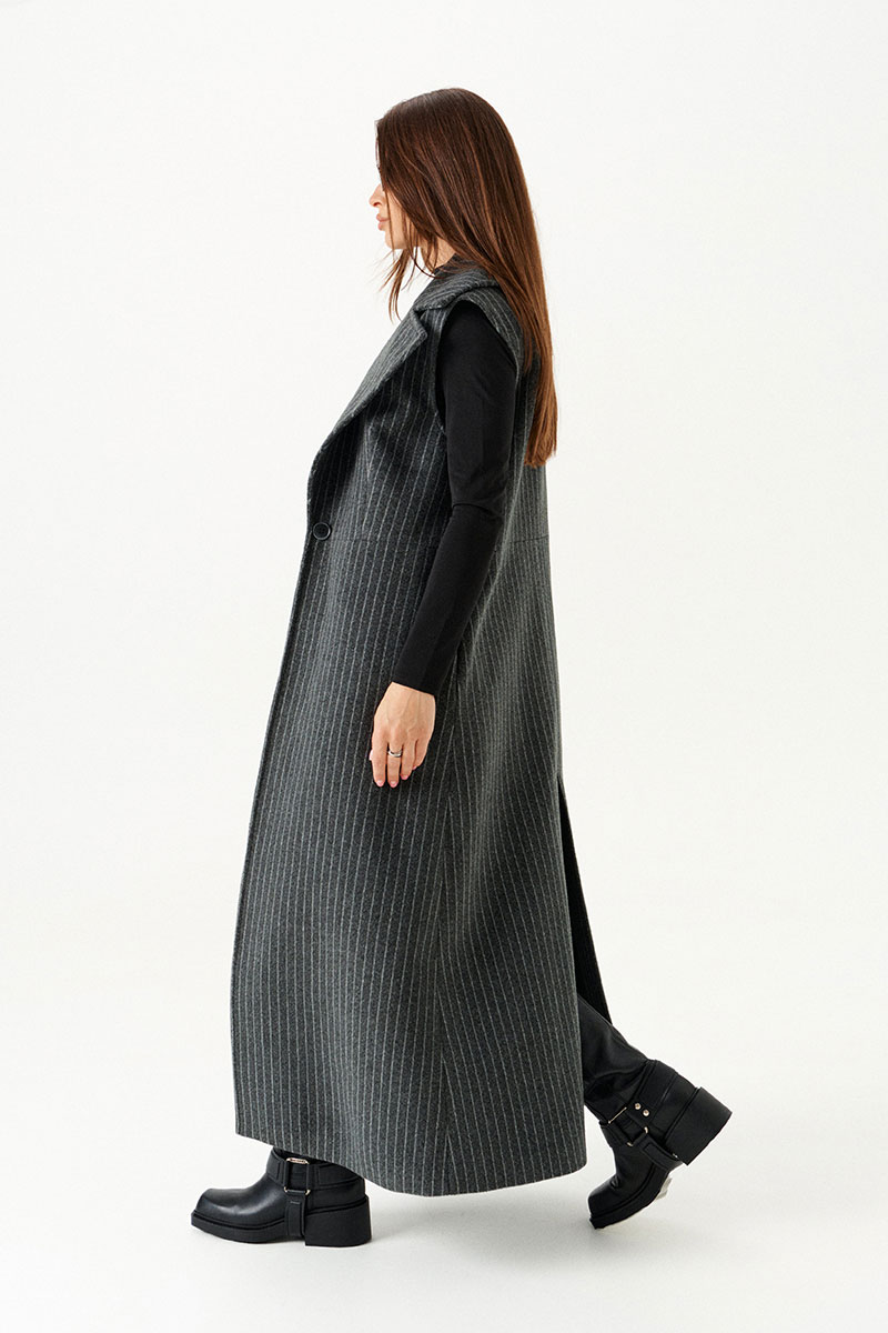 Жилет полуприлегающего силуэта на подкладке, с центральной застежкой на 1 петлю и 1 пуговицу, отрезной на уровне линии талии, отложным воротником и лацканами. Полочки с талиевыми вытачками. Нижняя часть спинки со средним швом и шлицей. Длина изделия до щиколотки.