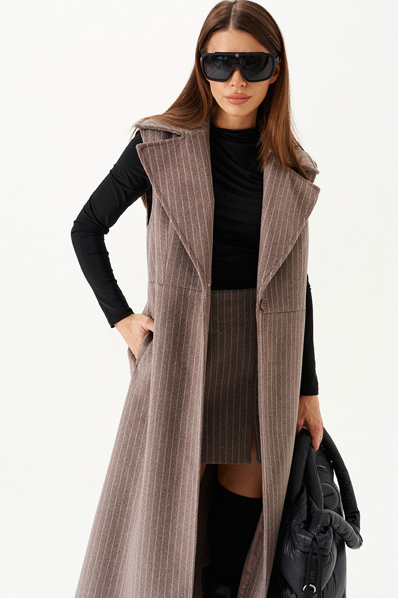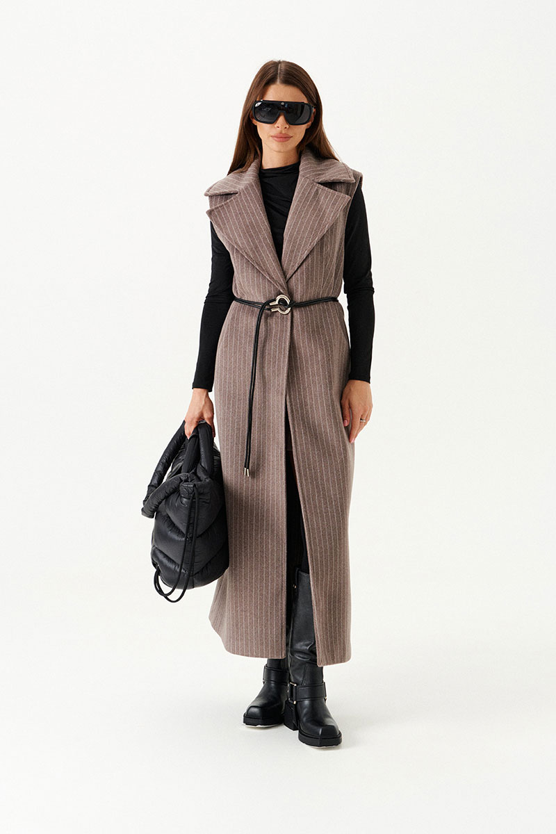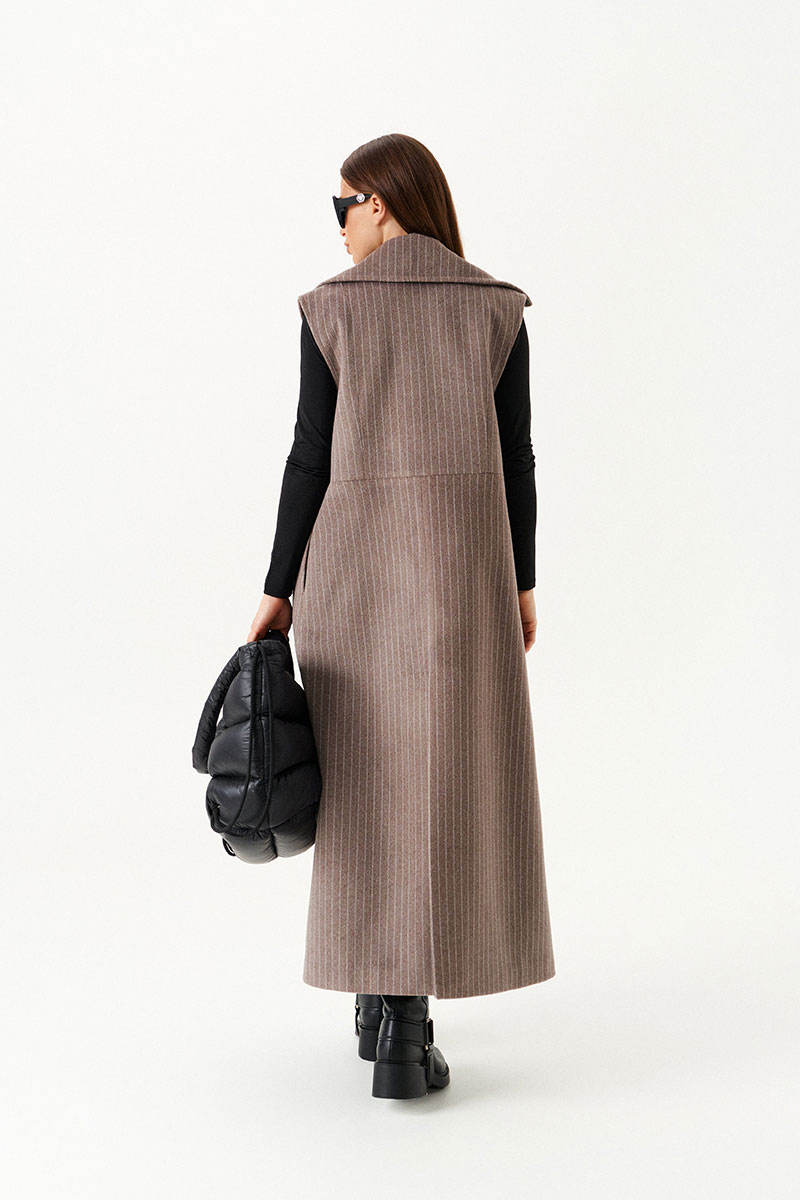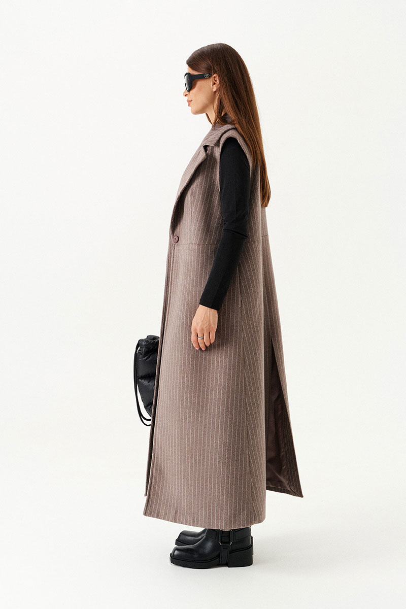 Жилет полуприлегающего силуэта на подкладке, с центральной застежкой на 1 петлю и 1 пуговицу, отрезной на уровне линии талии, отложным воротником и лацканами. Полочки с талиевыми вытачками. Нижняя часть спинки со средним швом и шлицей. Длина изделия до щиколотки.