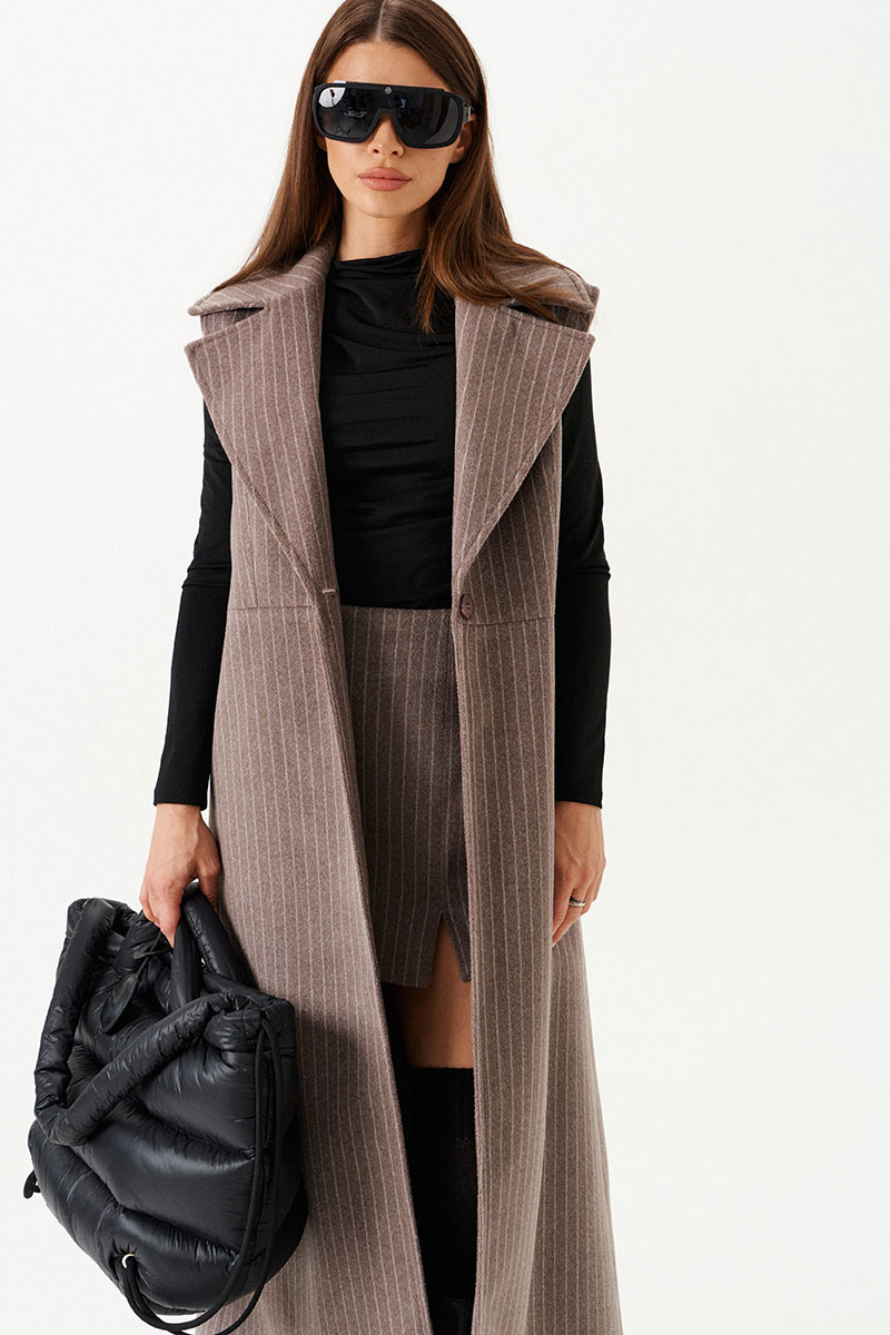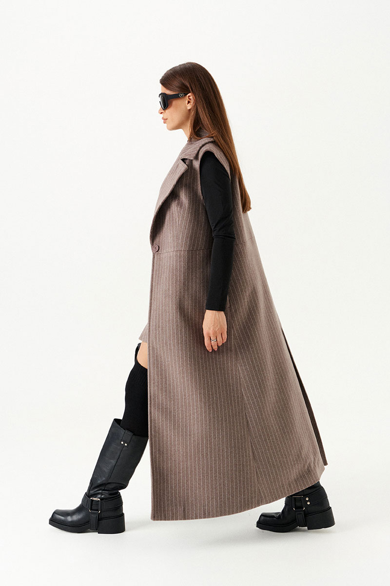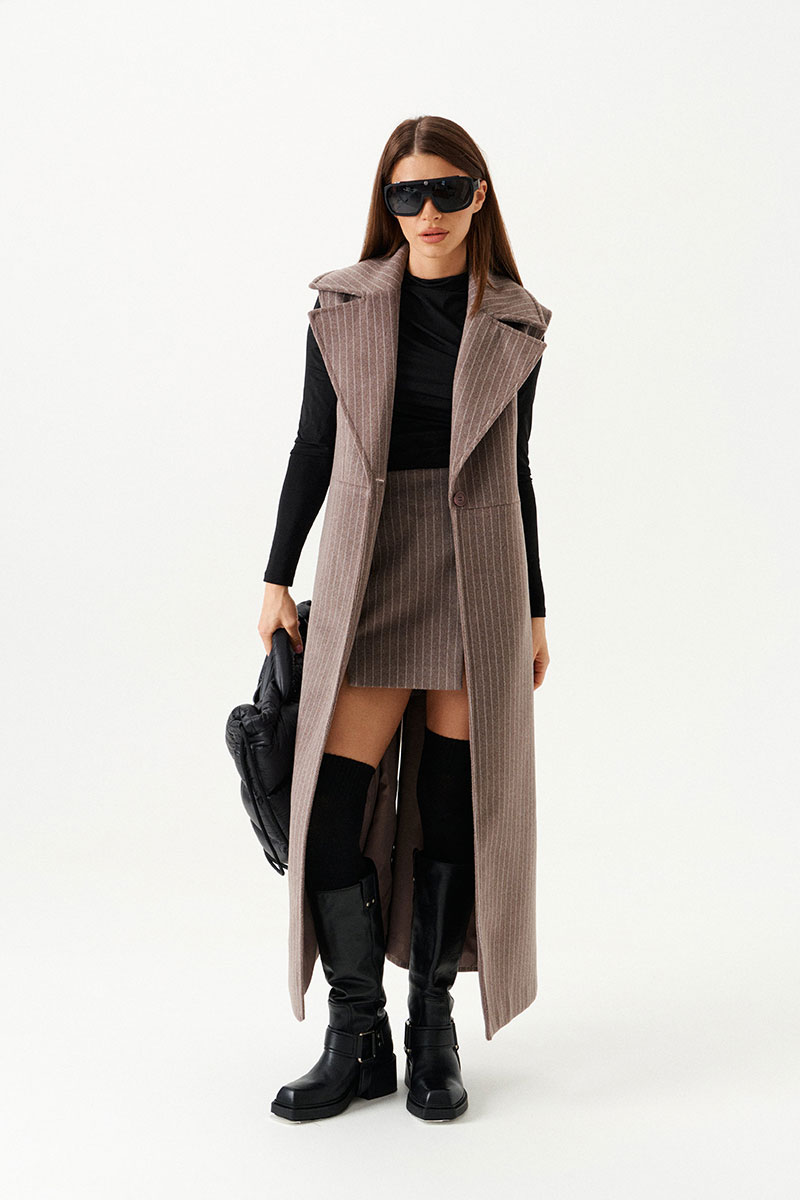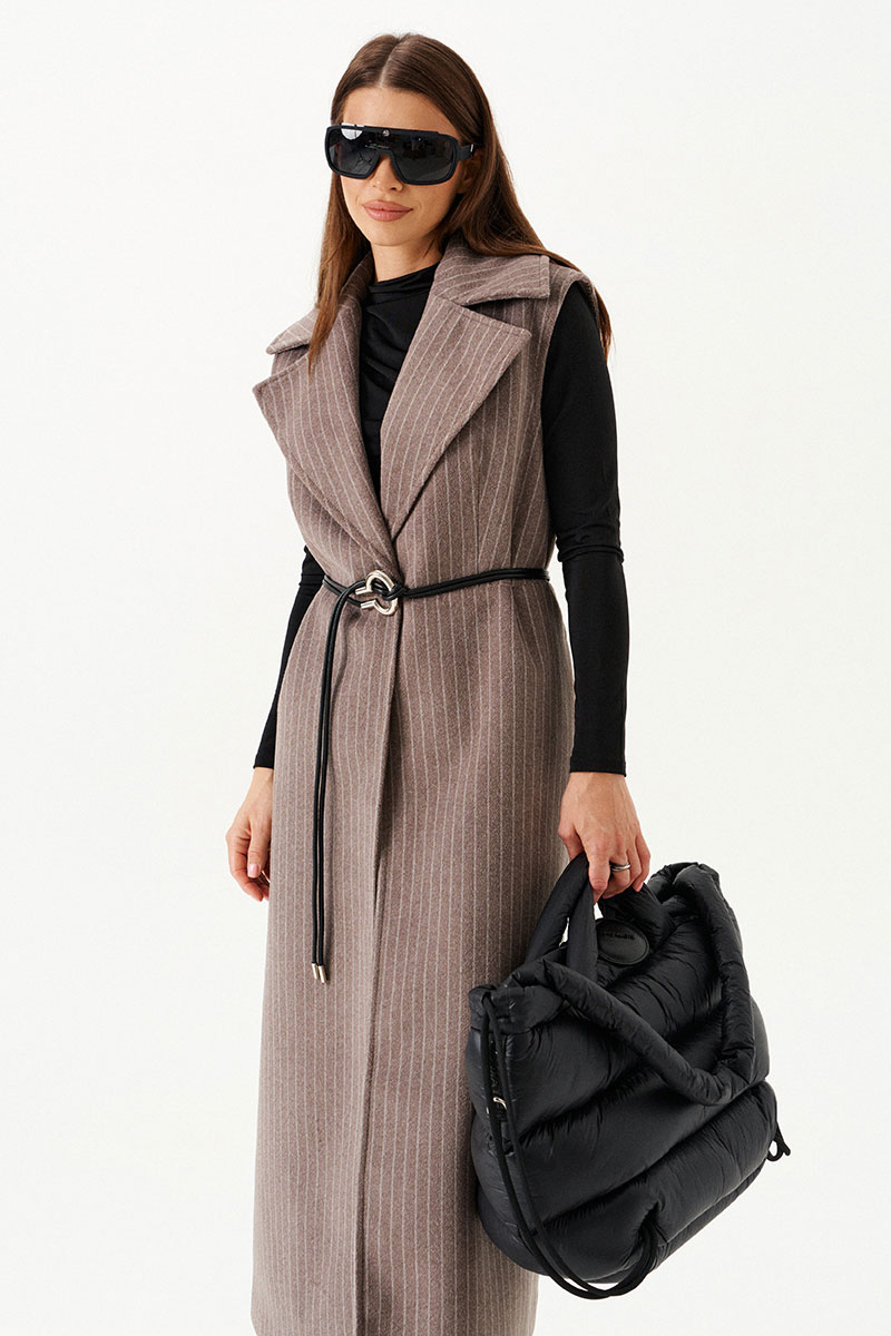 Жилет полуприлегающего силуэта на подкладке, с центральной застежкой на 1 петлю и 1 пуговицу, отрезной на уровне линии талии, отложным воротником и лацканами. Полочки с талиевыми вытачками. Нижняя часть спинки со средним швом и шлицей. Длина изделия до щиколотки.