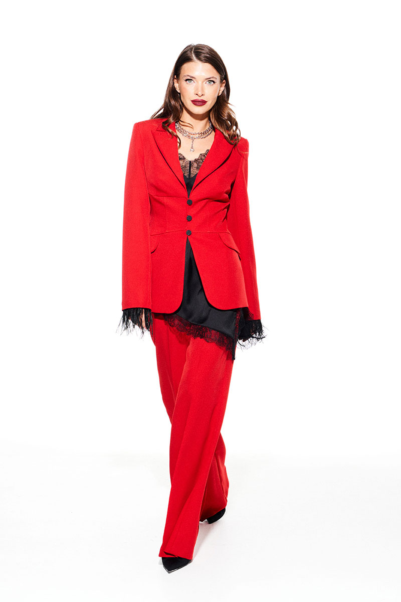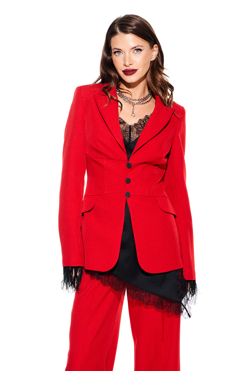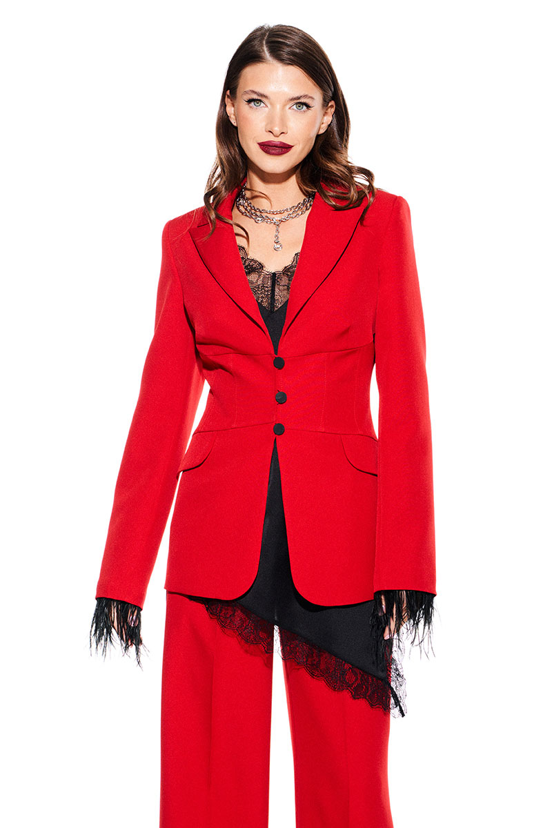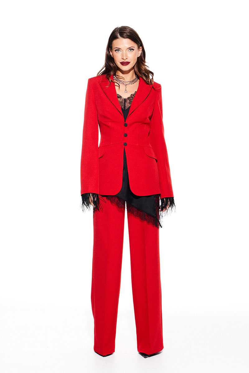 Жакет приталенного силуэта, с отложным воротником и лацканами пиджачного типа, с центральной застежкой на 3 навесные петли и 3 пуговицы, на подкладке. Перед отрезной, с рельефами, нагрудными вытачками, имитацией кармана с клапаном. Спинка со средним швом и рельефами. Рукав втачной, двухшовный, длинный. Низ рукава со съемной тесьмой из перьев.