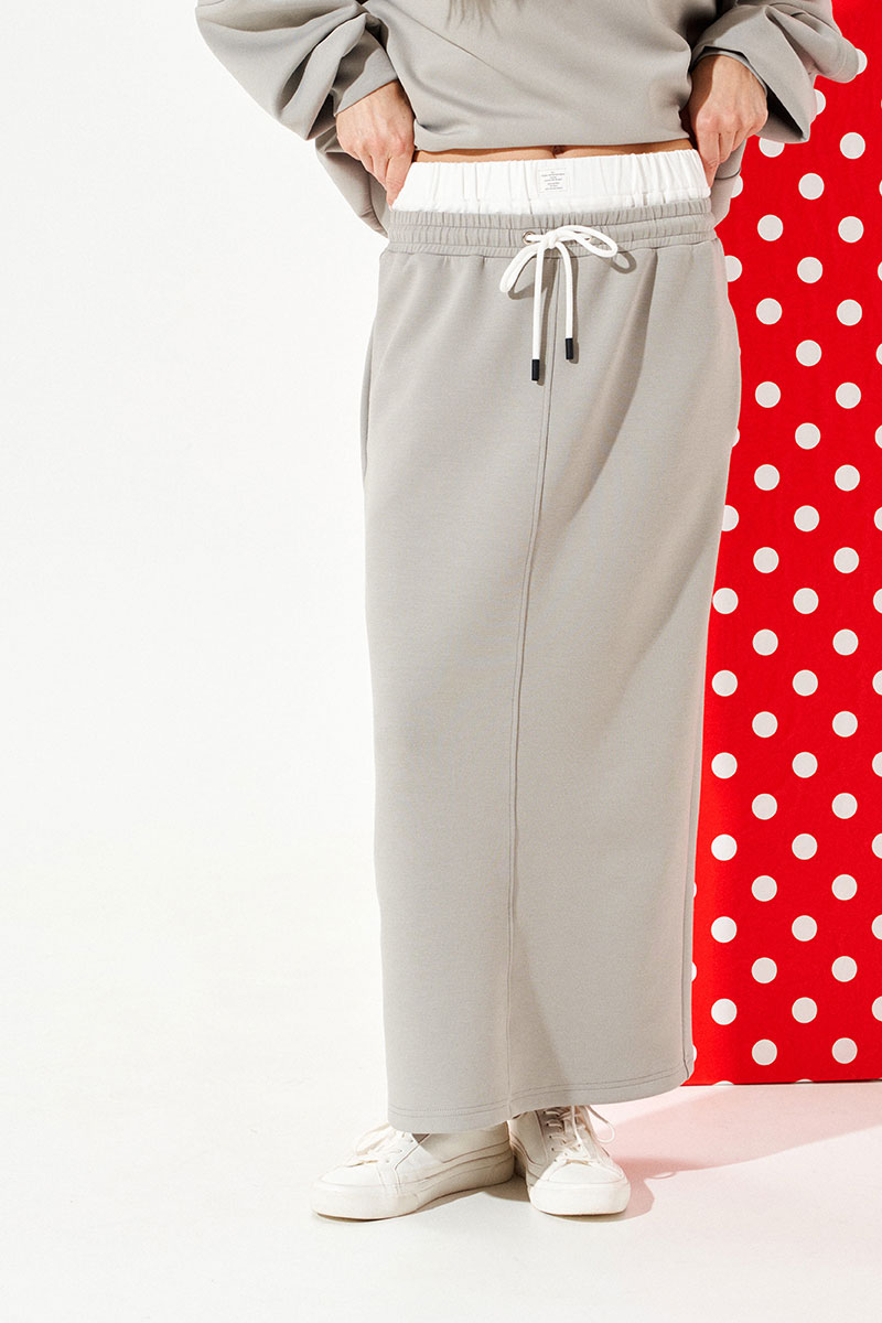 Юбка прямая, с двойным поясом. Переднее и заднее полотнища со средним швом. Средний шов спинки заканчивается разрезом. Пояс притачной, на резинке, с отделочными строчками, образующими канал, в который через люверсы продет декоративный шнур с наконечниками. Верхний пояс на резинке с декоративной нашивкой.