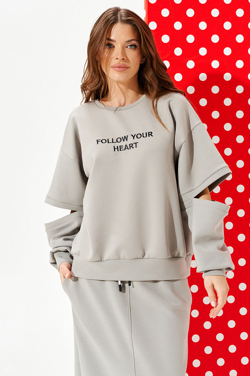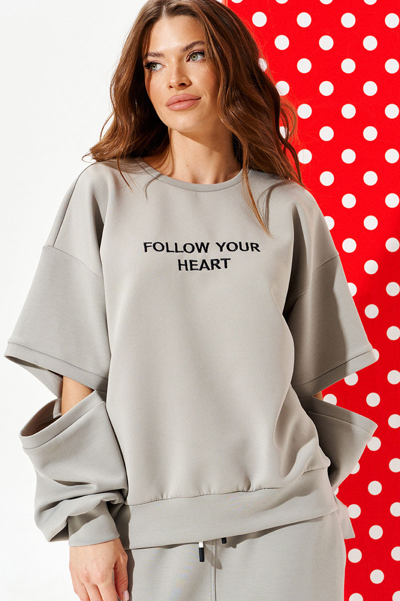 Свитшот свободного объема, прямого силуэта, с круглым вырезом горловины. Перед и спинка цельные. Перед с вышивкой «Follow your heart». Рукав втачной, длинный, с разрезом на уровне локтя, обработанный притачными планками. Нижний срез свитшота и рукава обработаны притачной манжетой.