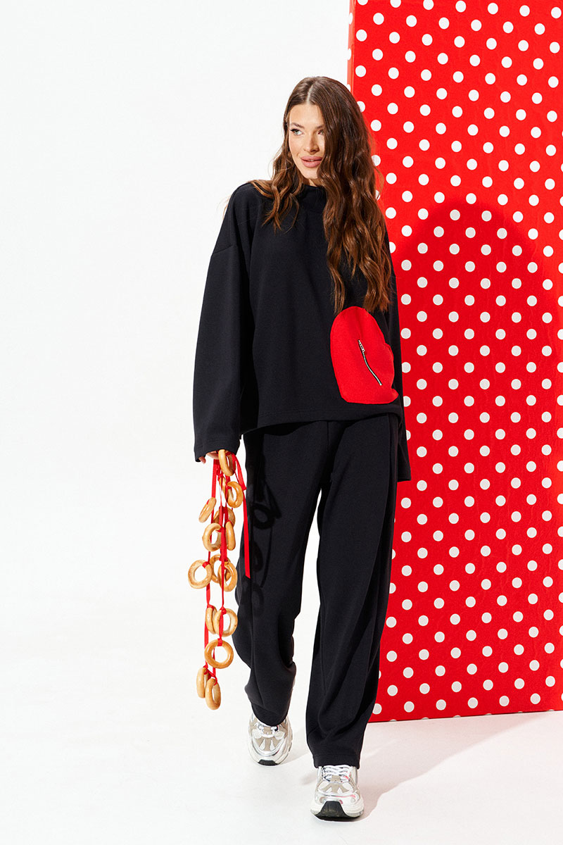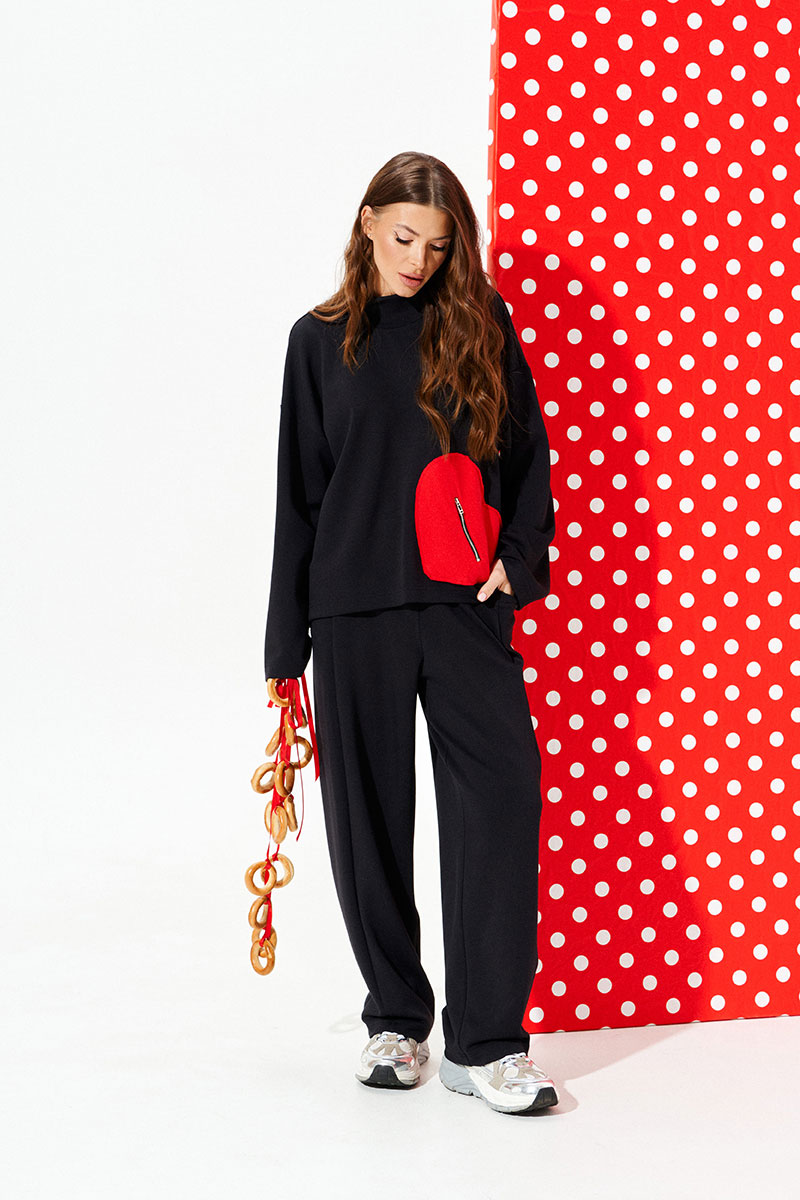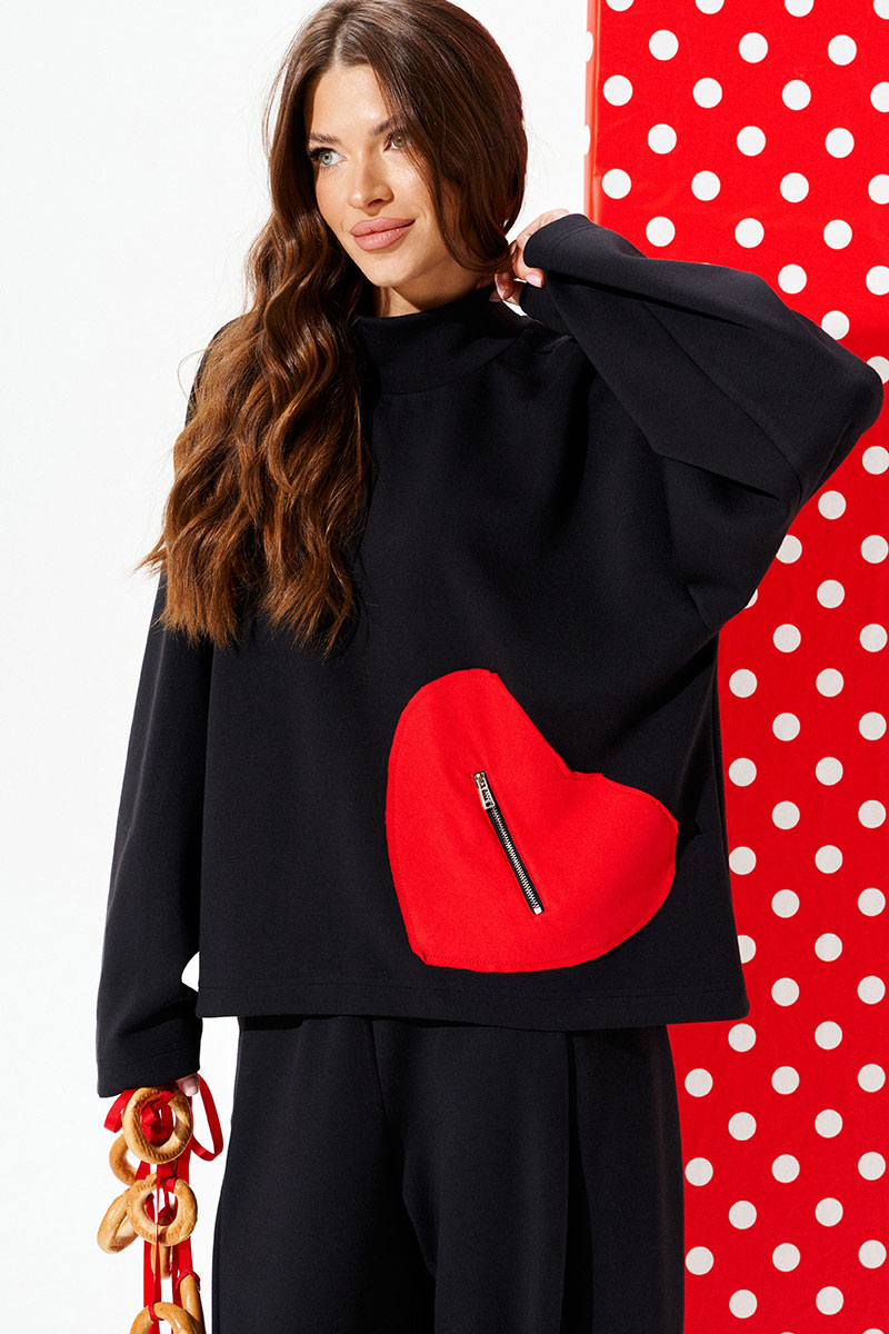 Джемпер свободного объема, прямого силуэта. Воротник-стойка. Перед и спинка цельные. Перед с декоративным карманом в виде сердца из контрастного материала с застежкой на тесьму-молнию. Рукав втачной, одношовный, длинный.