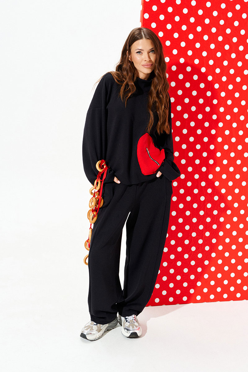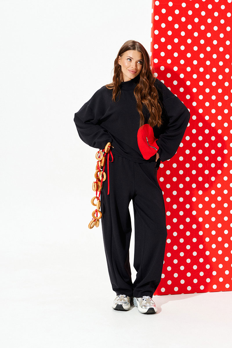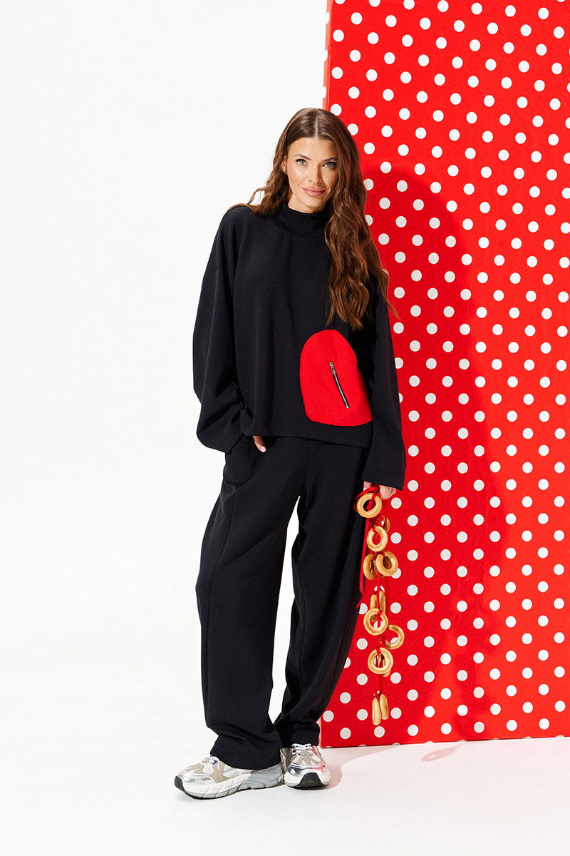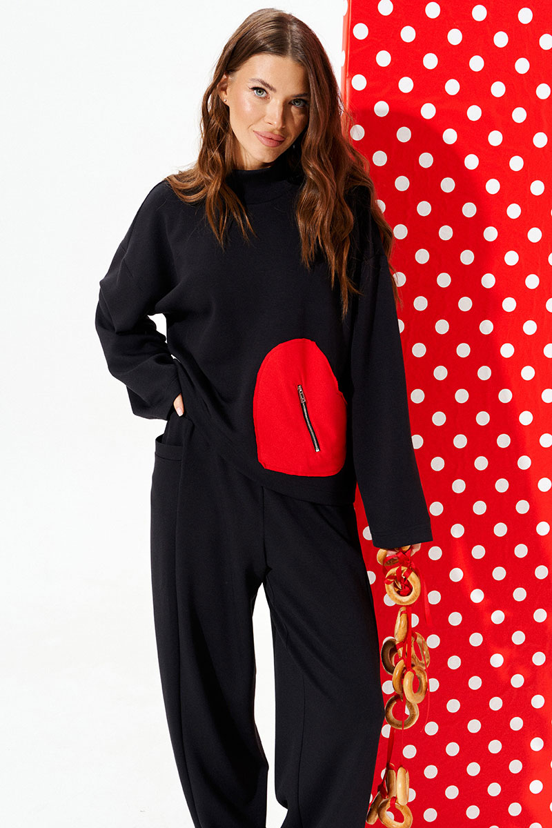 Джемпер свободного объема, прямого силуэта. Воротник-стойка. Перед и спинка цельные. Перед с декоративным карманом в виде сердца из контрастного материала с застежкой на тесьму-молнию. Рукав втачной, одношовный, длинный.