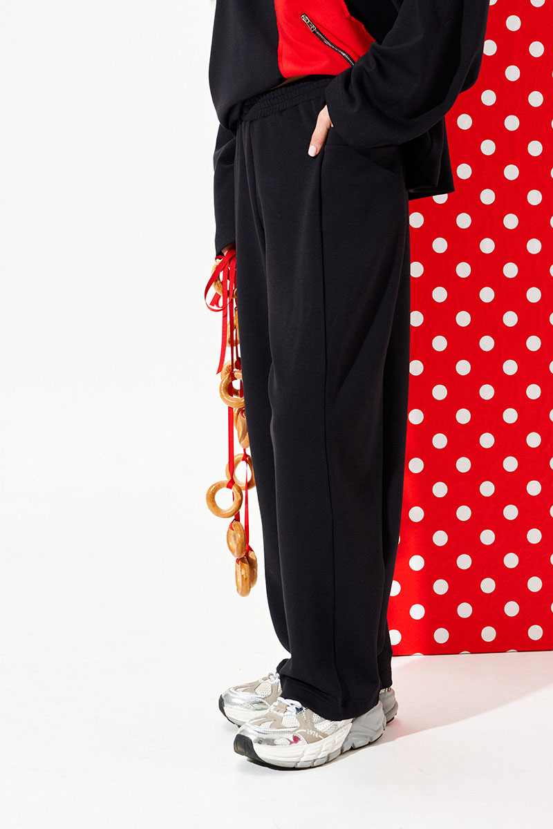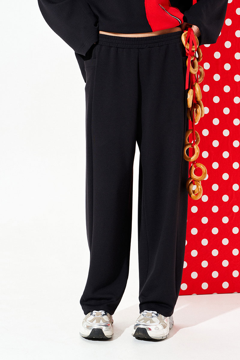 Брюки свободного объема, слегка заужены к низу. Пояс притачной, на резинке, с отделочными строчками. Брюки с отрезной боковой частью, в которой обработан карман.