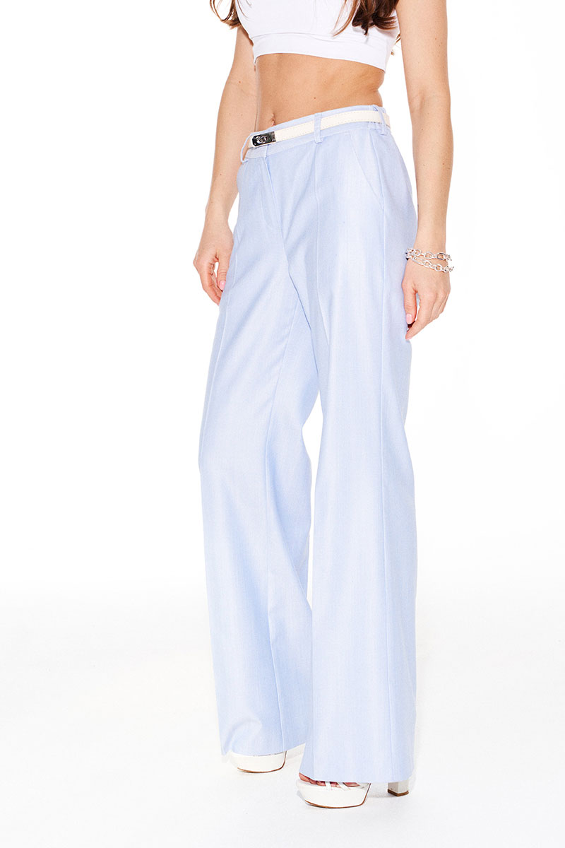 Брюки умеренного объема, прямого силуэта. На передних и задних половинках заутюжены стрелки. На передних половинках выполнены боковые карманы с отрезным бочком. Задние половинки с