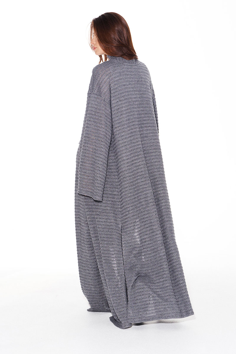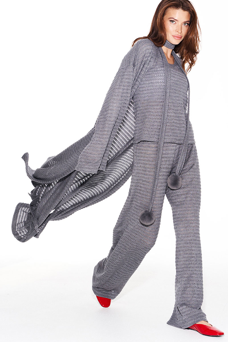 Кардиган свободного объема, прямого силуэта, со съемным поясом из основной ткани. Пояс декорирован пришивными помпонами. Вырез горловины и борта обработаны цельнокроеной планкой. Боковые швы заканчиваются разрезами. Рукав втачной, широкий, длинный.