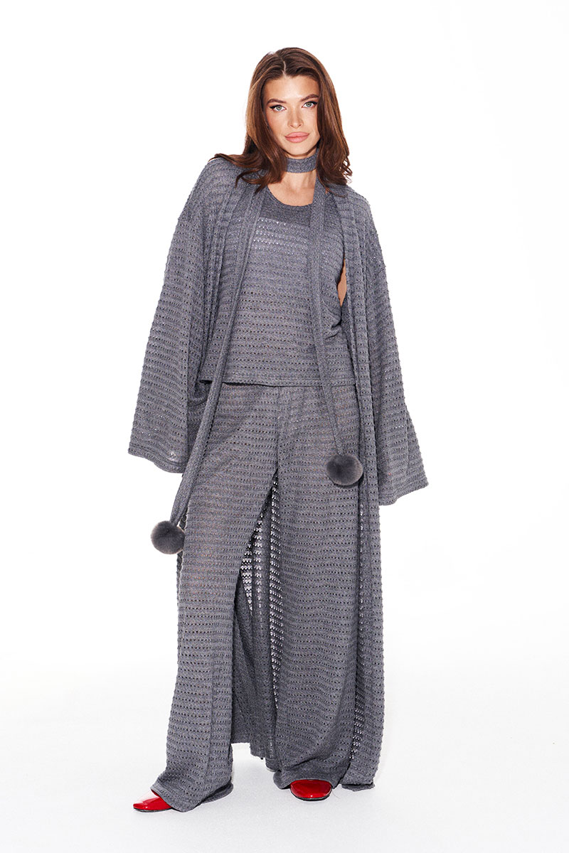 Костюм женский 3-предметный из трикотажного полотна, состоящий из топа, брюк и кардигана.