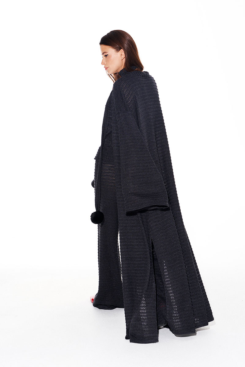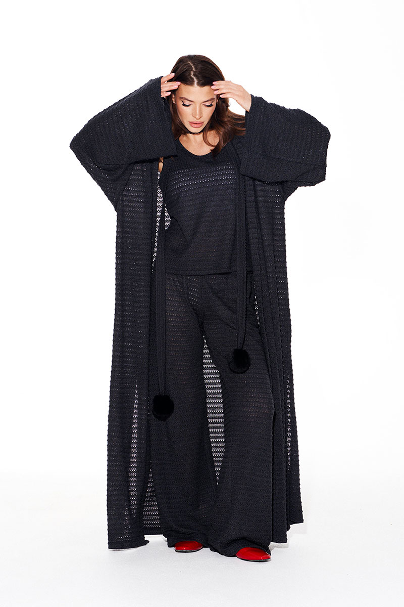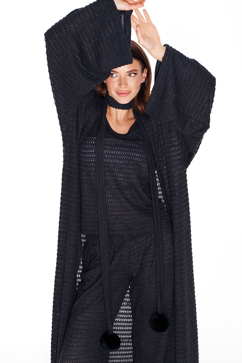Кардиган свободного объема, прямого силуэта, со съемным поясом из основной ткани. Пояс декорирован пришивными помпонами. Вырез горловины и борта обработаны цельнокроеной планкой. Боковые швы заканчиваются разрезами. Рукав втачной, широкий, длинный.